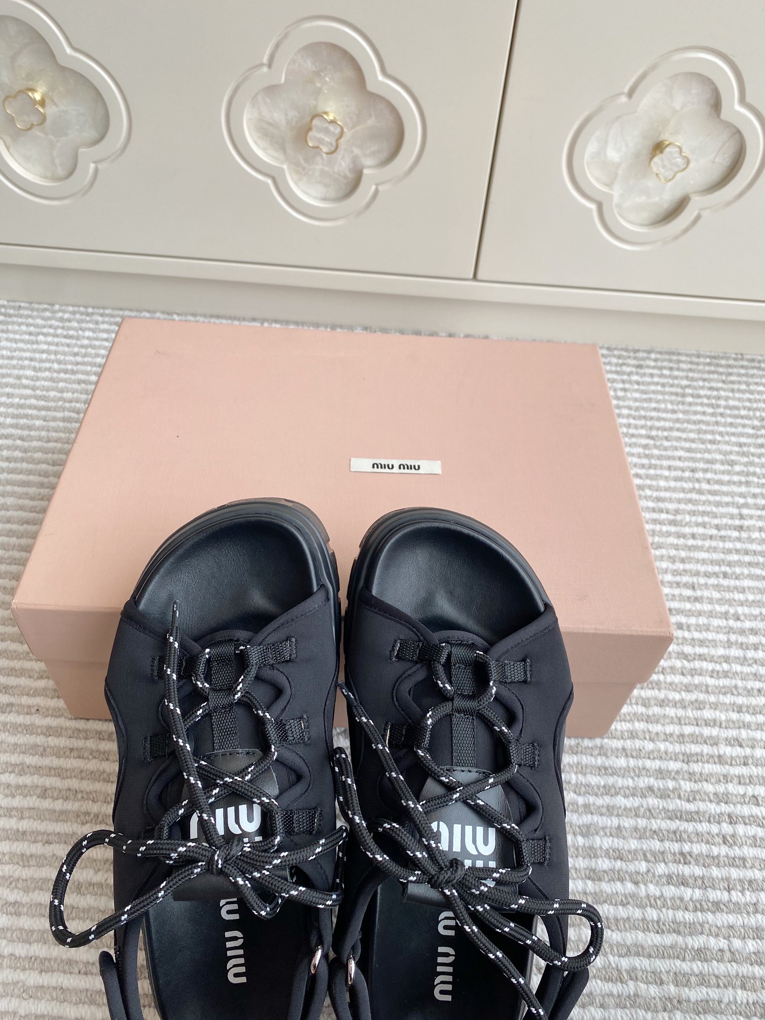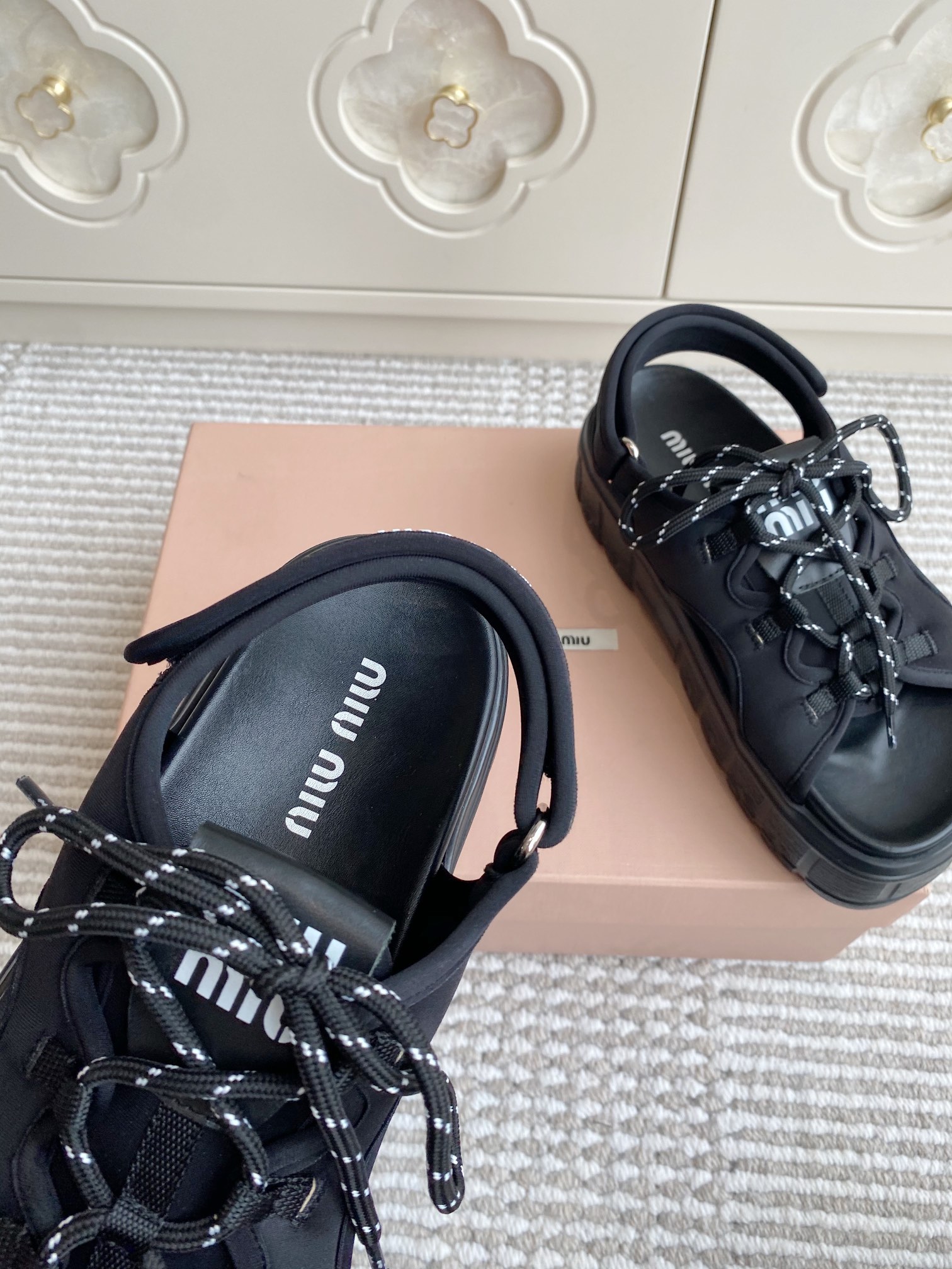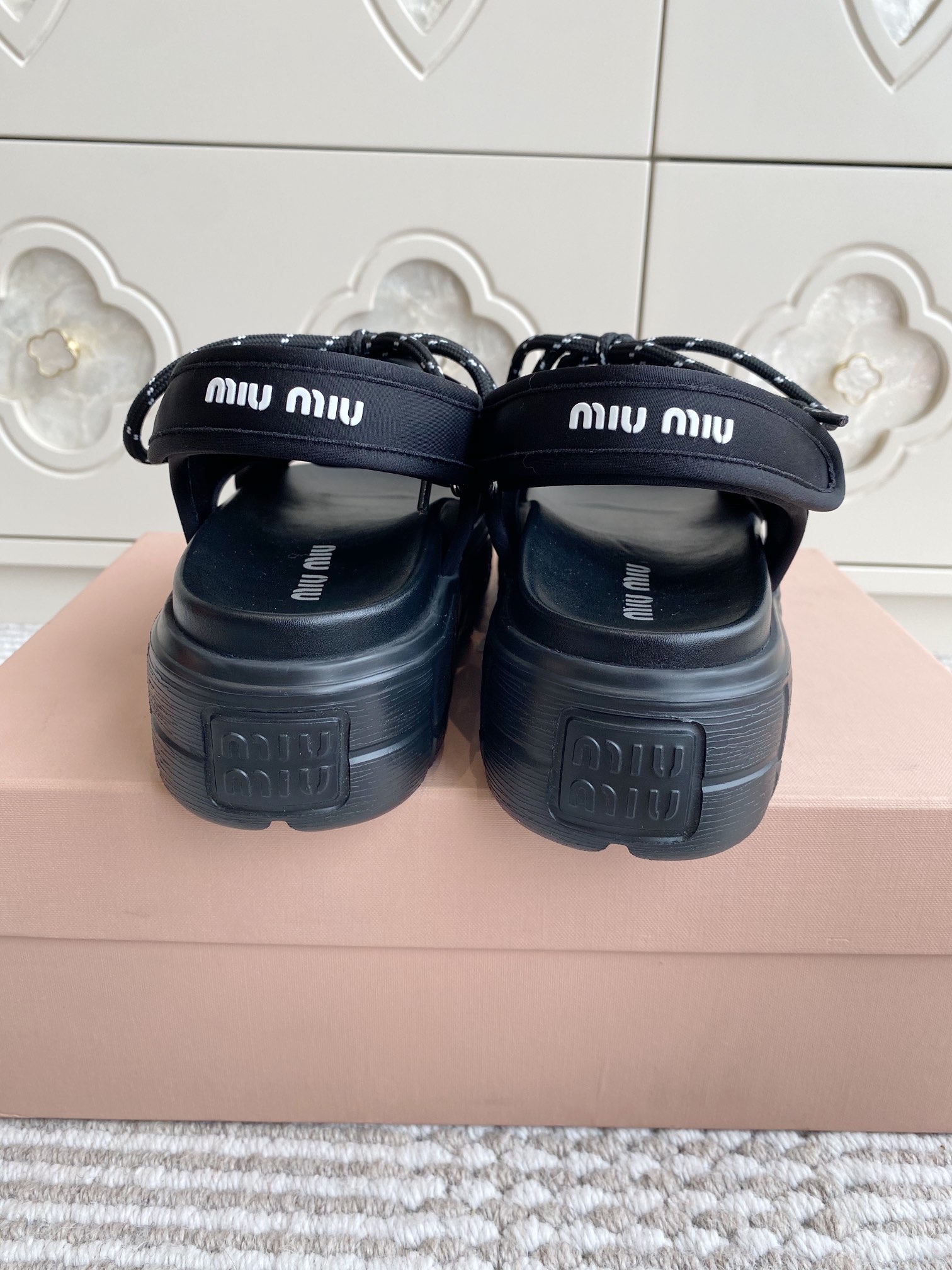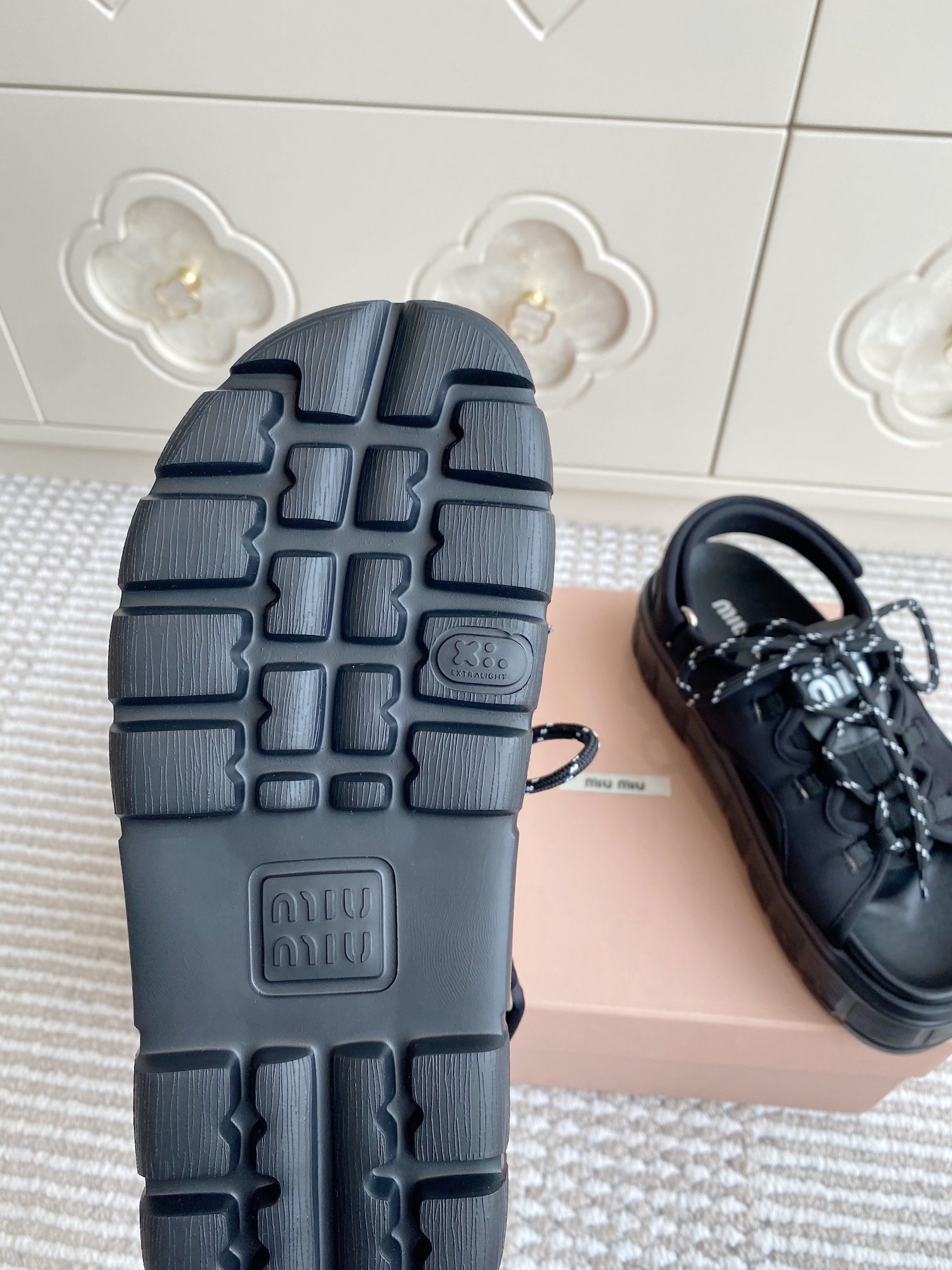 這款鞋子是AAAAA 1:1 質量(非常棒). 使用了和原版一模一樣的材料. 商標部分也保持了和繆繆/Miu Miu一樣. 圖片拍攝是實物鞋子拍攝, 您所收到的實物保證和我們圖片一模一樣.