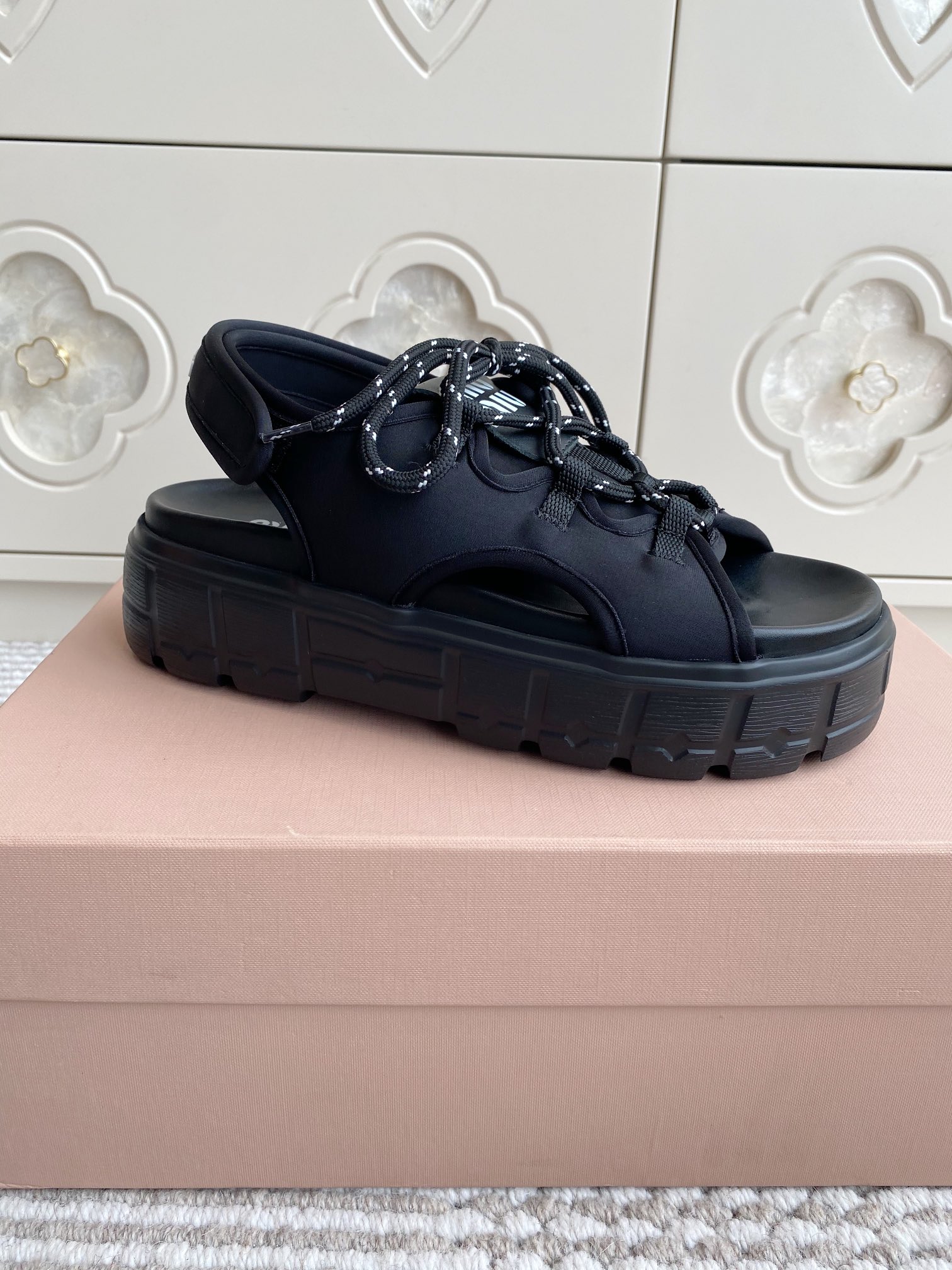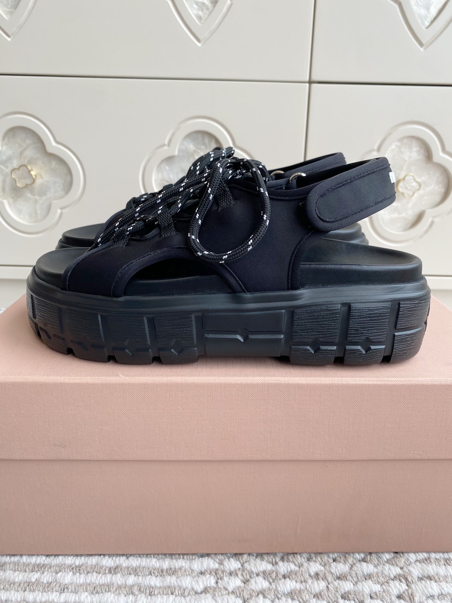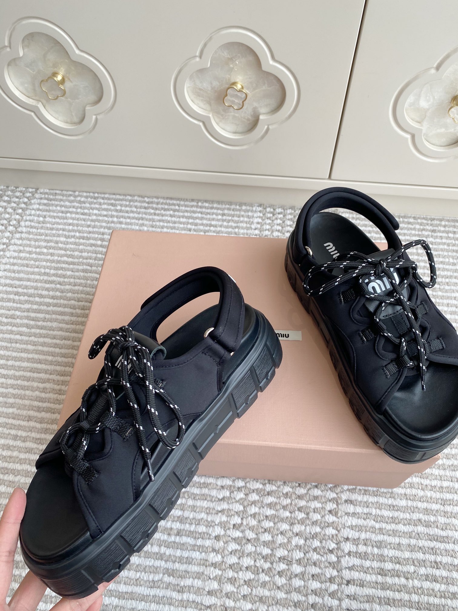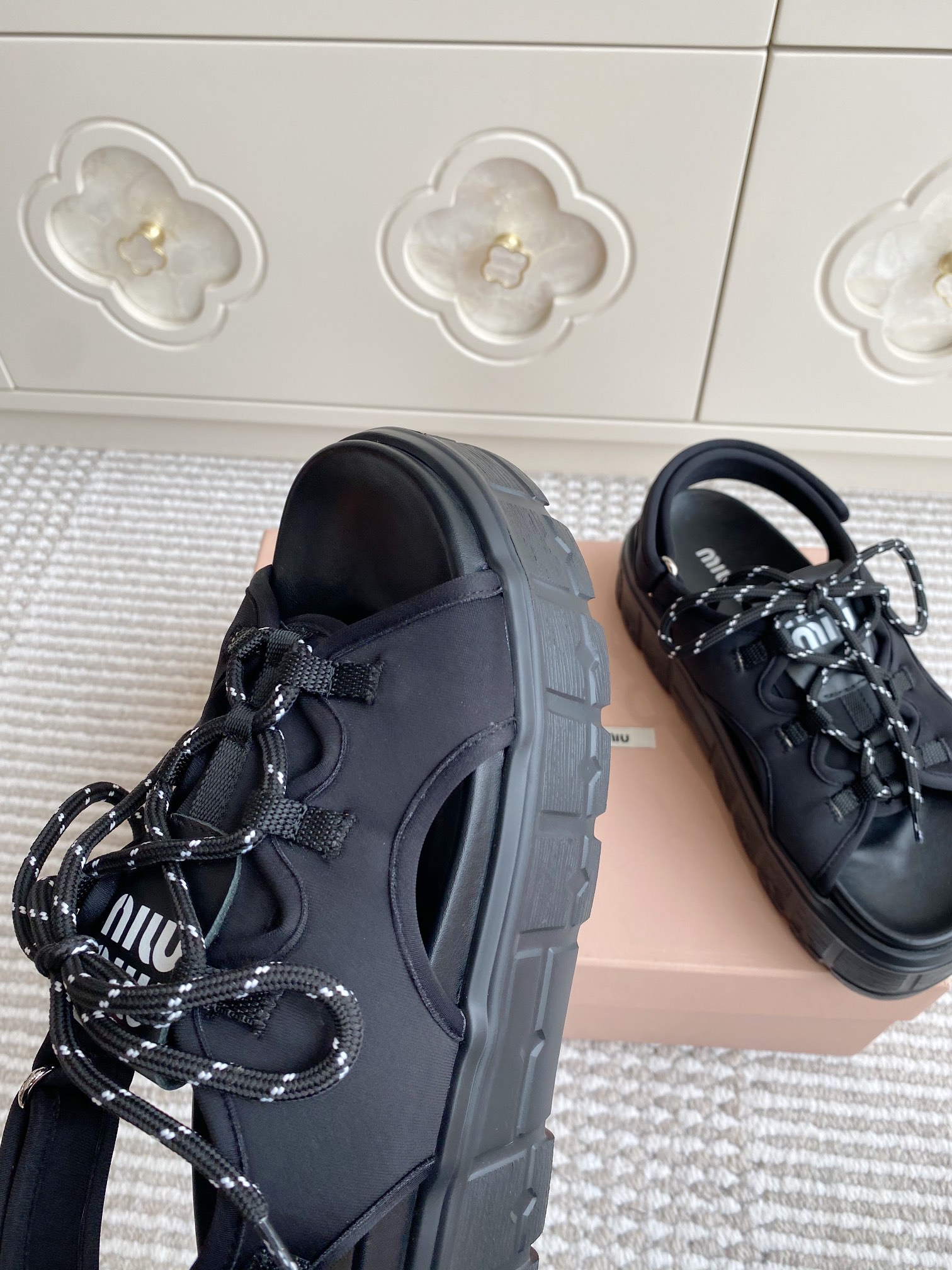 這款鞋子是AAAAA 1:1 質量(非常棒). 使用了和原版一模一樣的材料. 商標部分也保持了和繆繆/Miu Miu一樣. 圖片拍攝是實物鞋子拍攝, 您所收到的實物保證和我們圖片一模一樣.