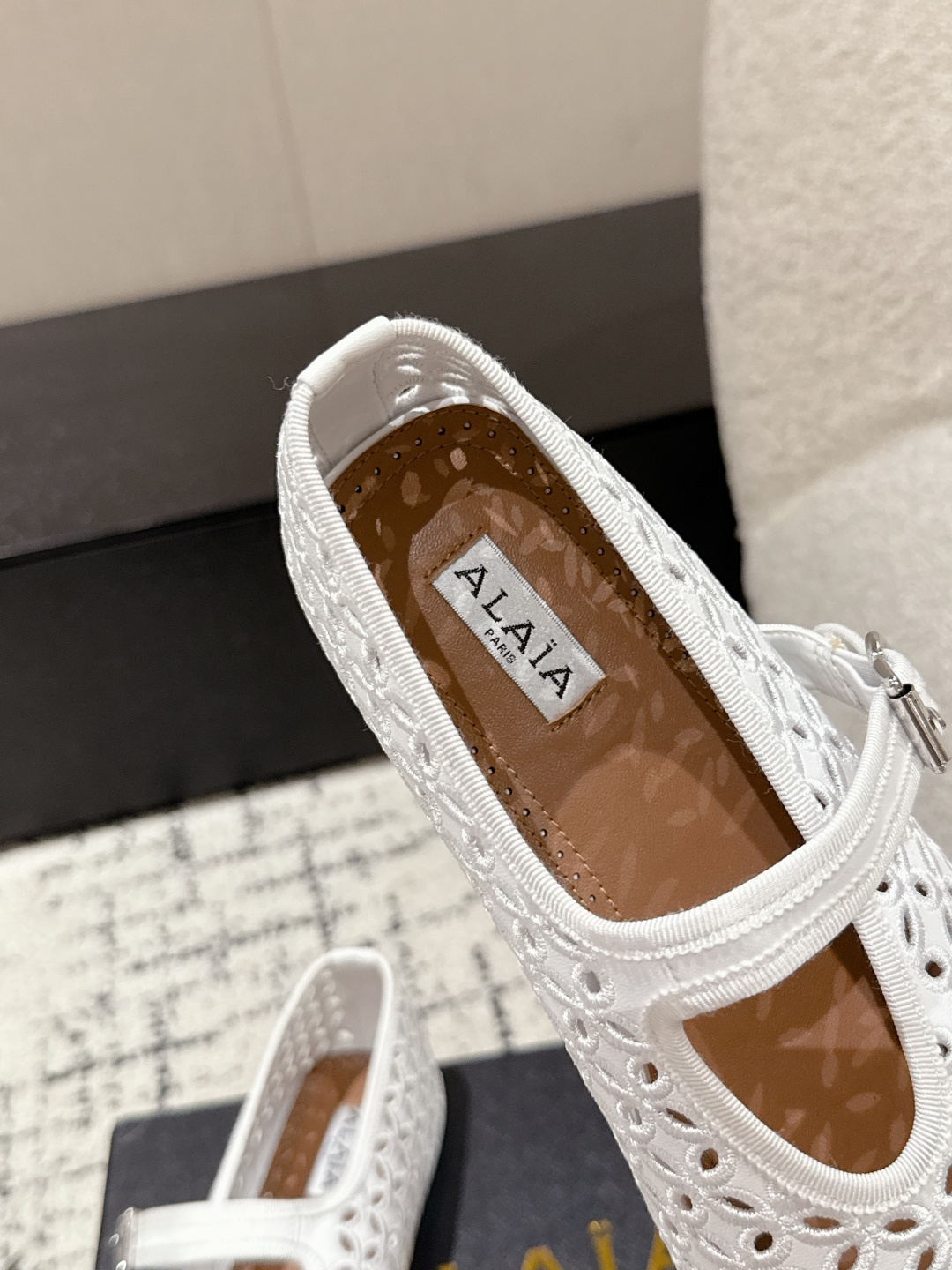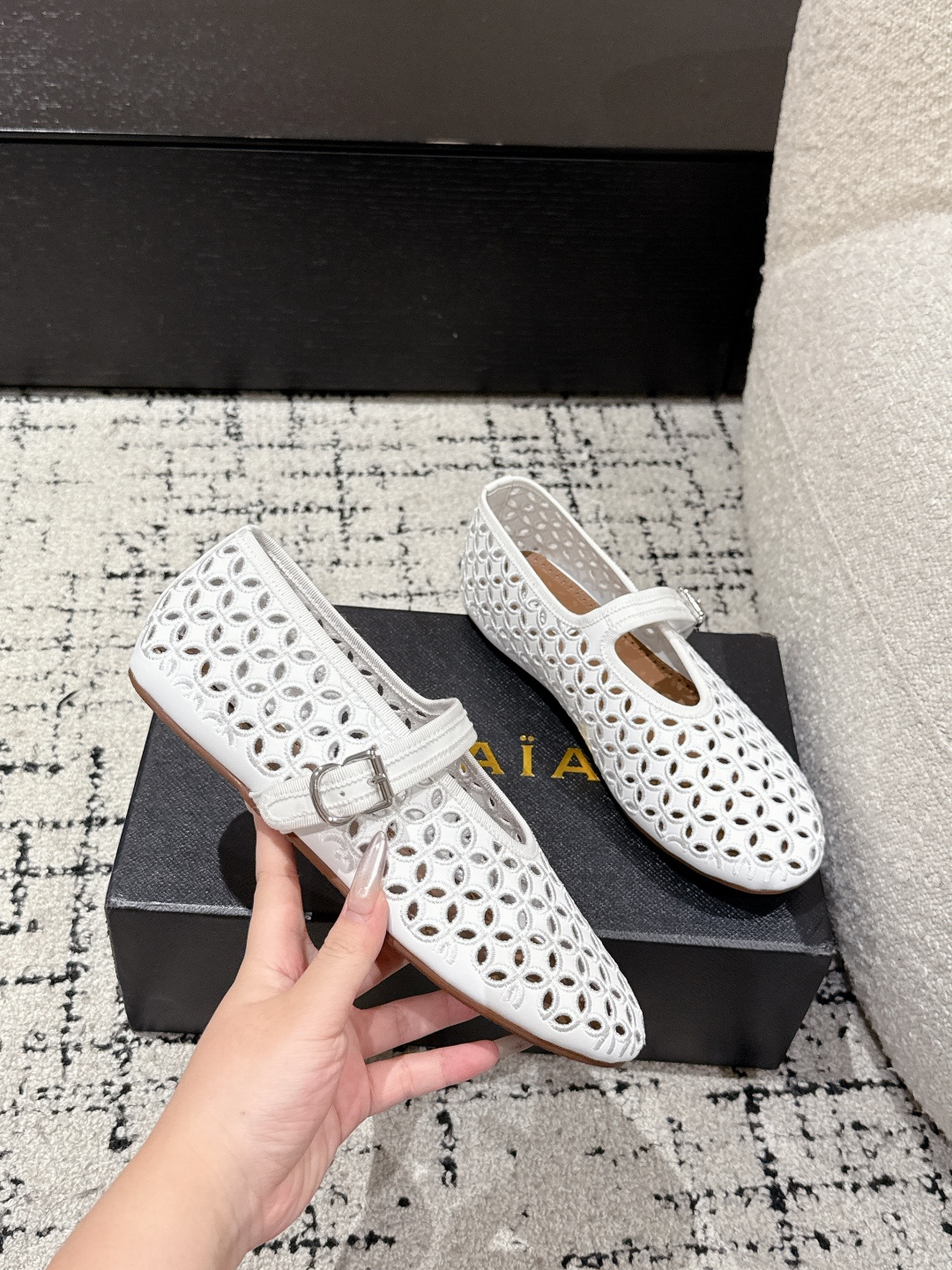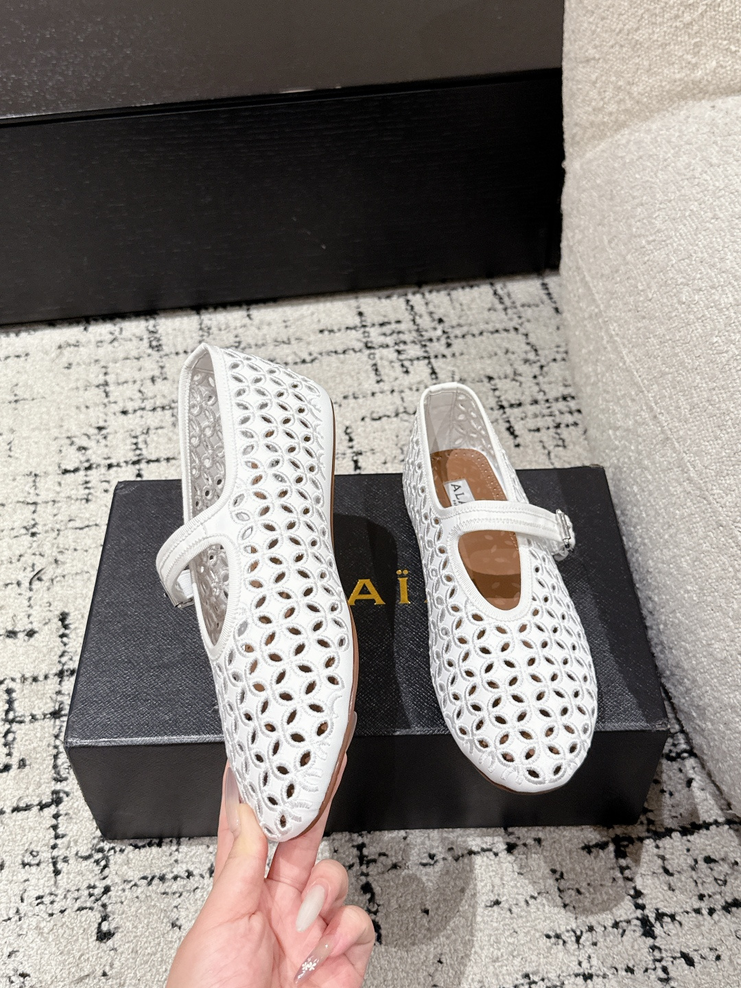 這款鞋子是AAAAA 1:1 質量(非常棒). 使用了和原版一模一樣的材料. 商標部分也保持了和Alaia一樣. 圖片拍攝是實物鞋子拍攝, 您所收到的實物保證和我們圖片一模一樣.
