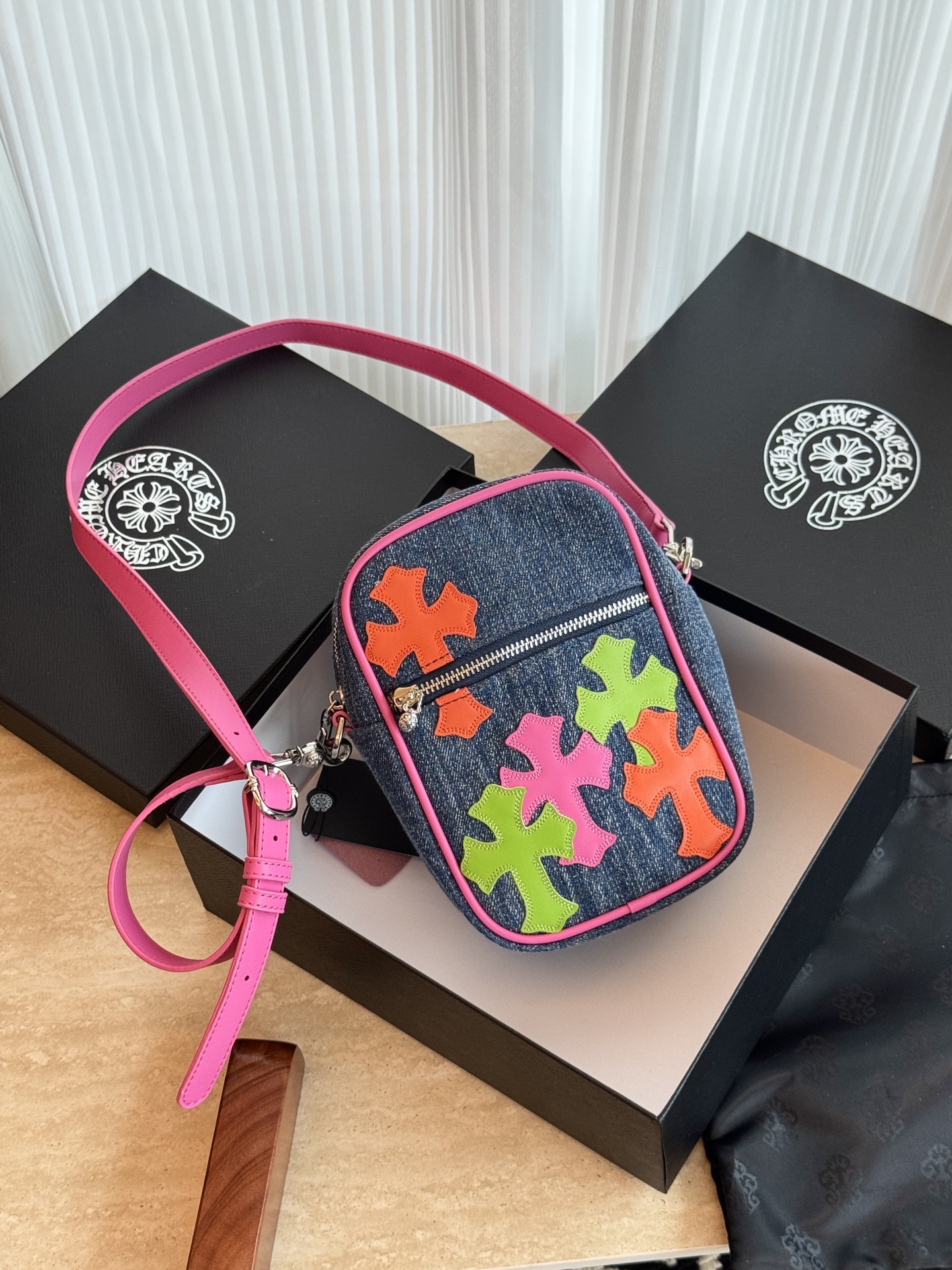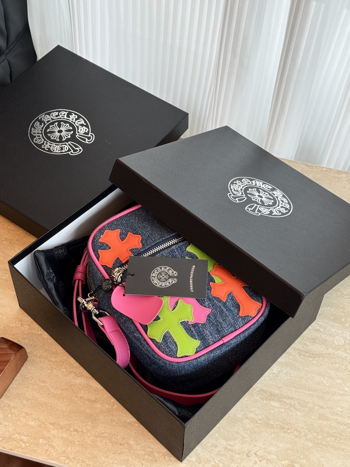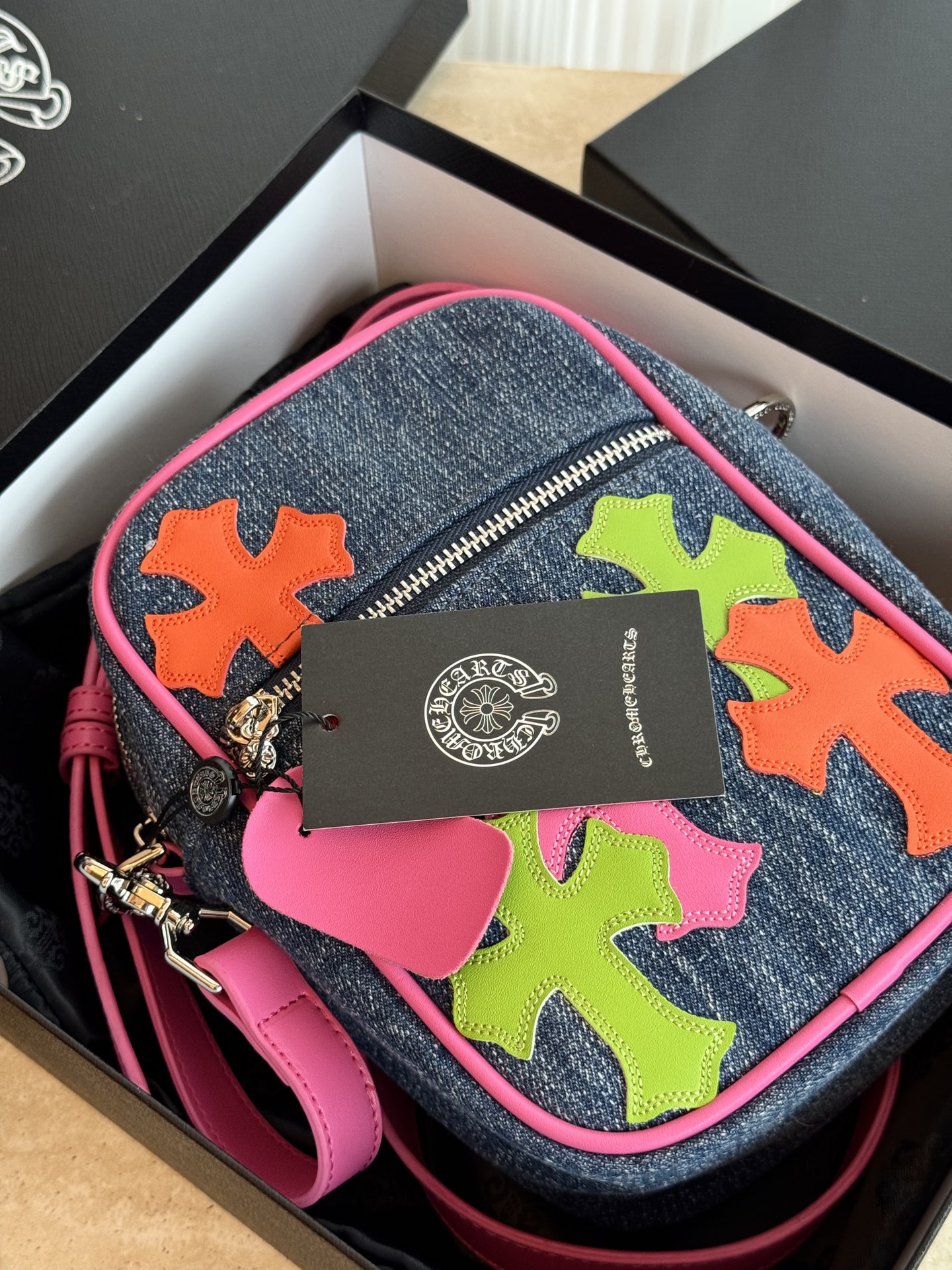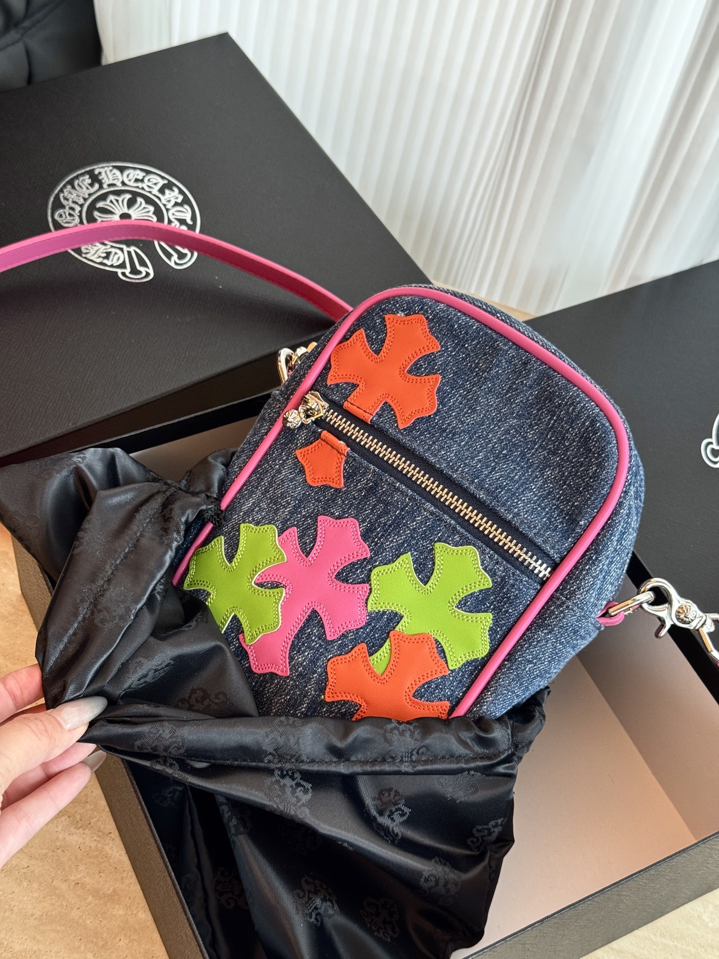 這款包包是AAAAA 1:1 質量(非常棒). 使用了和原版一模一樣的材料. 商標部分也保持了和鉻心/Chrome Hearts一樣. 圖片拍攝是實物包包拍攝, 您所收到的實物保證和我們圖片一模一樣.