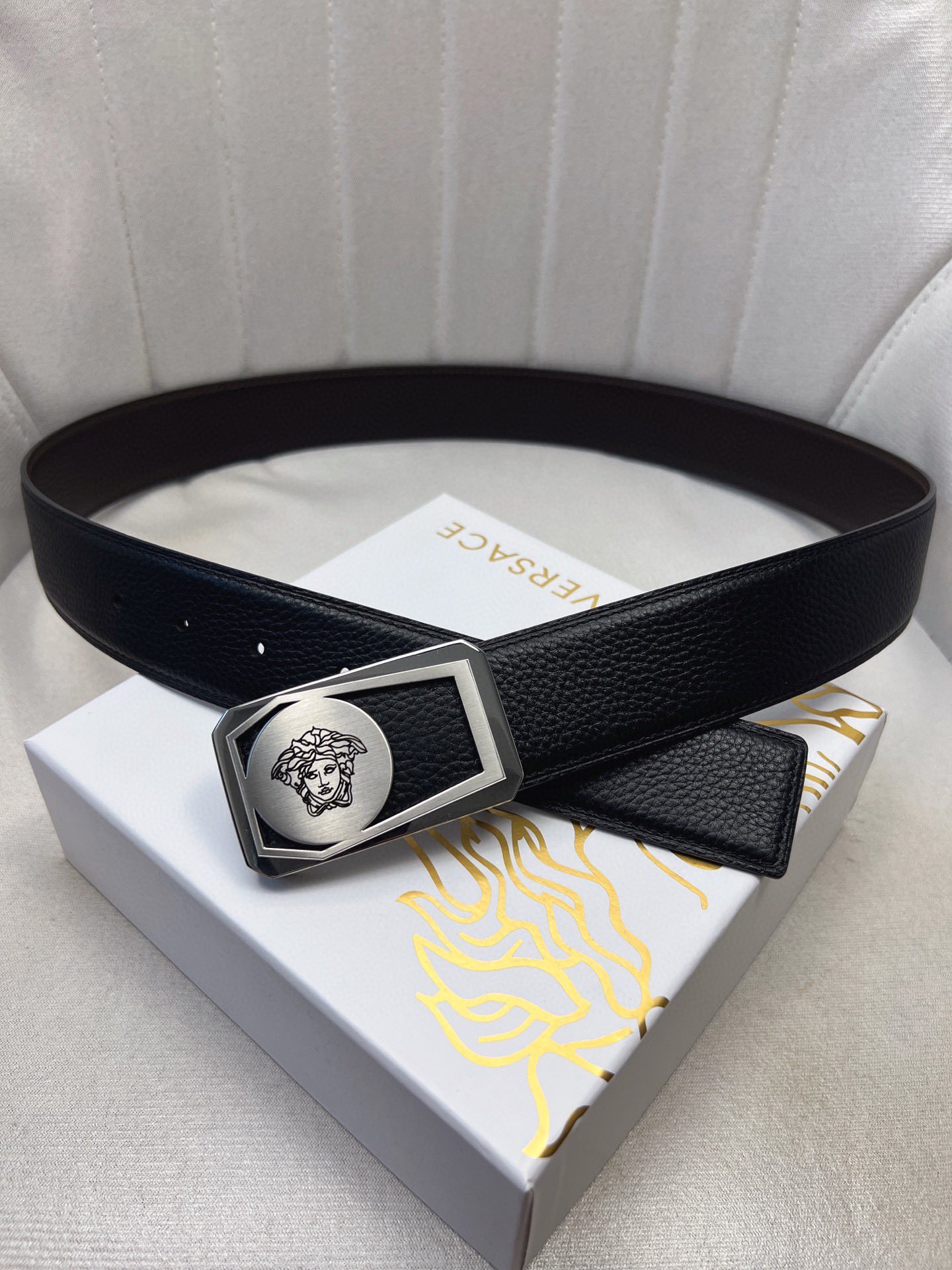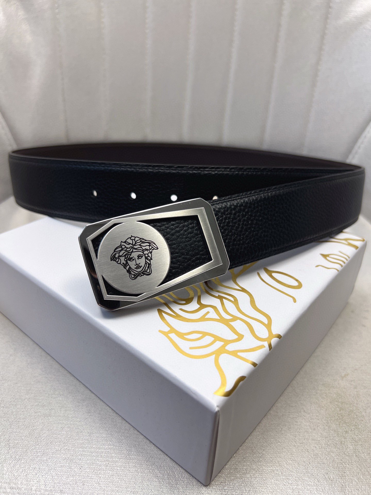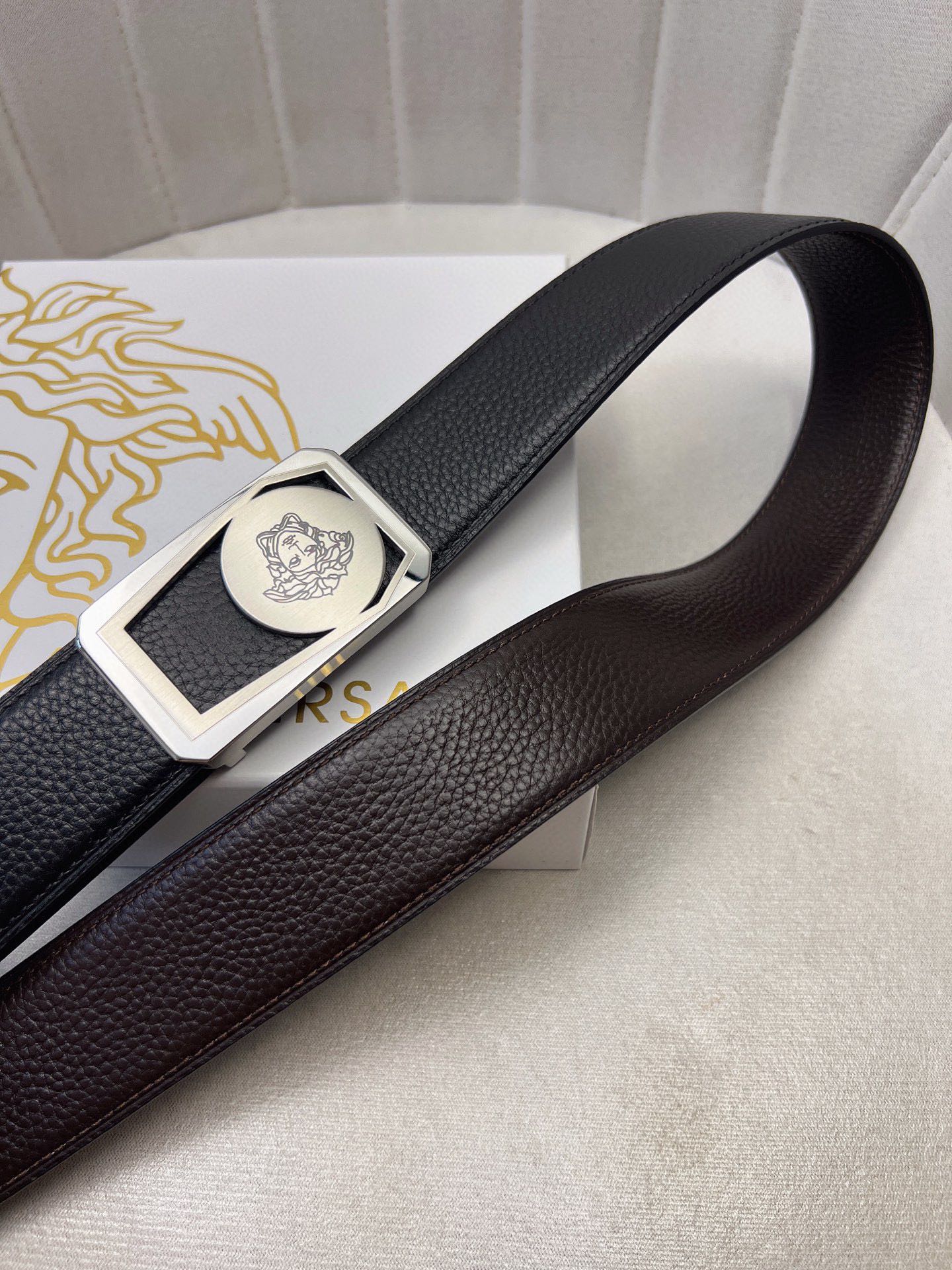 這款皮帶是AAAAA 1:1 質量(非常棒). 使用了和原版一模一樣的材料. 商標部分也保持了和范思哲/Versace一樣. 圖片拍攝是實物皮帶拍攝, 您所收到的實物保證和我們圖片一模一樣.