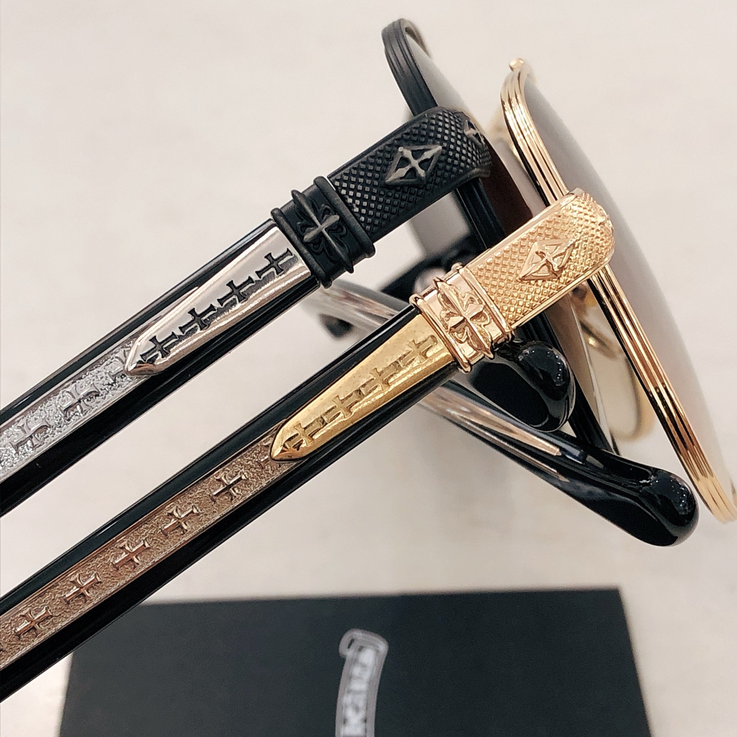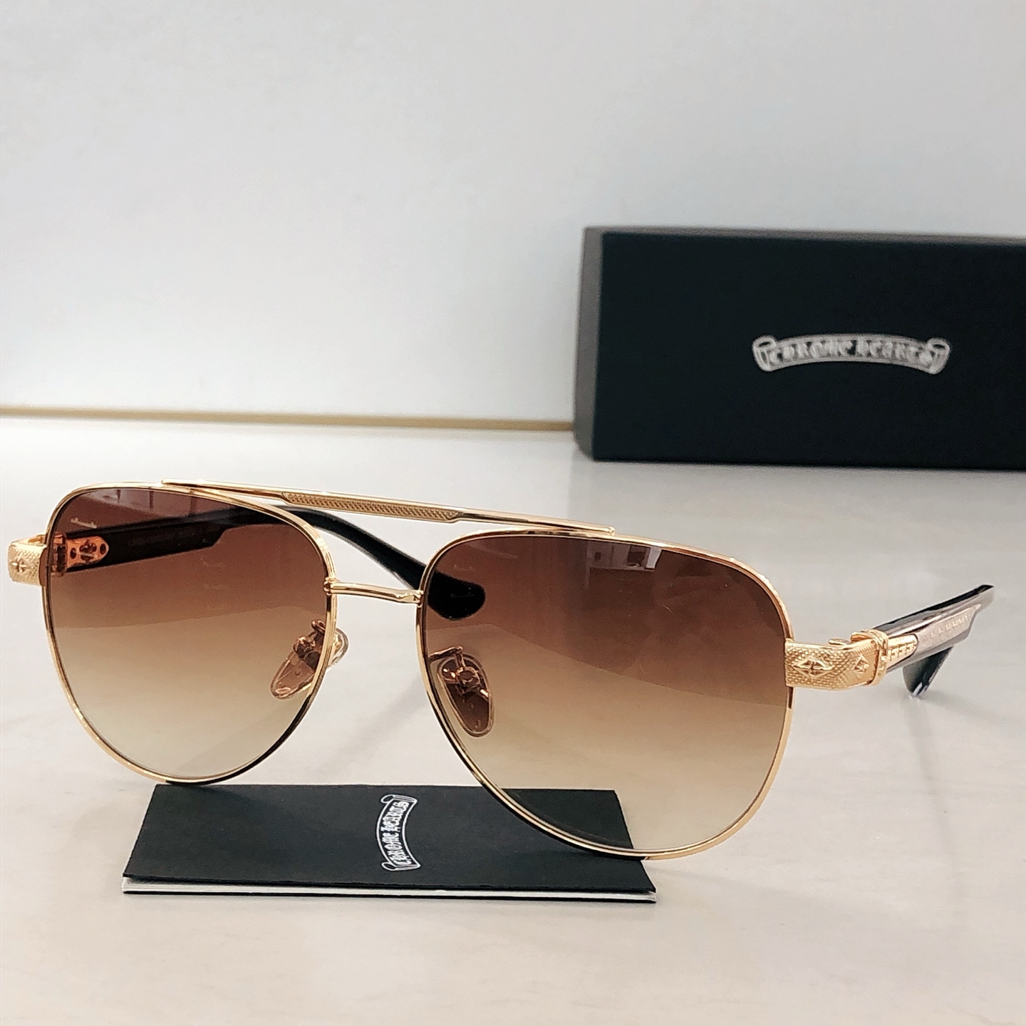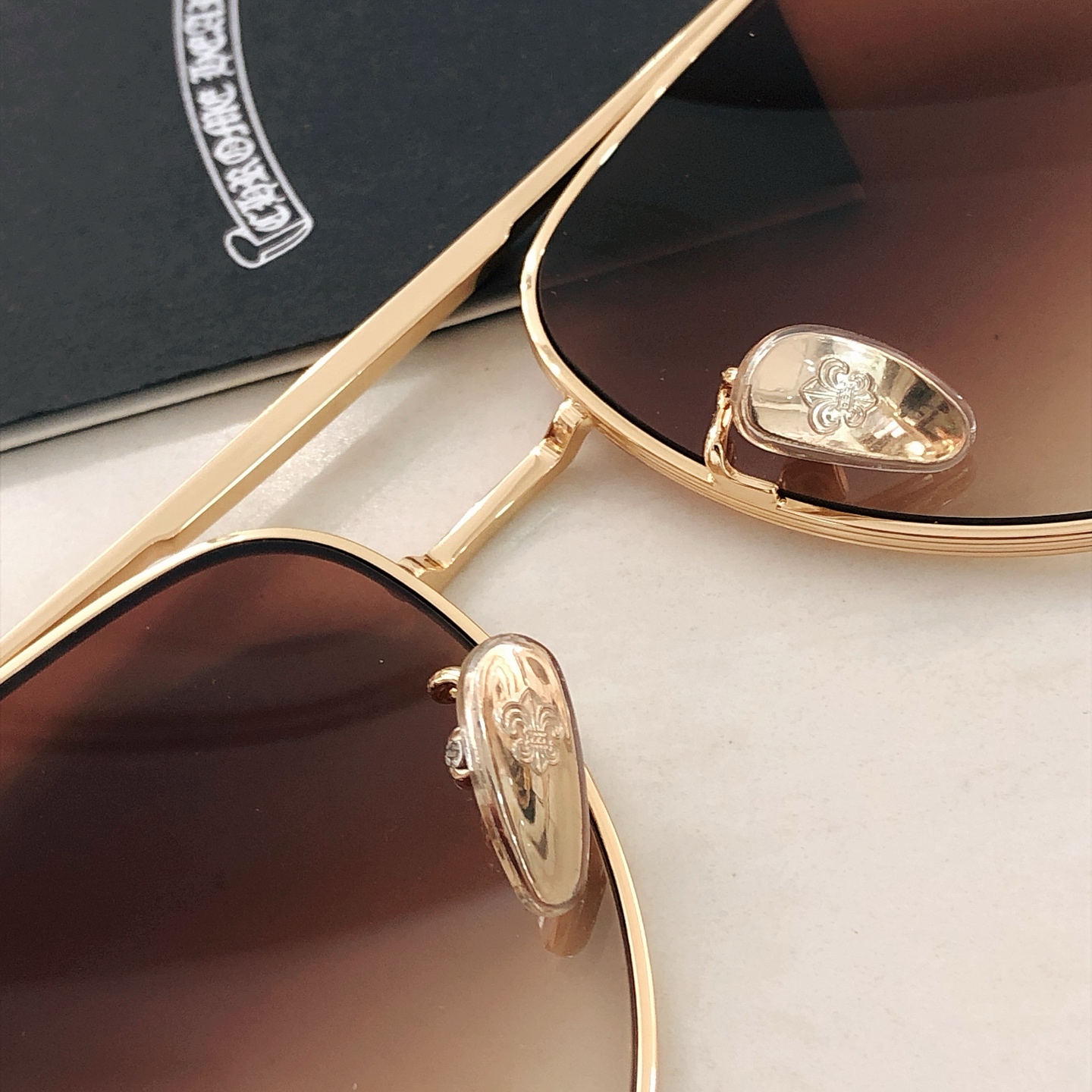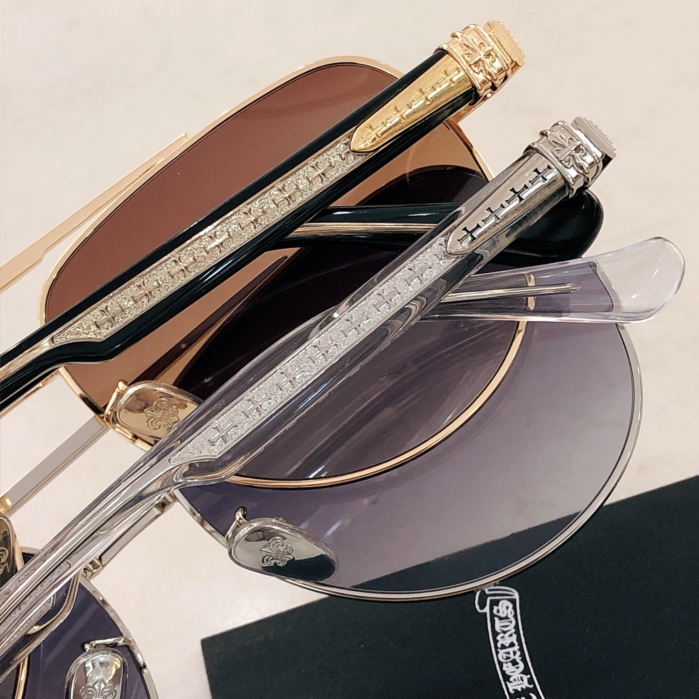 這款太陽眼鏡是AAAAA 1:1 質量(非常棒). 使用了和原版一模一樣的材料. 商標部分也保持了和鉻心/Chrome Hearts一樣. 圖片拍攝是實物太陽眼鏡拍攝, 您所收到的實物保證和我們圖片一模一樣.