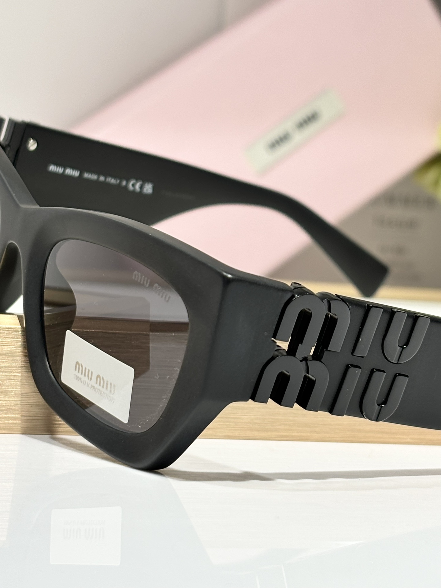 這款太陽眼鏡是AAAAA 1:1 質量(非常棒). 使用了和原版一模一樣的材料. 商標部分也保持了和繆繆/Miu Miu一樣. 圖片拍攝是實物太陽眼鏡拍攝, 您所收到的實物保證和我們圖片一模一樣.