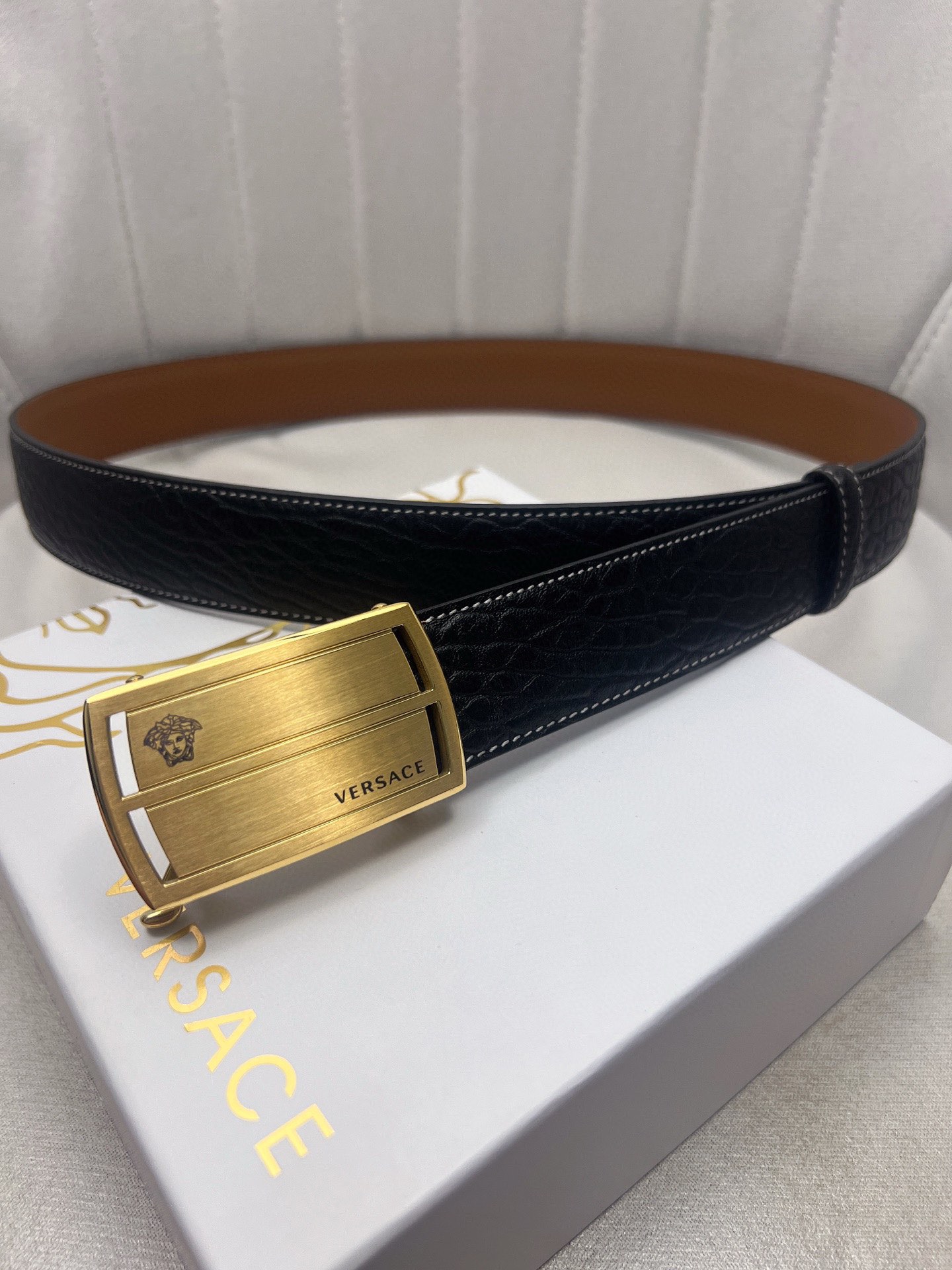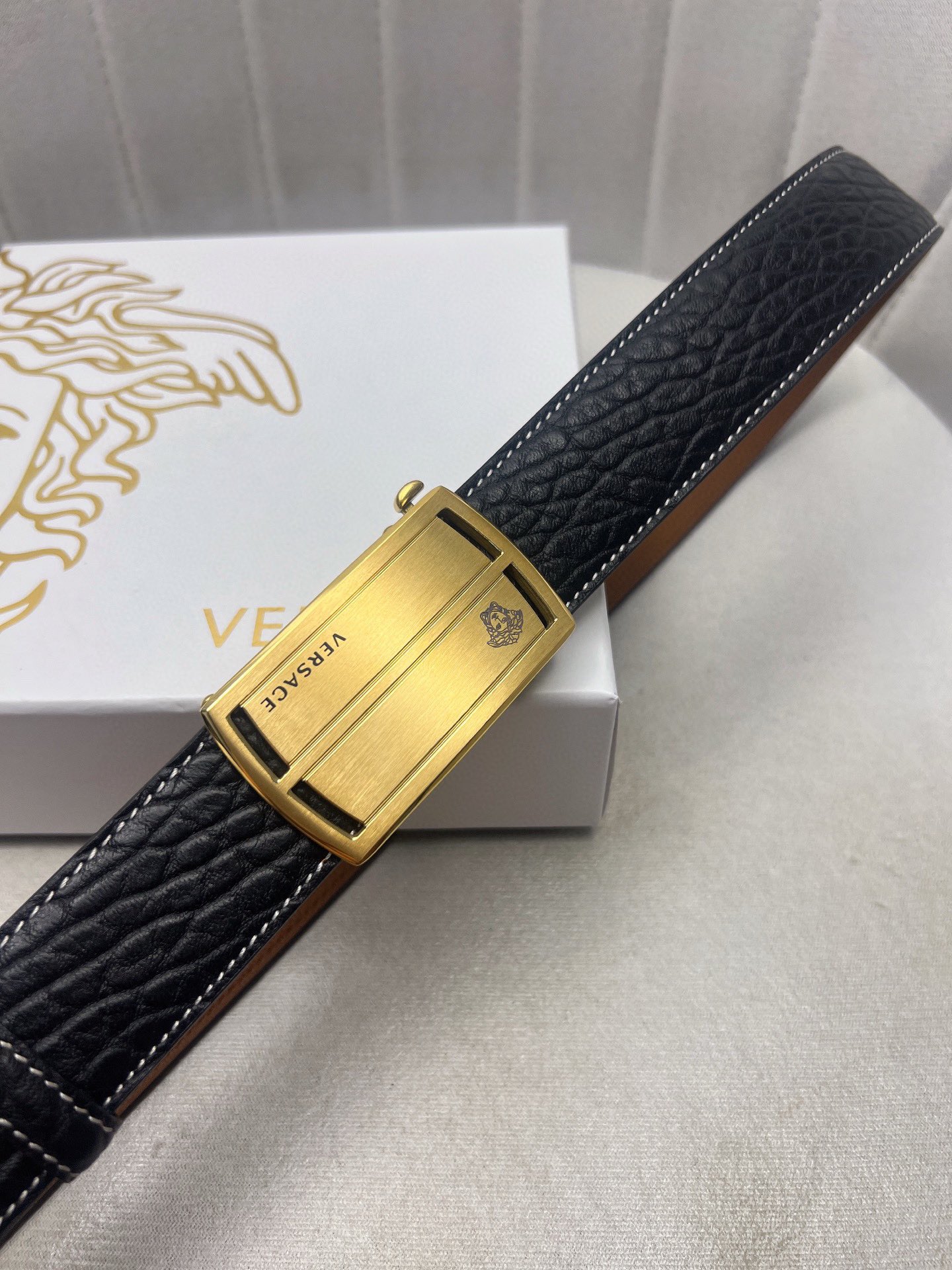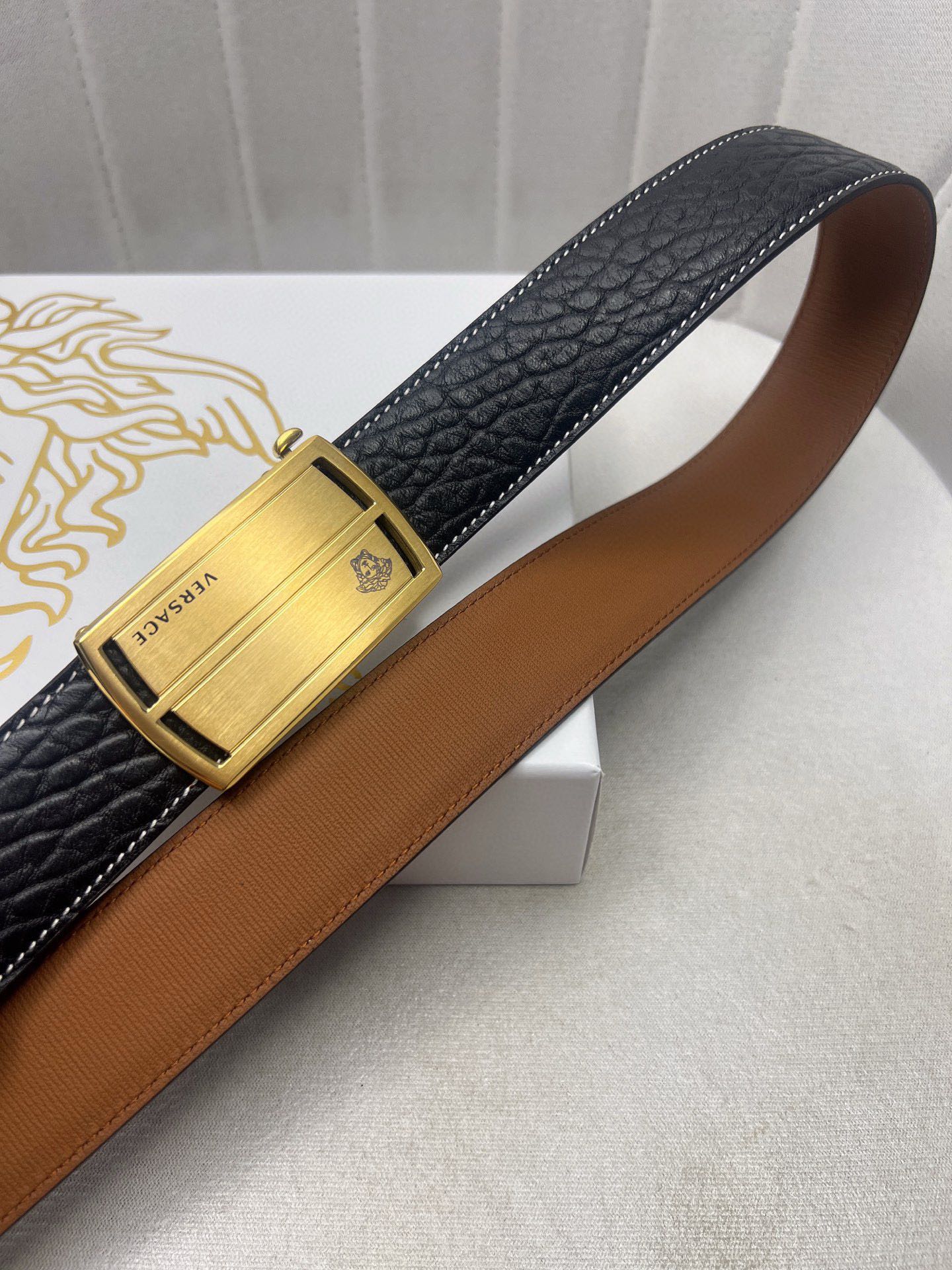 這款皮帶是AAAAA 1:1 質量(非常棒). 使用了和原版一模一樣的材料. 商標部分也保持了和范思哲/Versace一樣. 圖片拍攝是實物皮帶拍攝, 您所收到的實物保證和我們圖片一模一樣.