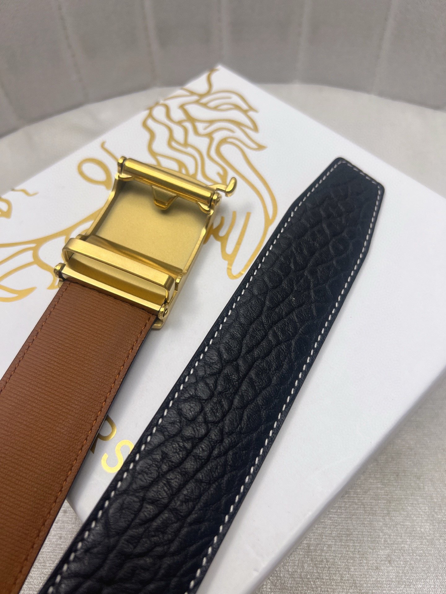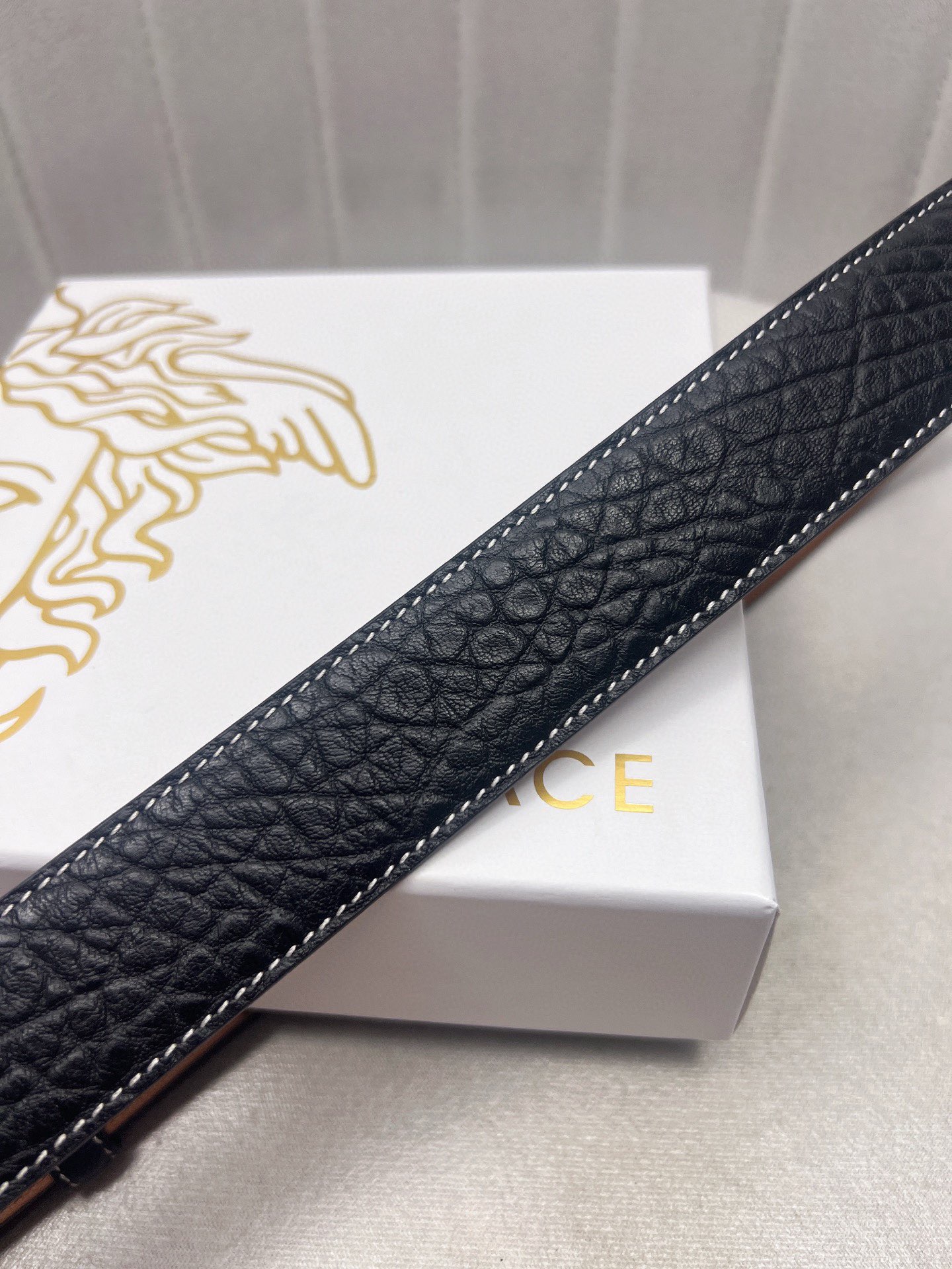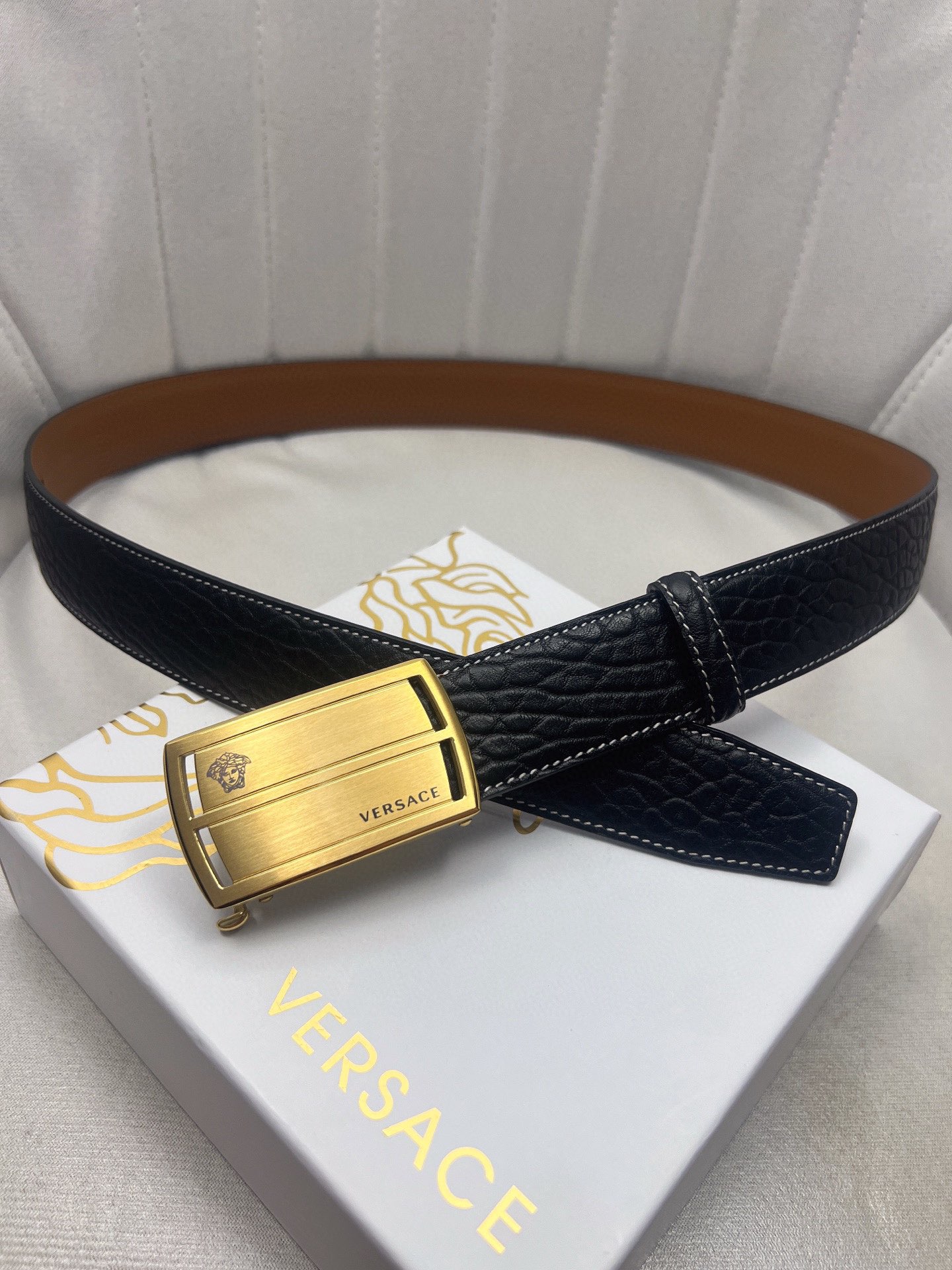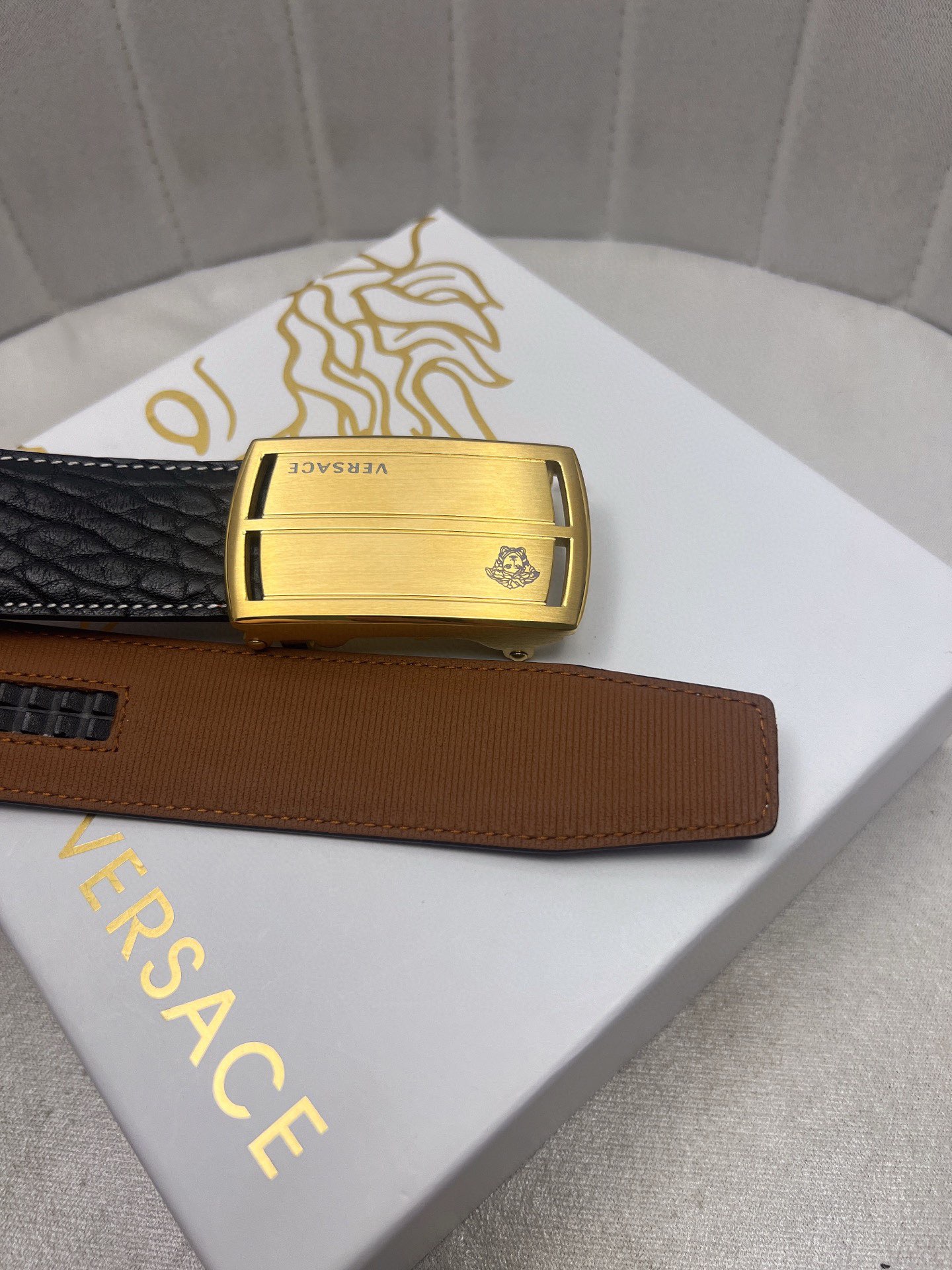 這款皮帶是AAAAA 1:1 質量(非常棒). 使用了和原版一模一樣的材料. 商標部分也保持了和范思哲/Versace一樣. 圖片拍攝是實物皮帶拍攝, 您所收到的實物保證和我們圖片一模一樣.