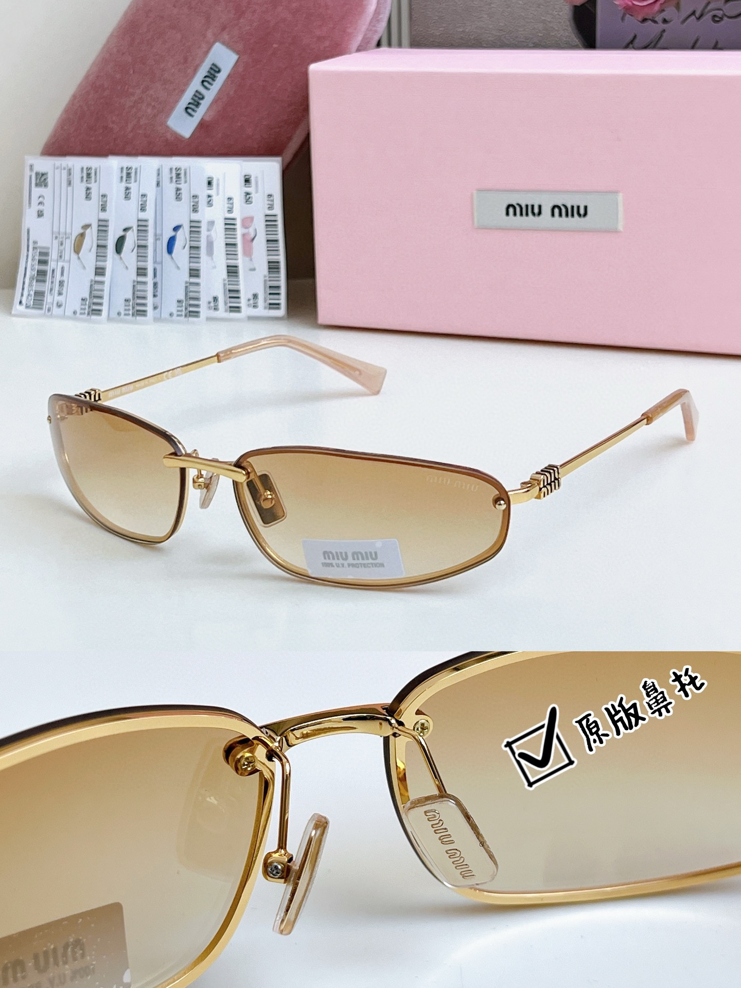 這款太陽眼鏡是AAAAA 1:1 質量(非常棒). 使用了和原版一模一樣的材料. 商標部分也保持了和繆繆/Miu Miu一樣. 圖片拍攝是實物太陽眼鏡拍攝, 您所收到的實物保證和我們圖片一模一樣.