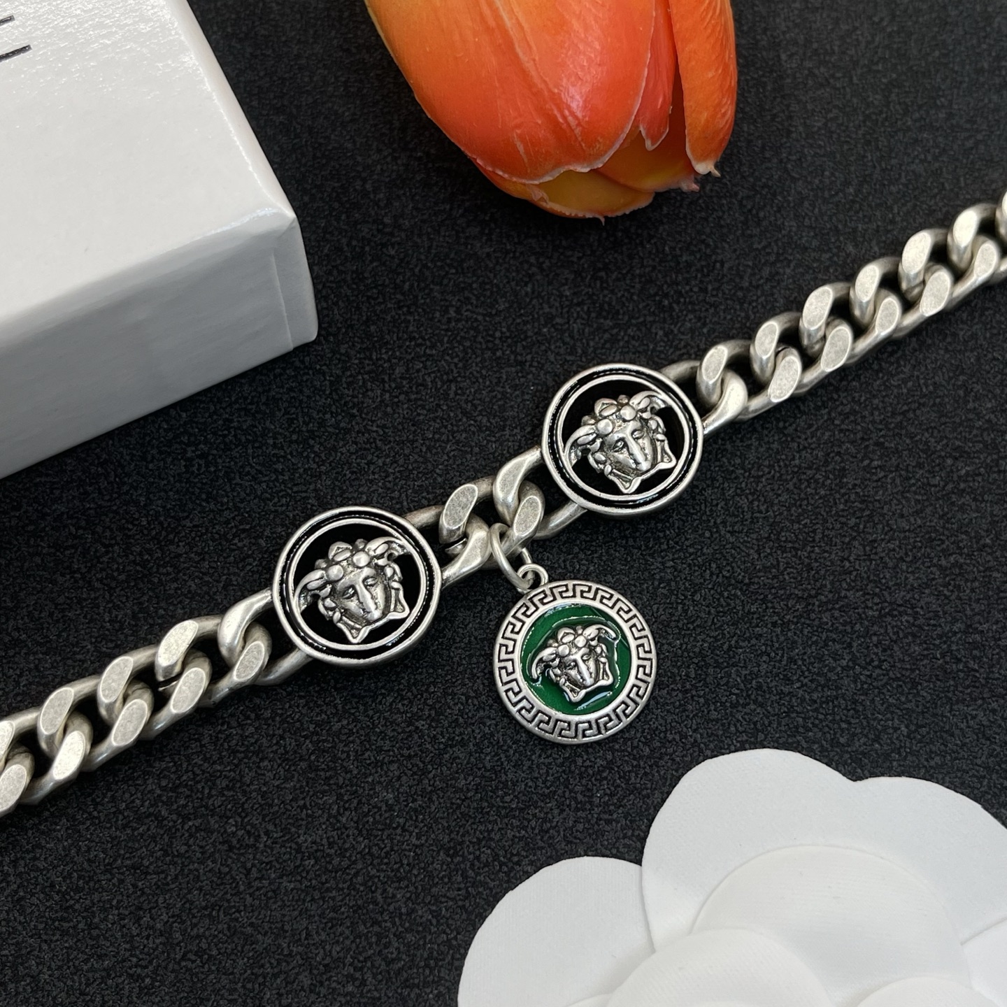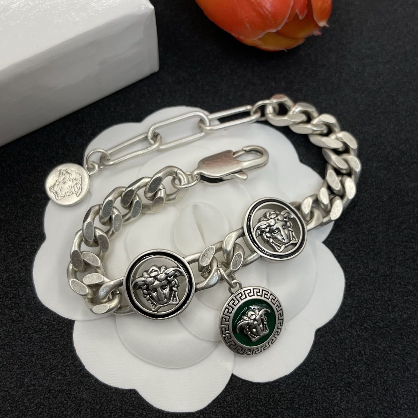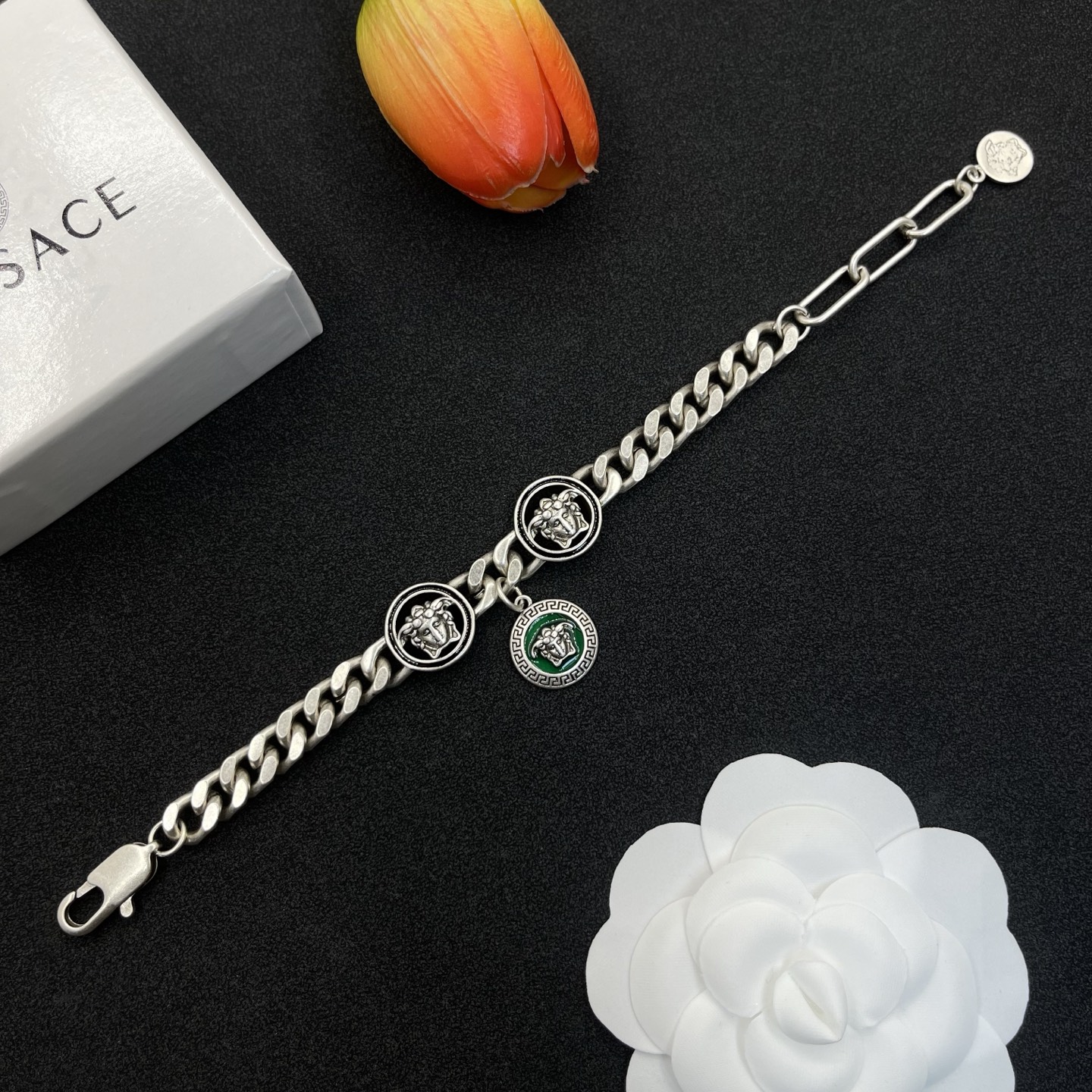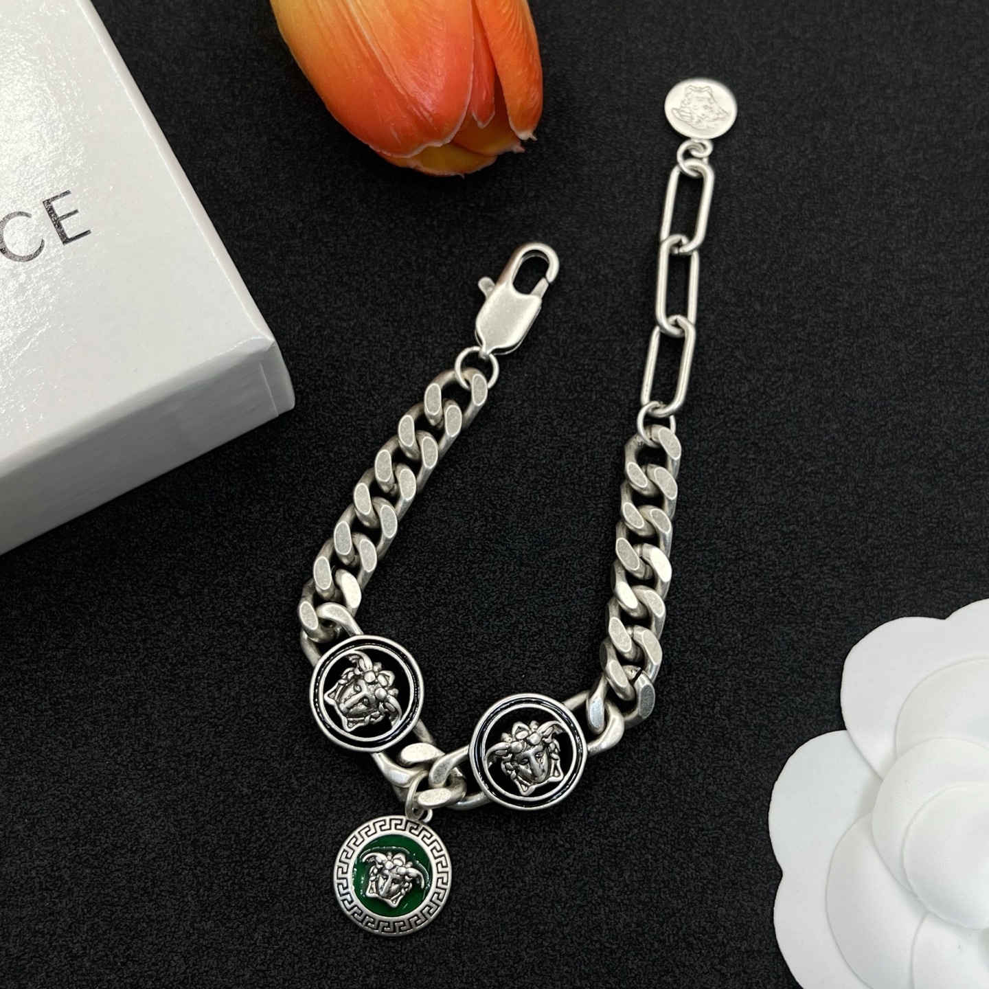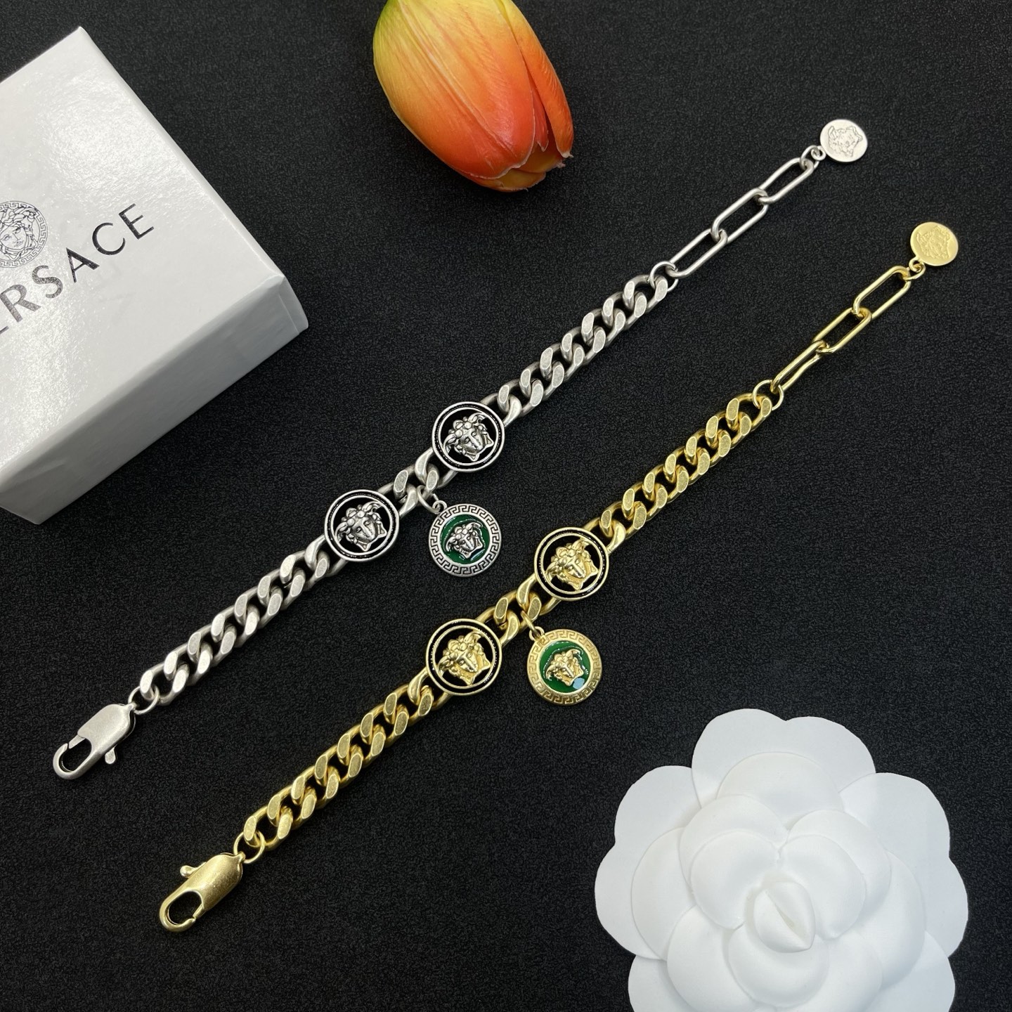 這款首飾是AAAAA 1:1 質量(非常棒). 使用了和原版一模一樣的材料. 商標部分也保持了和范思哲/Versace一樣. 圖片拍攝是實物首飾拍攝, 您所收到的實物保證和我們圖片一模一樣.