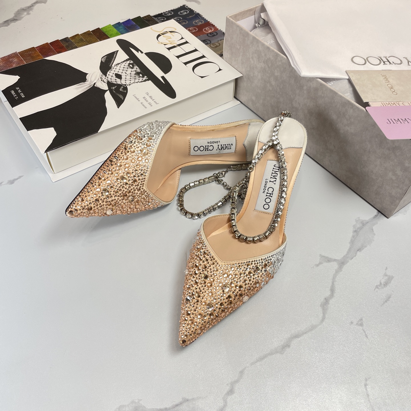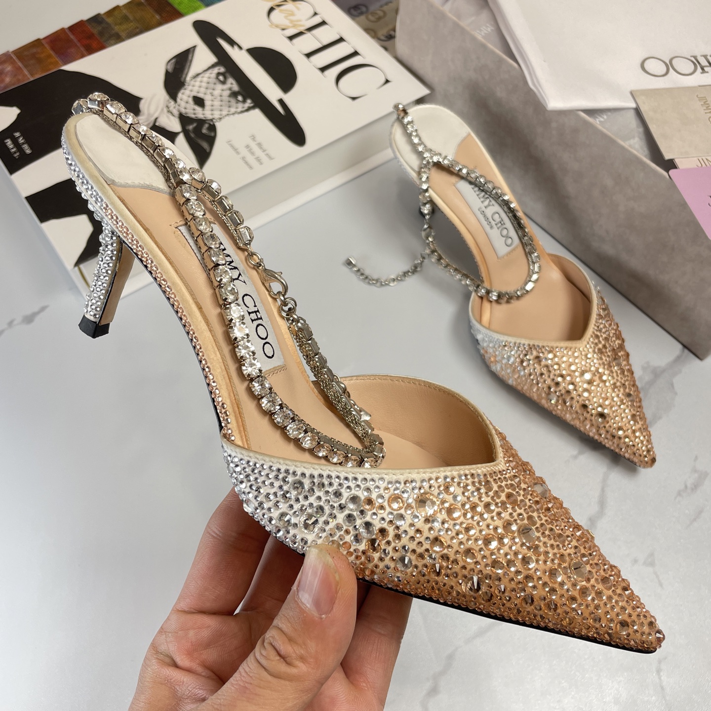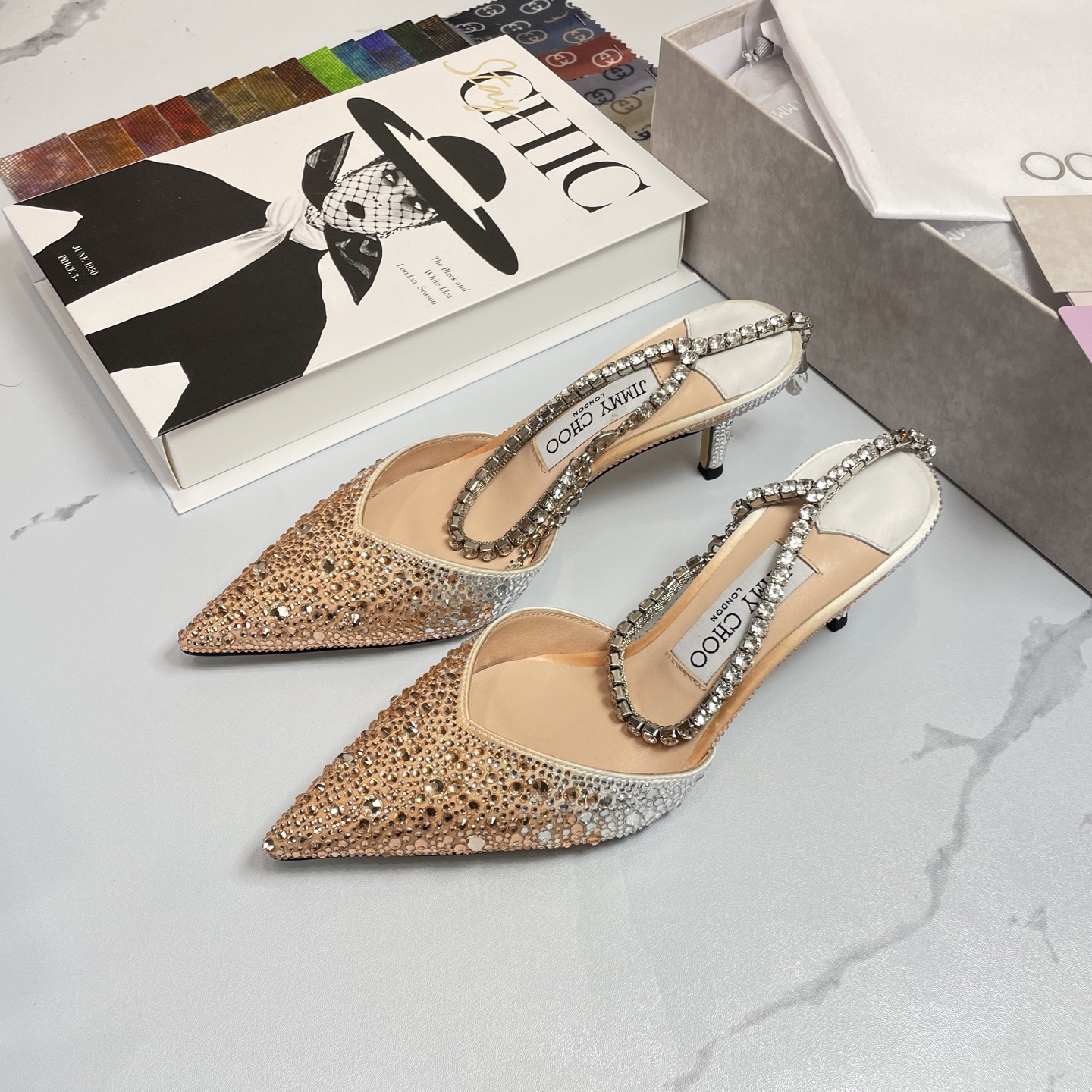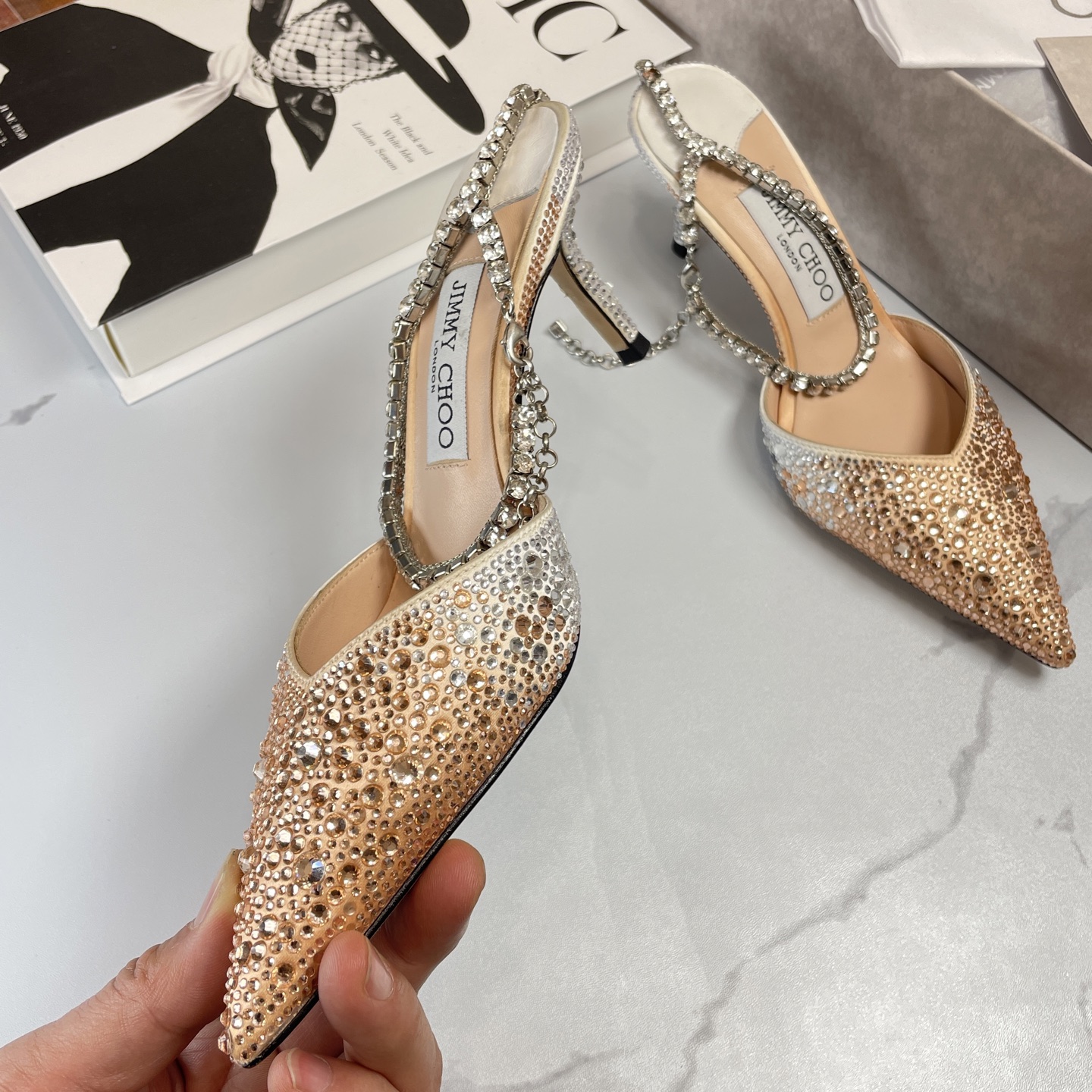 這款鞋子是AAAAA 1:1 質量(非常棒). 使用了和原版一模一樣的材料. 商標部分也保持了和吉米喬/JIMMY CHOO一樣. 圖片拍攝是實物鞋子拍攝, 您所收到的實物保證和我們圖片一模一樣.