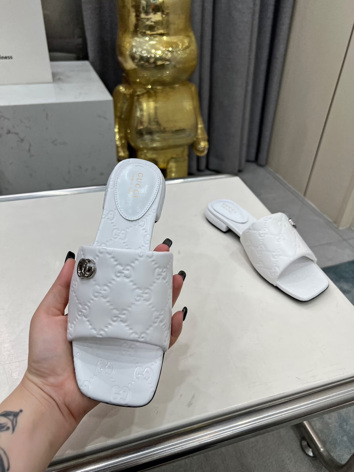 這款鞋子是AAAAA 1:1 質量(非常棒). 使用了和原版一模一樣的材料. 商標部分也保持了和古奇/Gucci一樣. 圖片拍攝是實物鞋子拍攝, 您所收到的實物保證和我們圖片一模一樣.