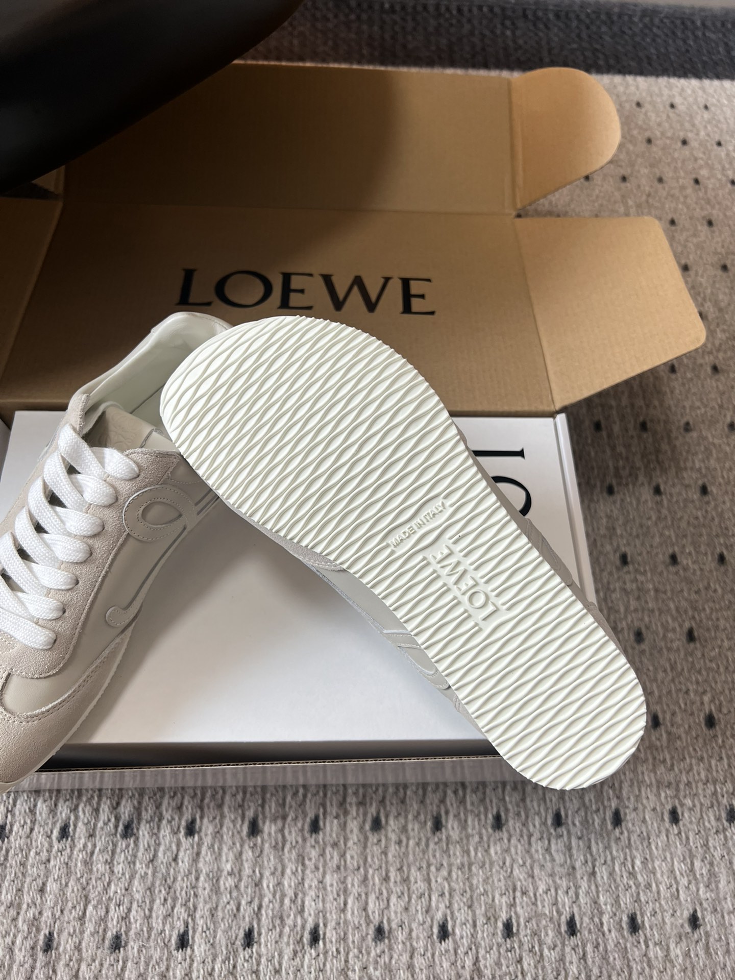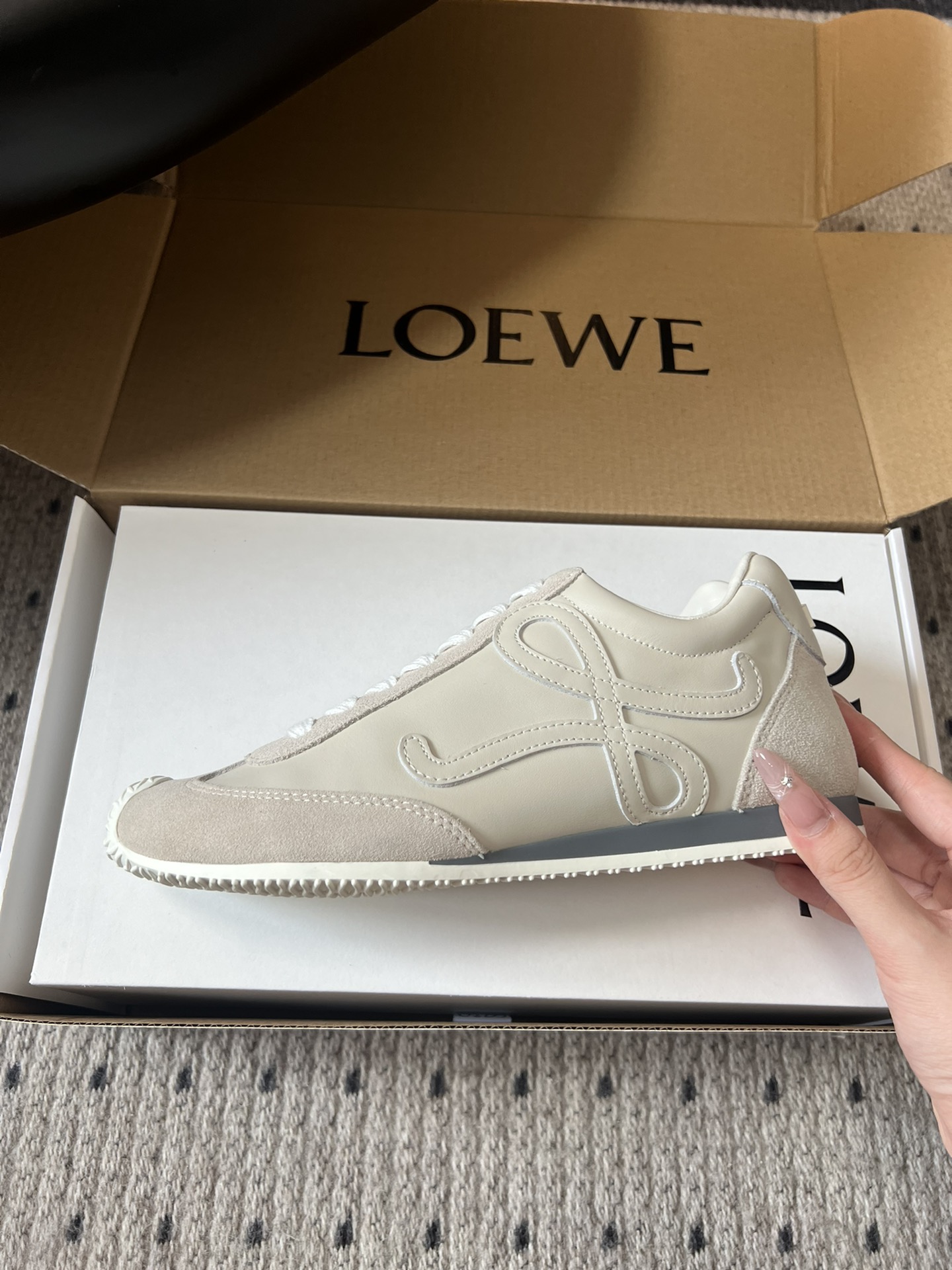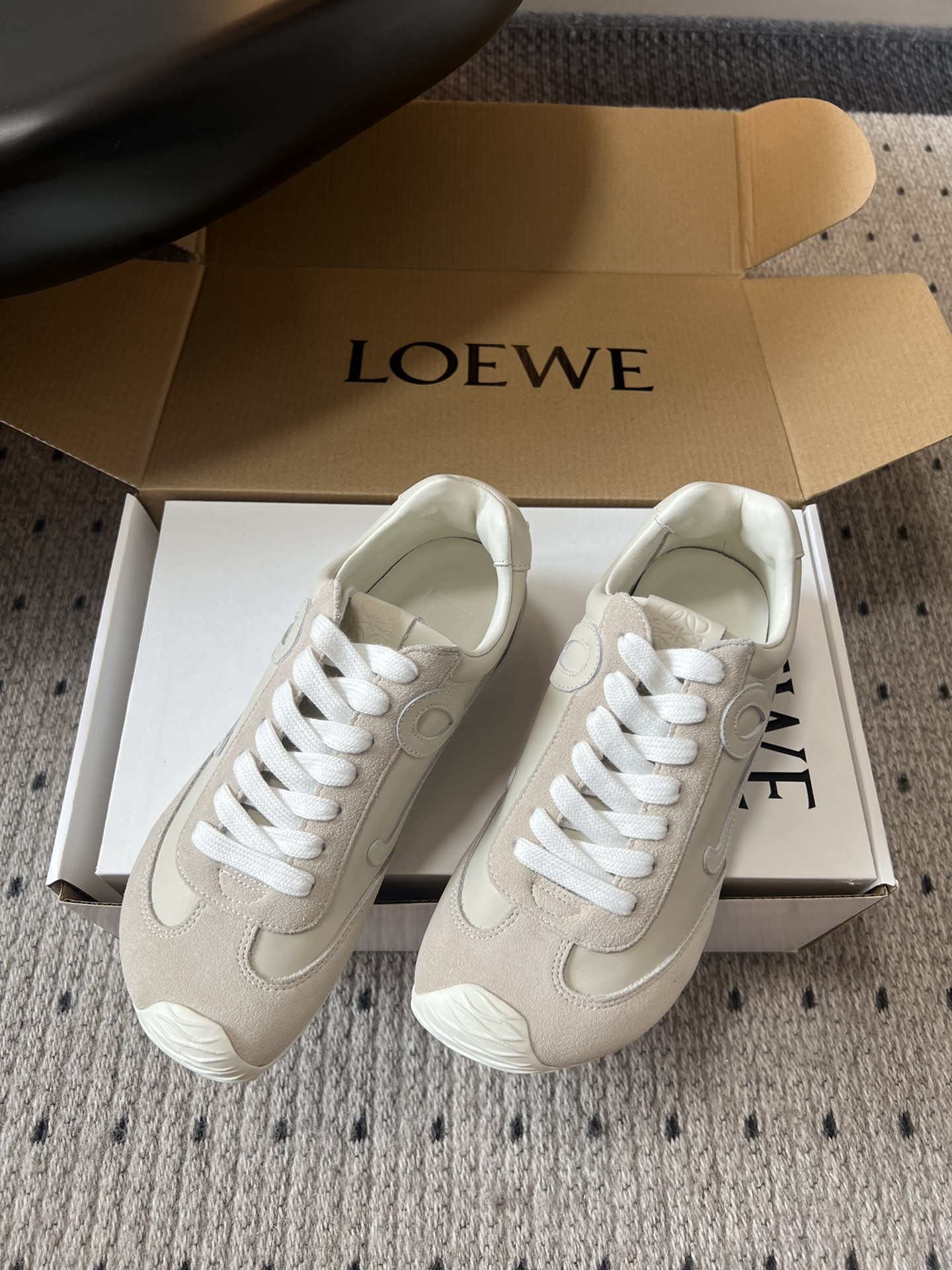 這款鞋子是AAAAA 1:1 質量(非常棒). 使用了和原版一模一樣的材料. 商標部分也保持了和Loewe一樣. 圖片拍攝是實物鞋子拍攝, 您所收到的實物保證和我們圖片一模一樣.
