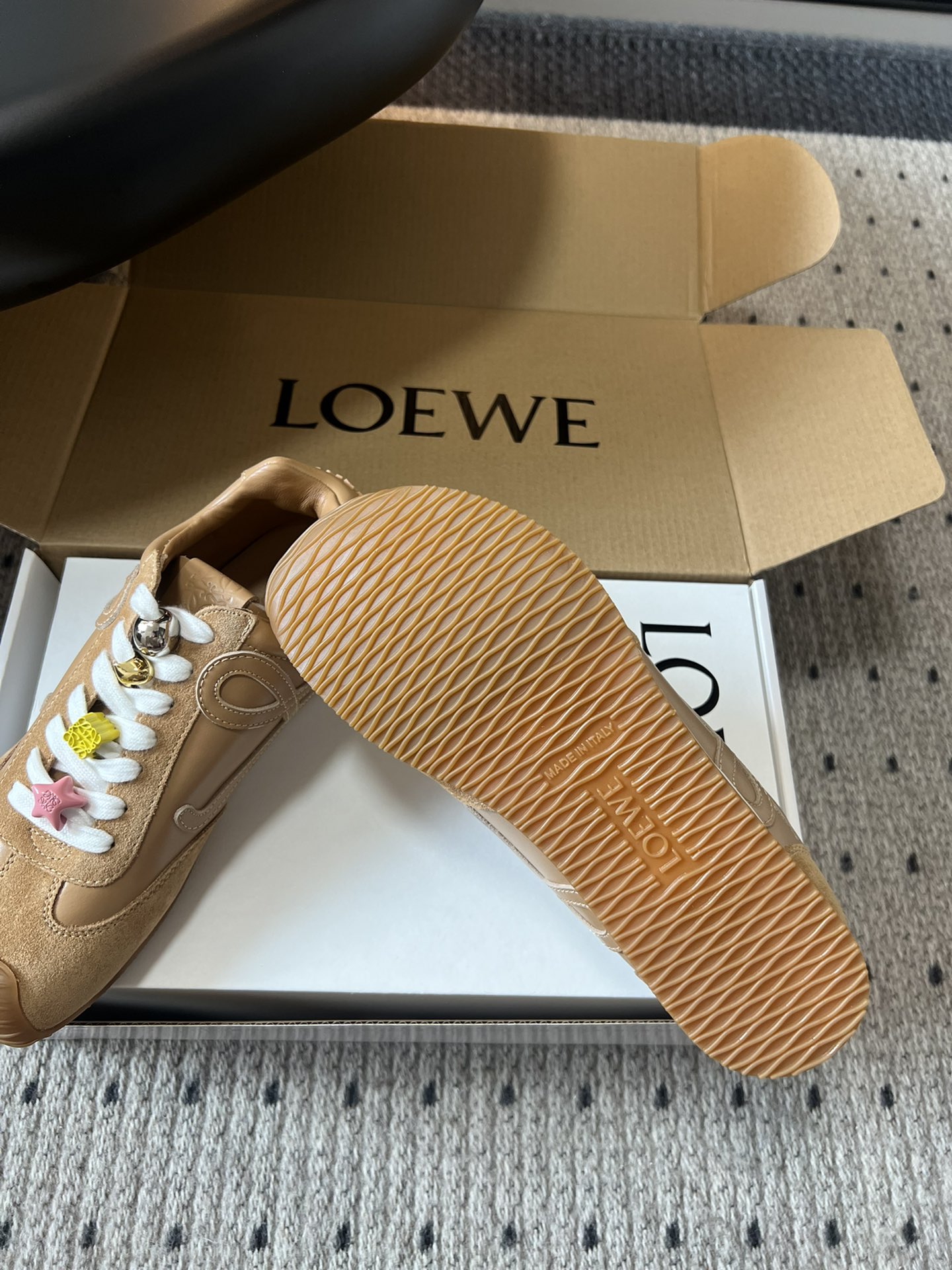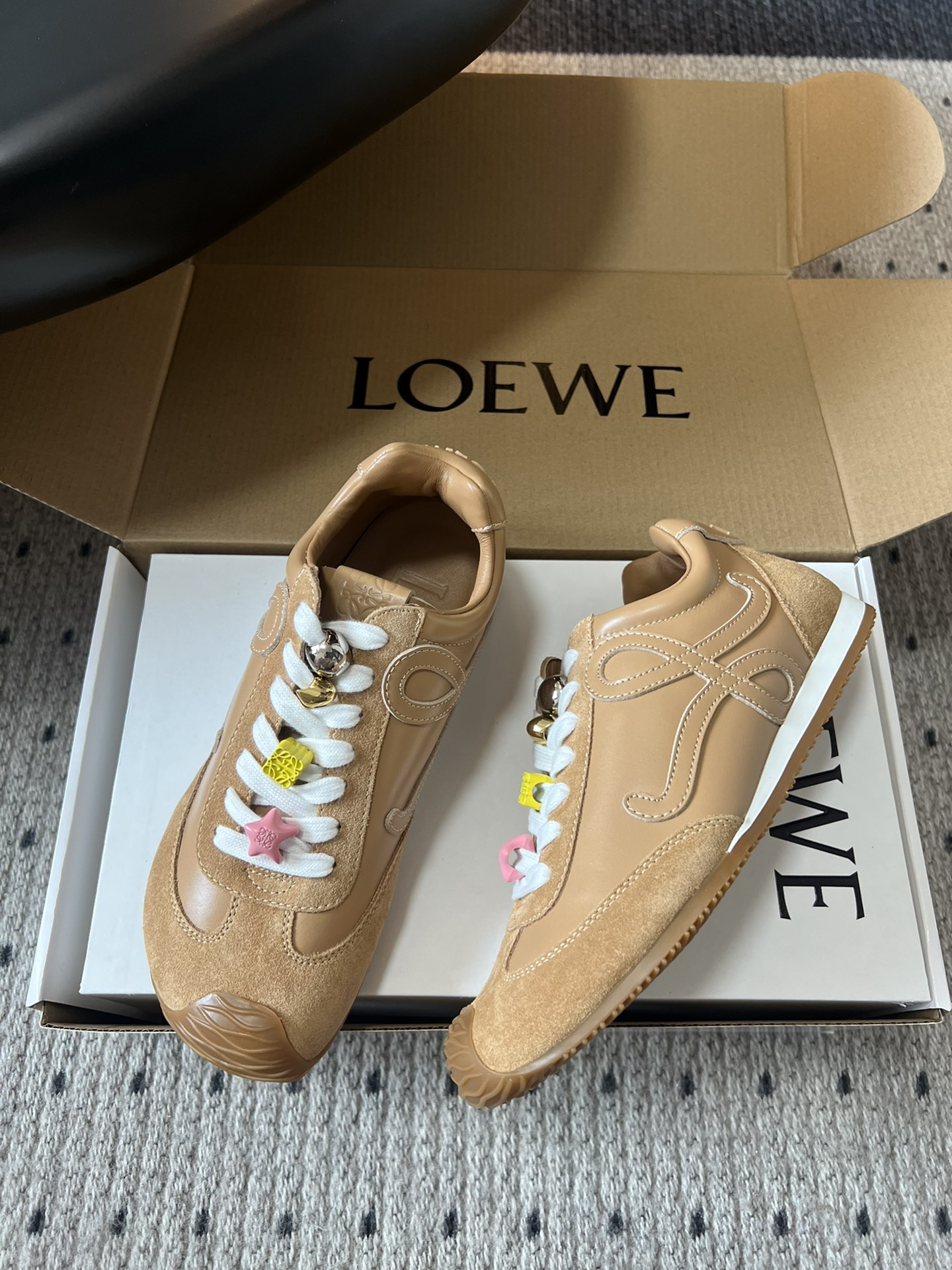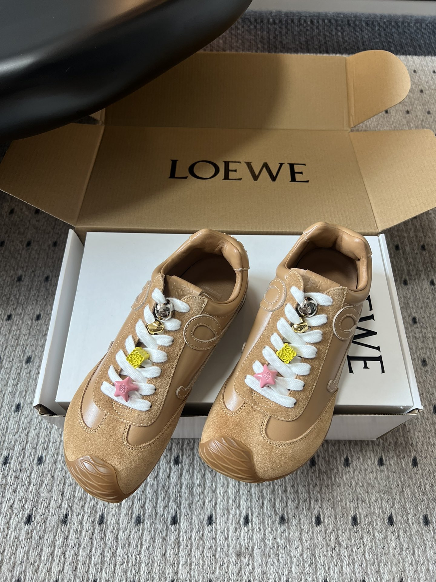 這款鞋子是AAAAA 1:1 質量(非常棒). 使用了和原版一模一樣的材料. 商標部分也保持了和Loewe一樣. 圖片拍攝是實物鞋子拍攝, 您所收到的實物保證和我們圖片一模一樣.