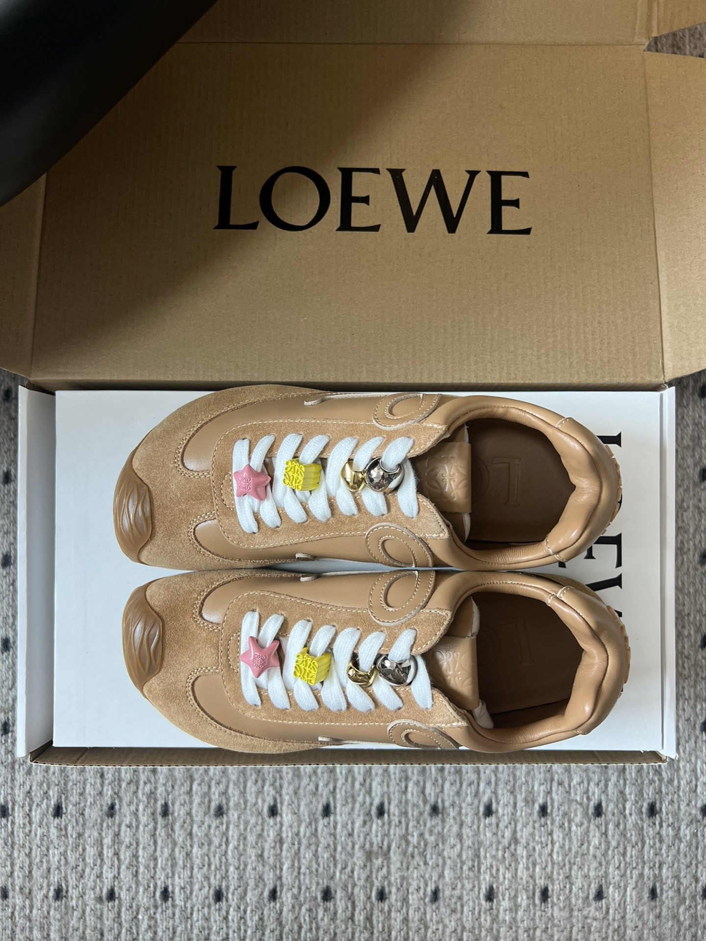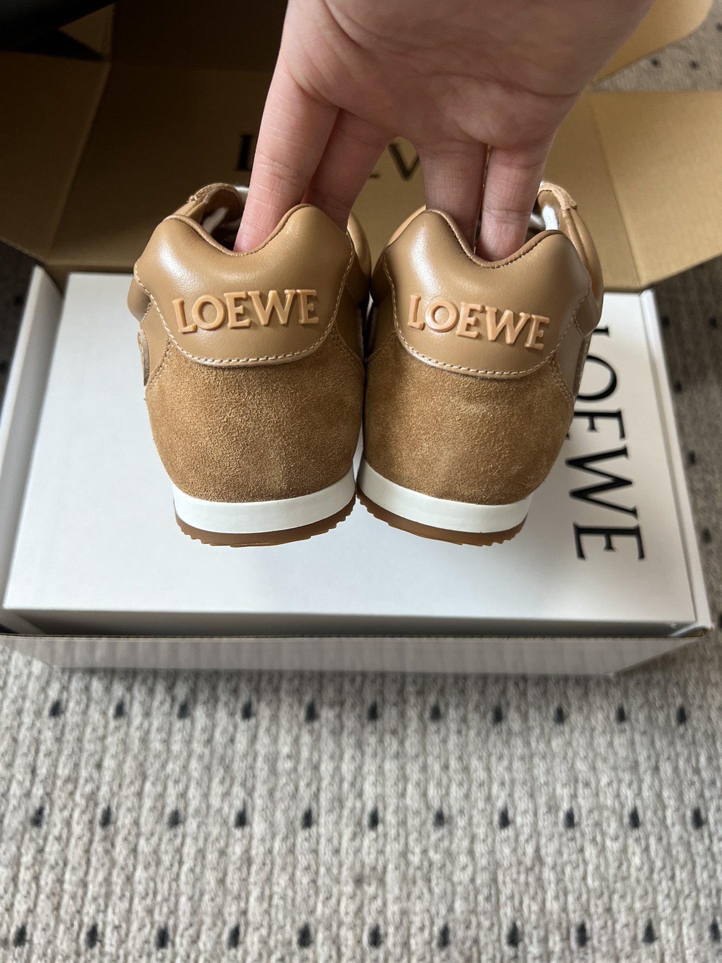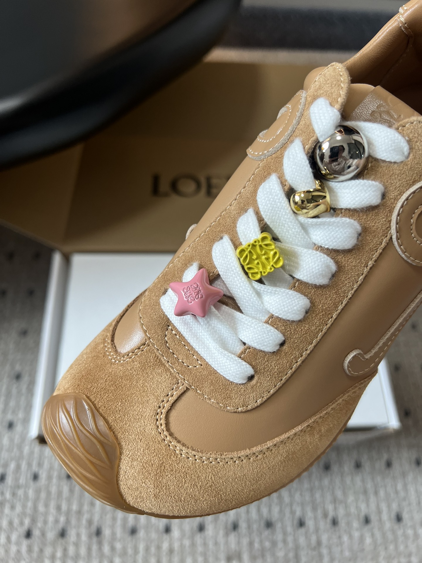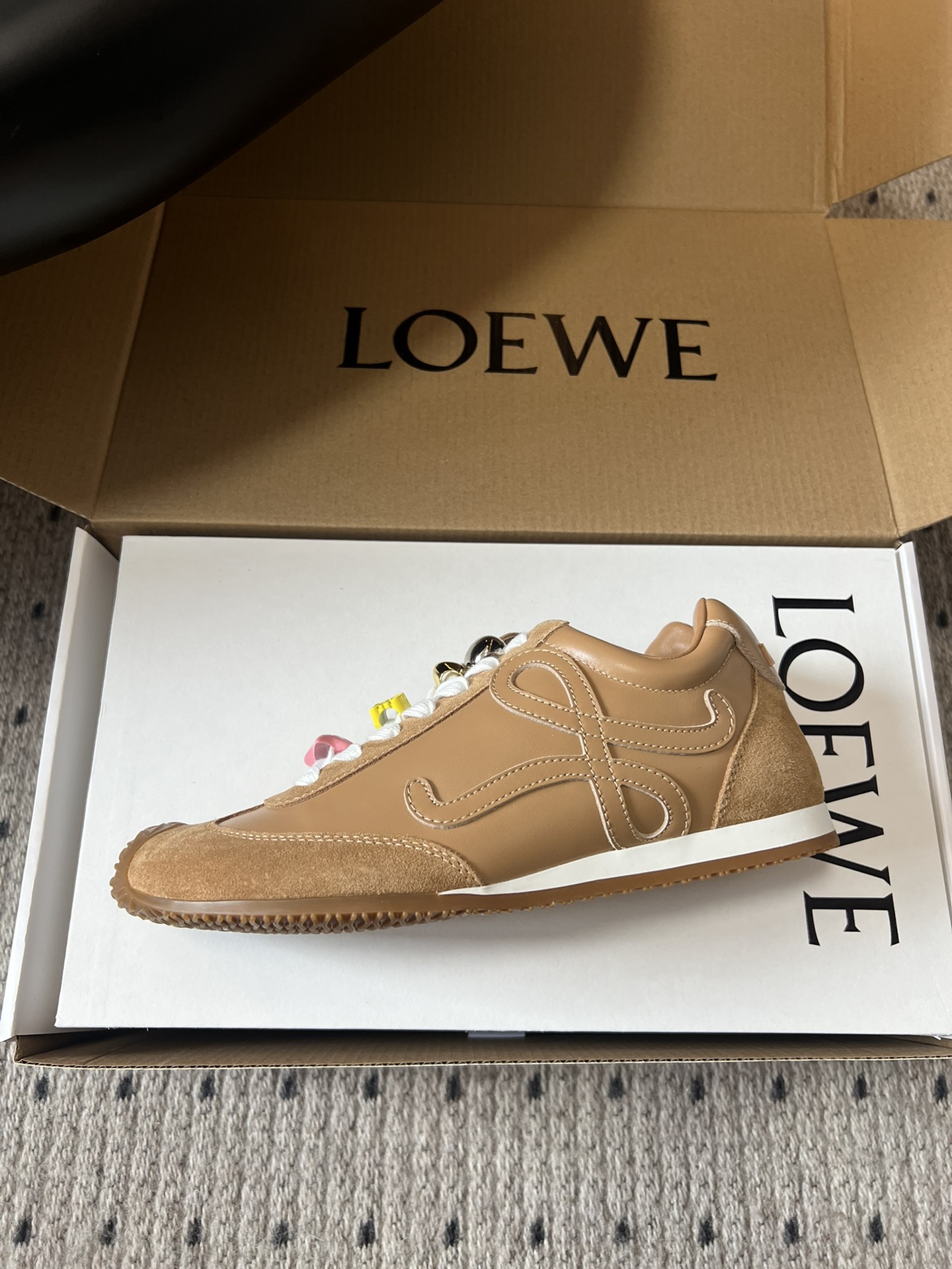 這款鞋子是AAAAA 1:1 質量(非常棒). 使用了和原版一模一樣的材料. 商標部分也保持了和Loewe一樣. 圖片拍攝是實物鞋子拍攝, 您所收到的實物保證和我們圖片一模一樣.