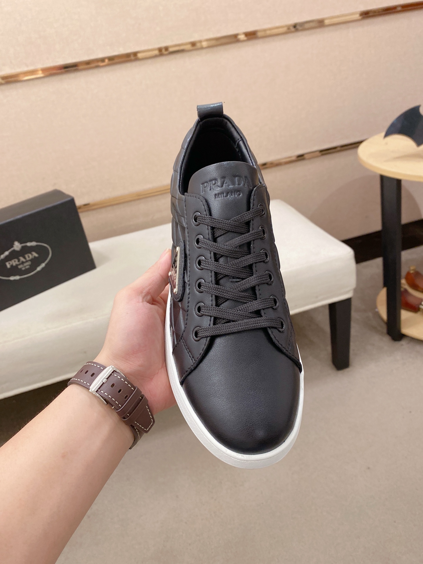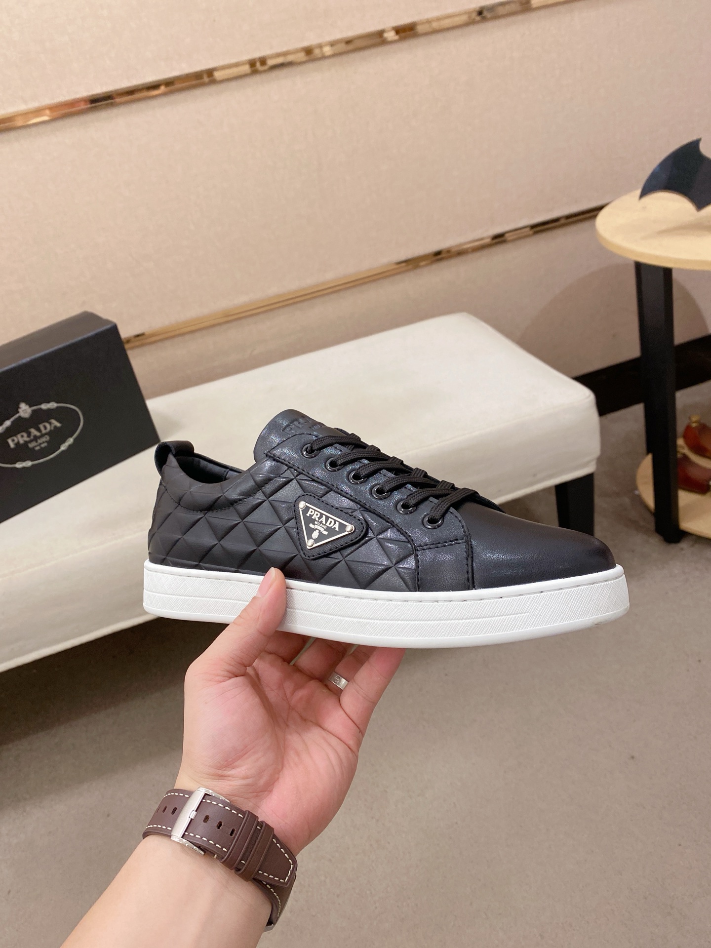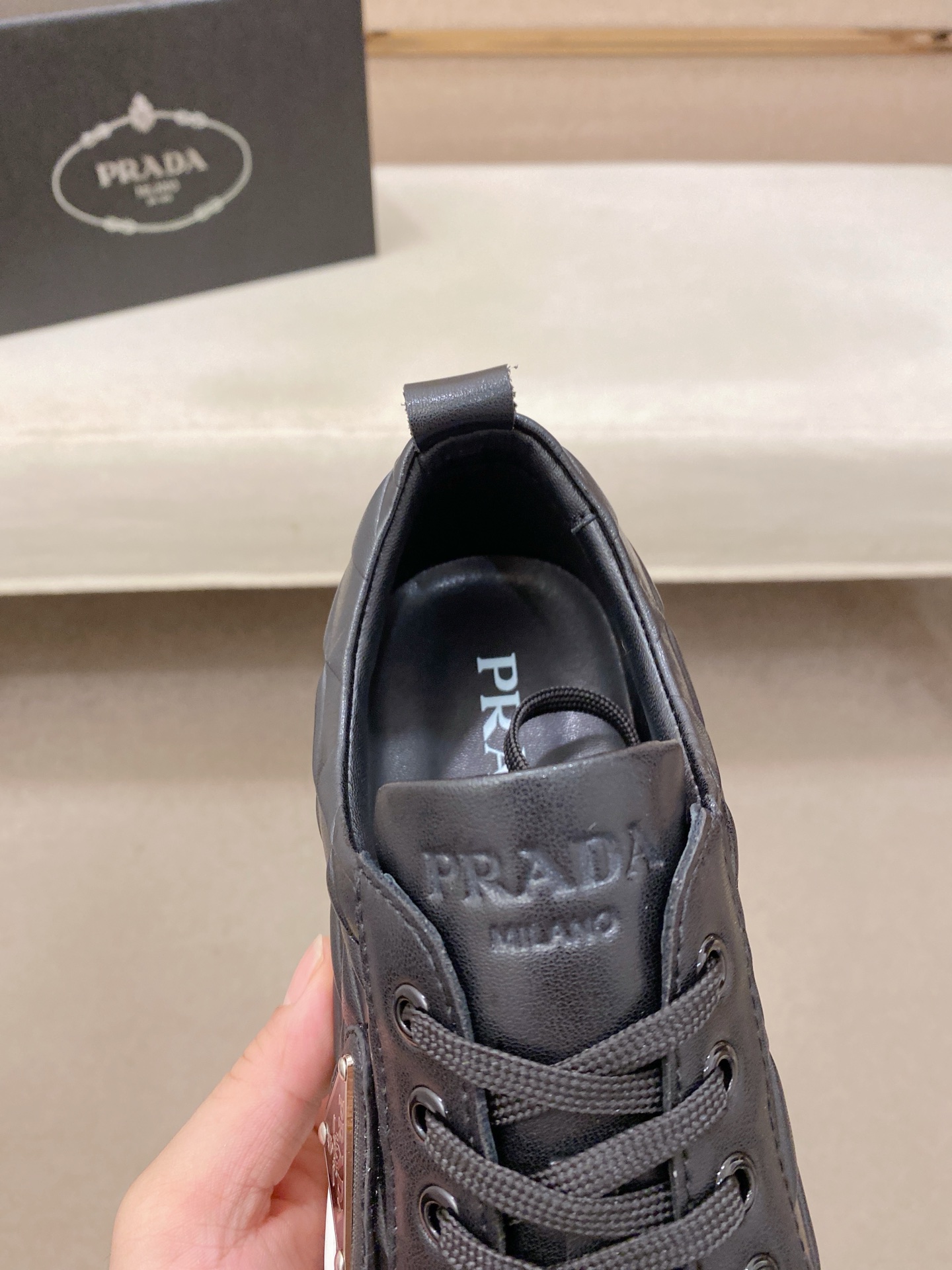這款鞋子是AAAAA 1:1 質量(非常棒). 使用了和原版一模一樣的材料. 商標部分也保持了和普拉達/Prada一樣. 圖片拍攝是實物鞋子拍攝, 您所收到的實物保證和我們圖片一模一樣.