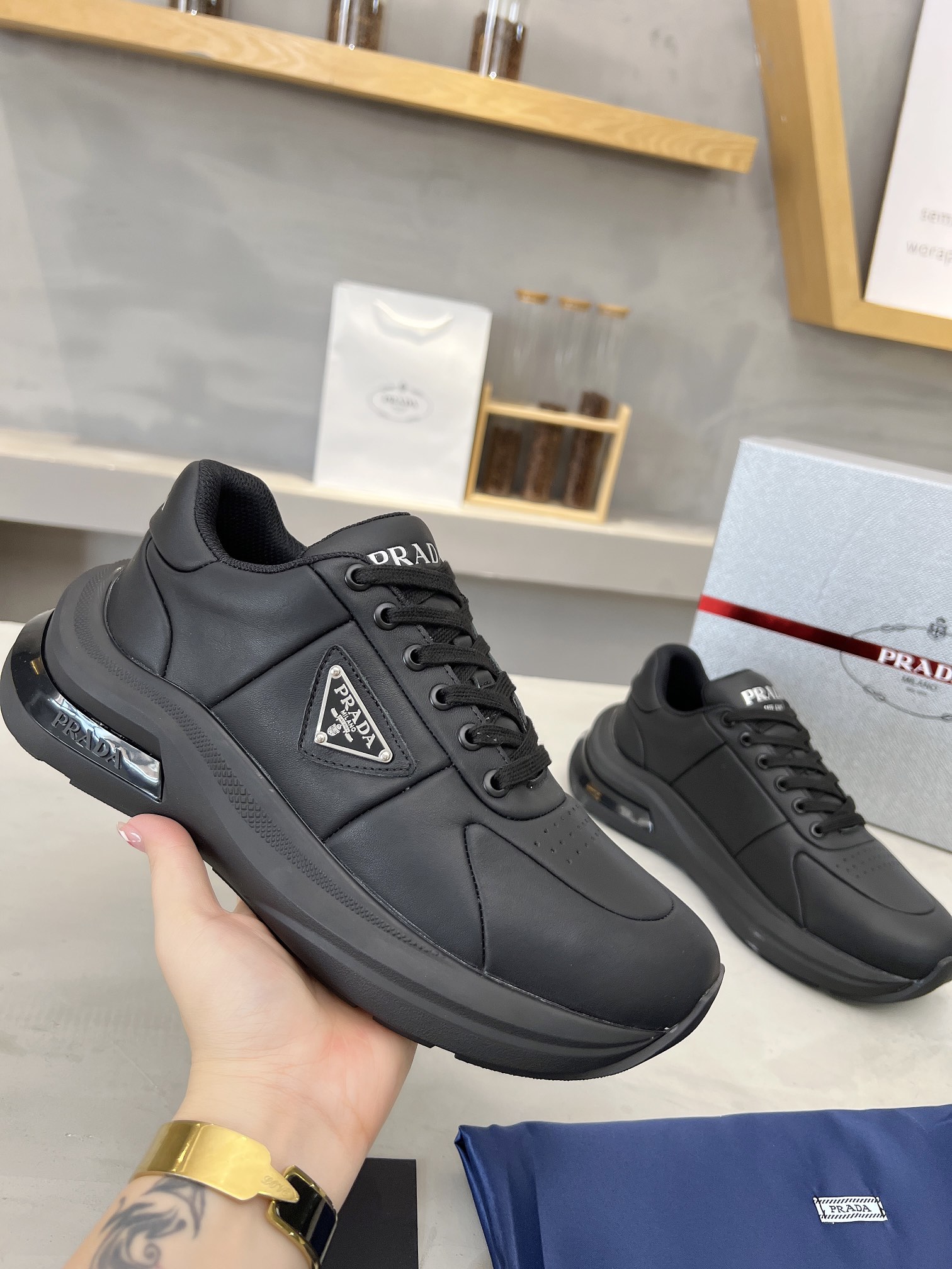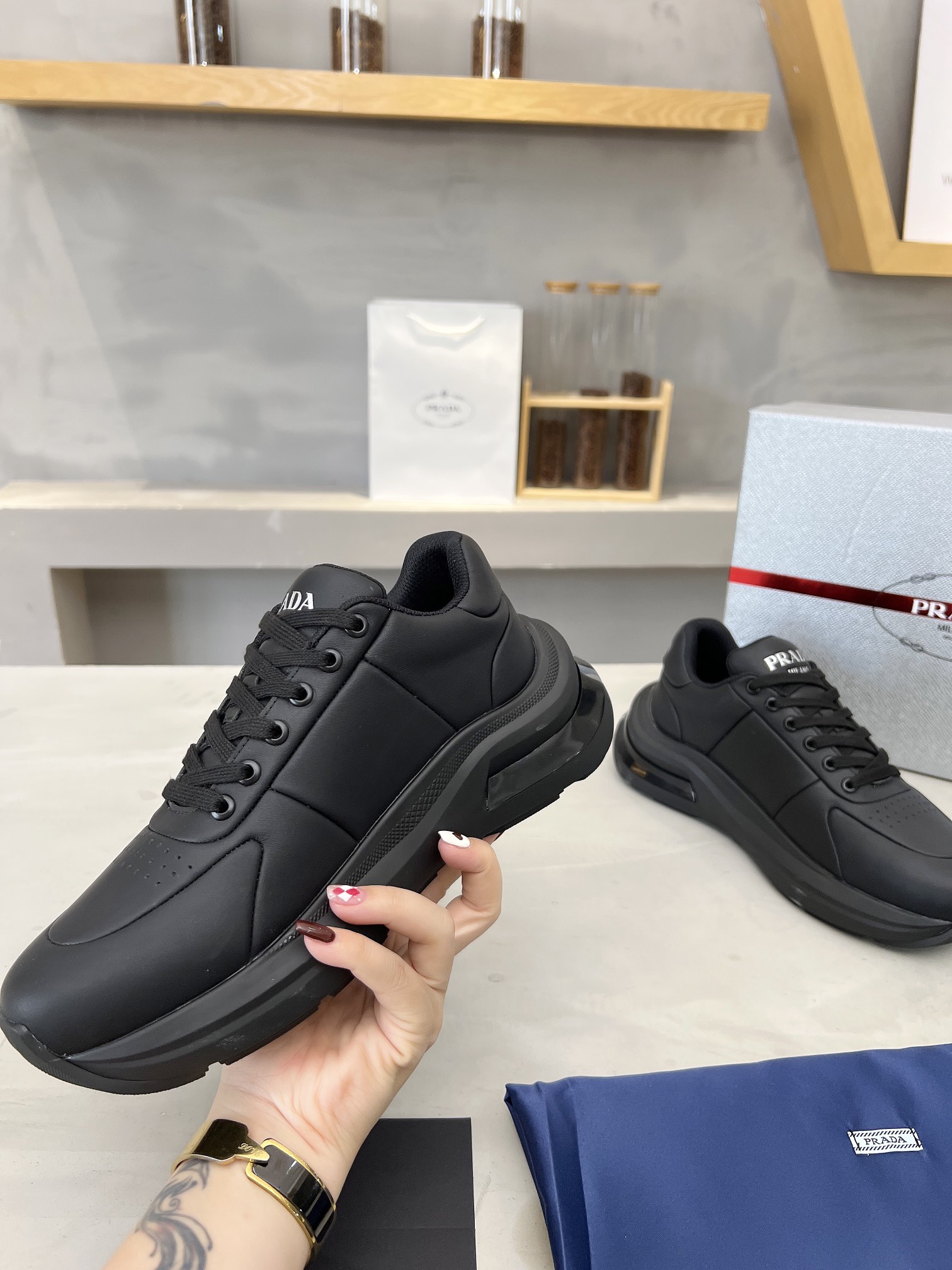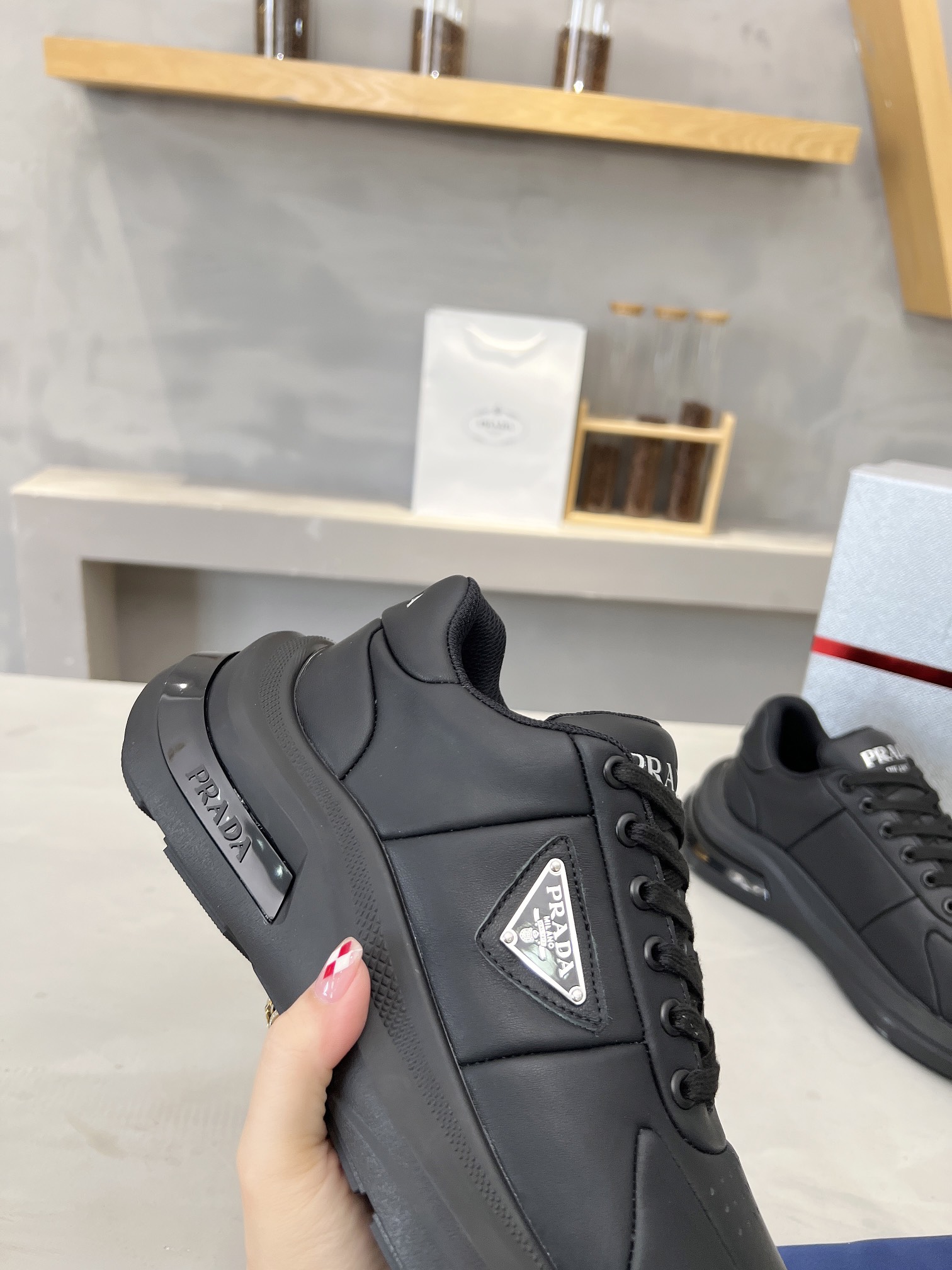 這款鞋子是AAAAA 1:1 質量(非常棒). 使用了和原版一模一樣的材料. 商標部分也保持了和普拉達/Prada一樣. 圖片拍攝是實物鞋子拍攝, 您所收到的實物保證和我們圖片一模一樣.