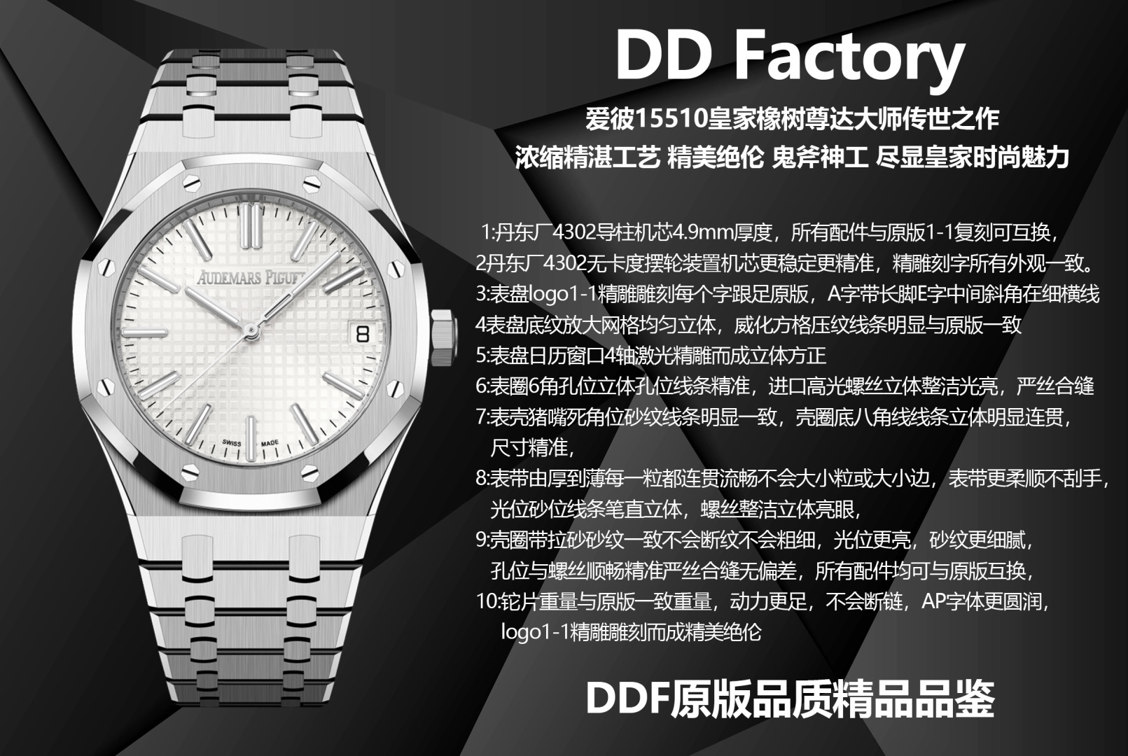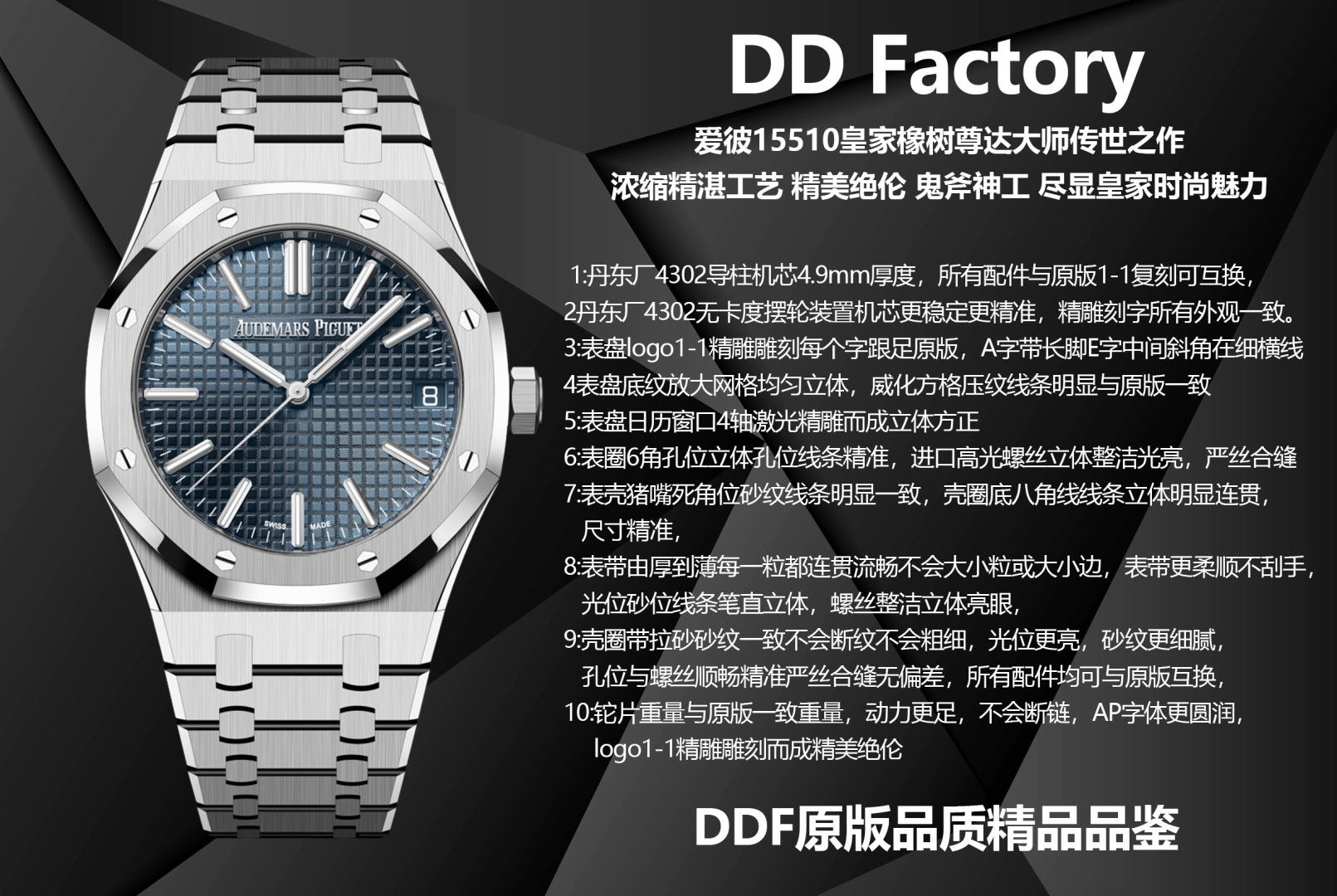 這款手錶是AAAAA 1:1 質量(非常棒). 使用了和原版一模一樣的材料. 商標部分也保持了和愛彼/Audemars Piguet一樣. 圖片拍攝是實物手錶拍攝, 您所收到的實物保證和我們圖片一模一樣.