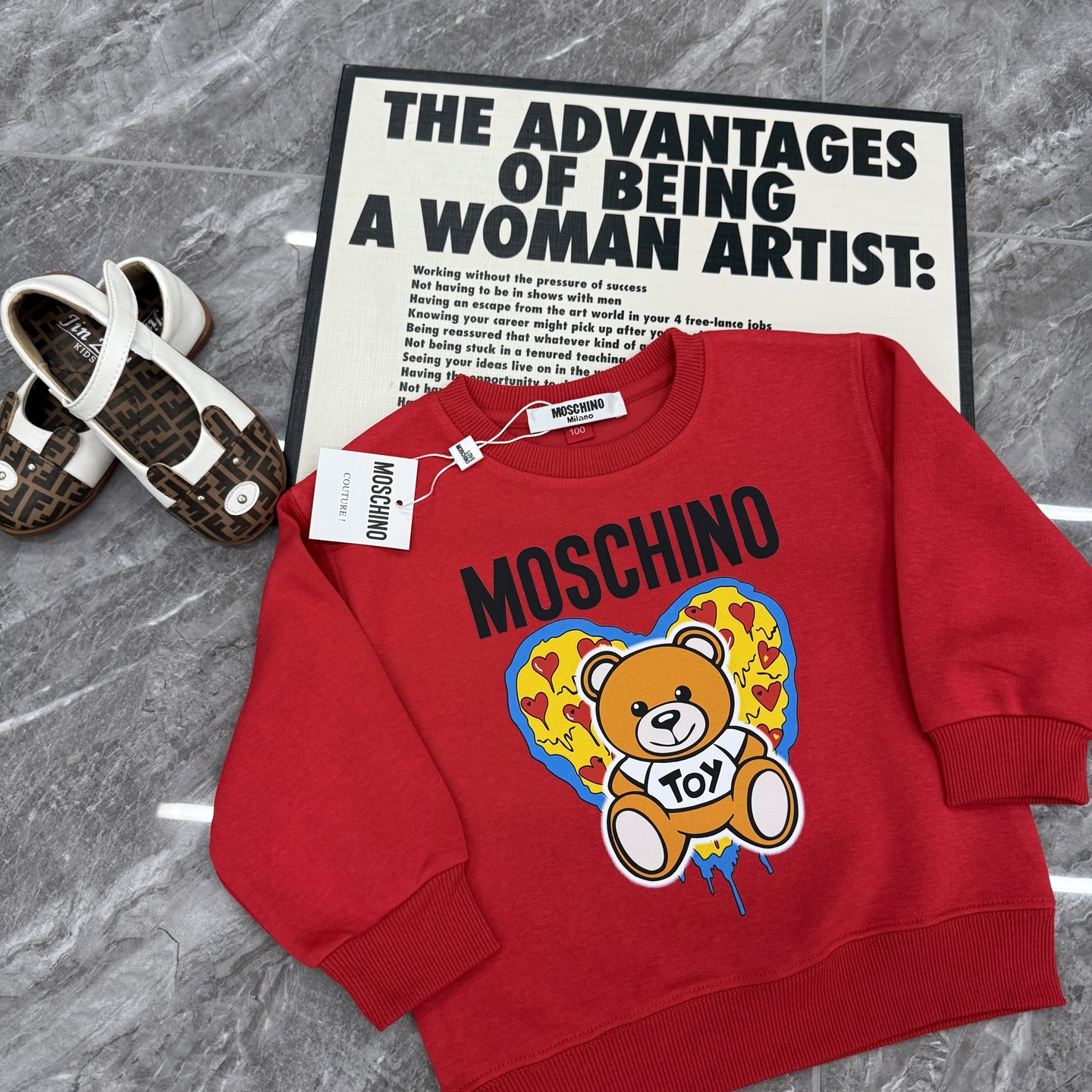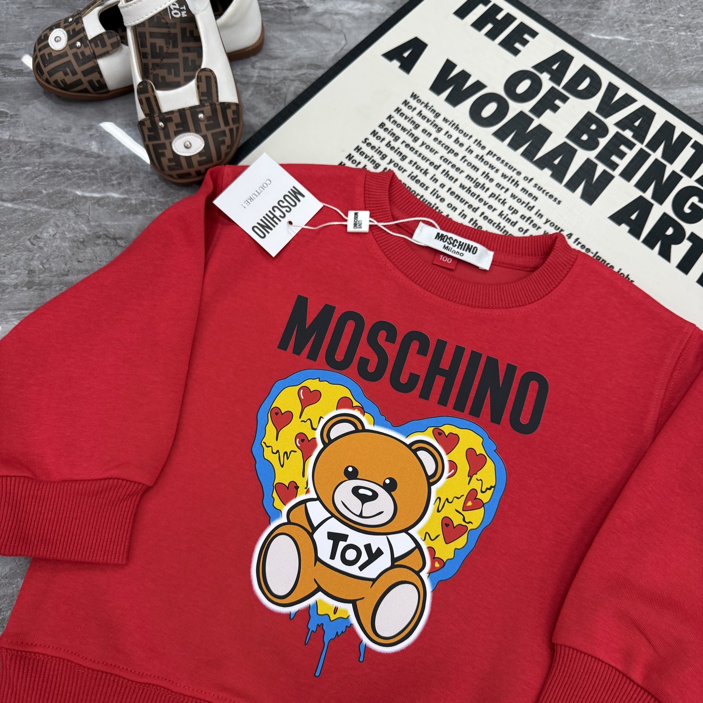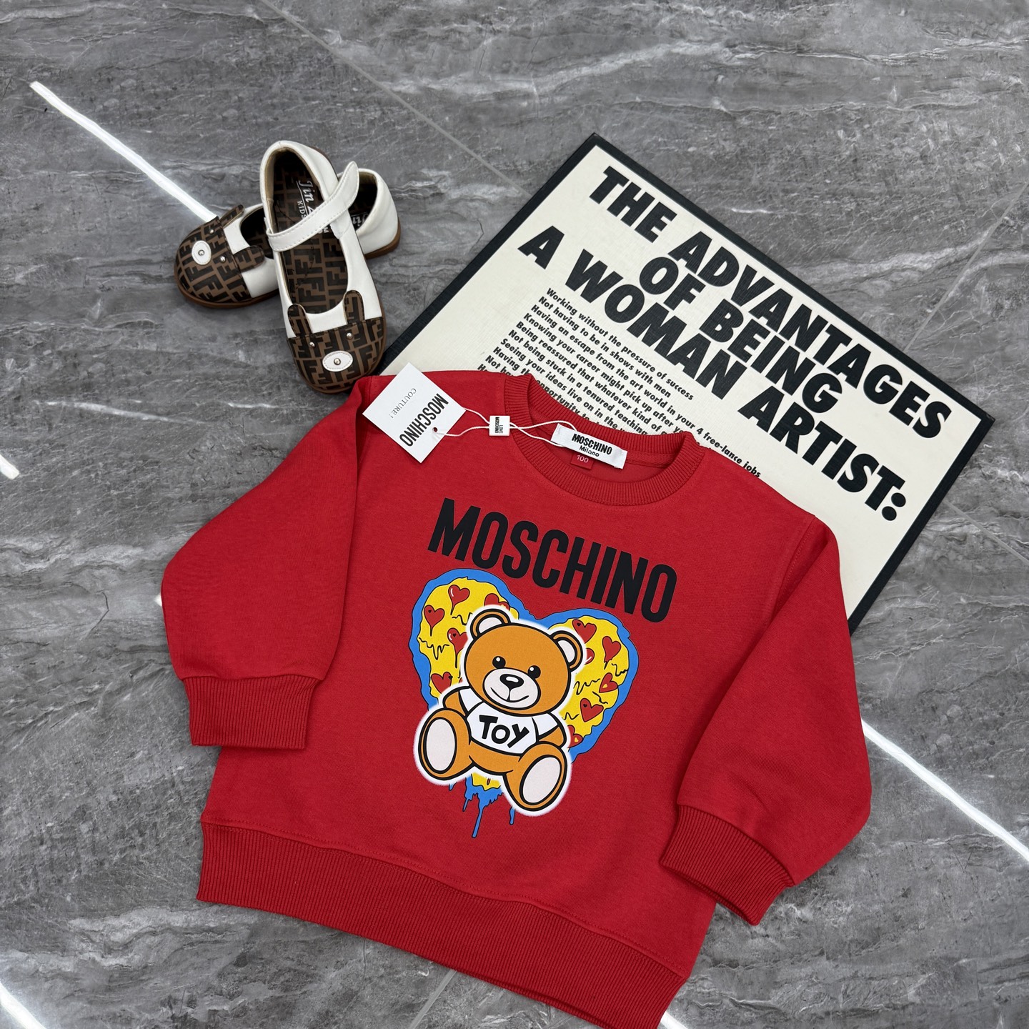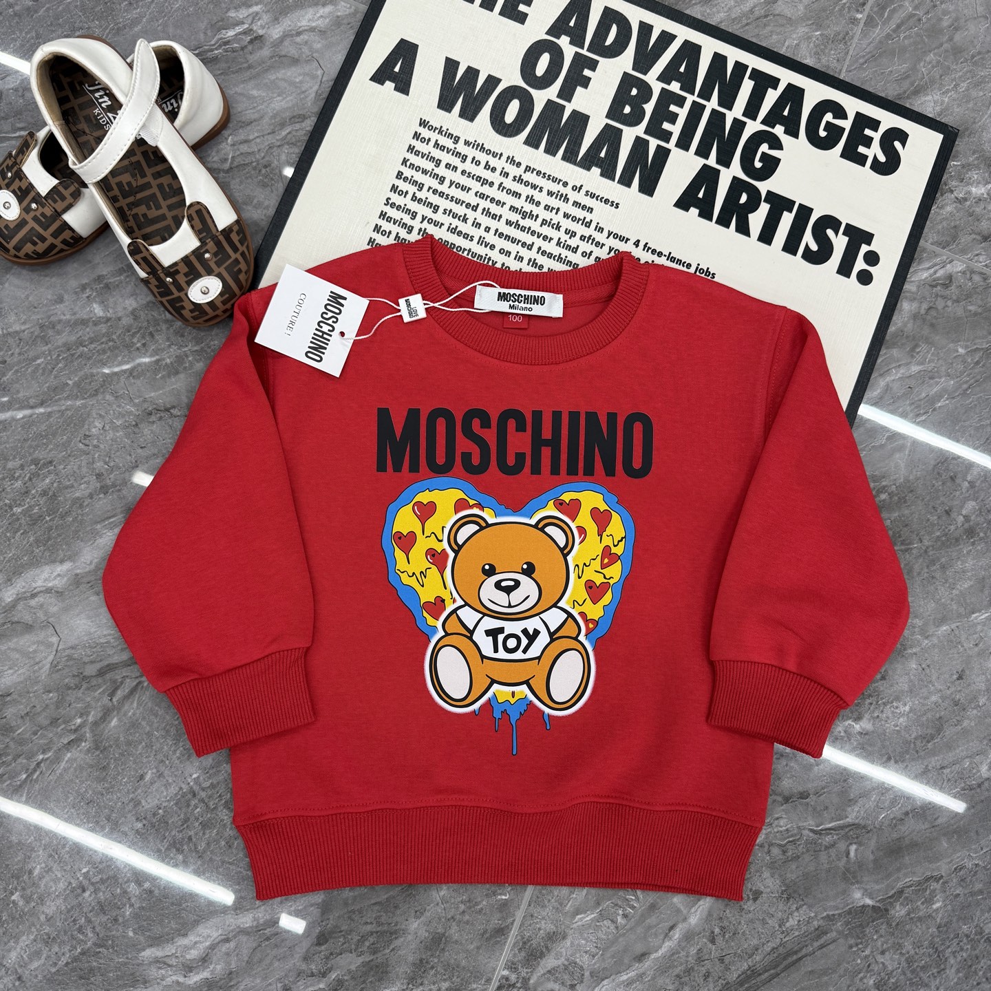 這款儿童鞋是AAAAA 1:1 質量(非常棒). 使用了和原版一模一樣的材料. 商標部分也保持了和莫斯基諾/Moschino一樣. 圖片拍攝是實物儿童鞋拍攝, 您所收到的實物保證和我們圖片一模一樣.