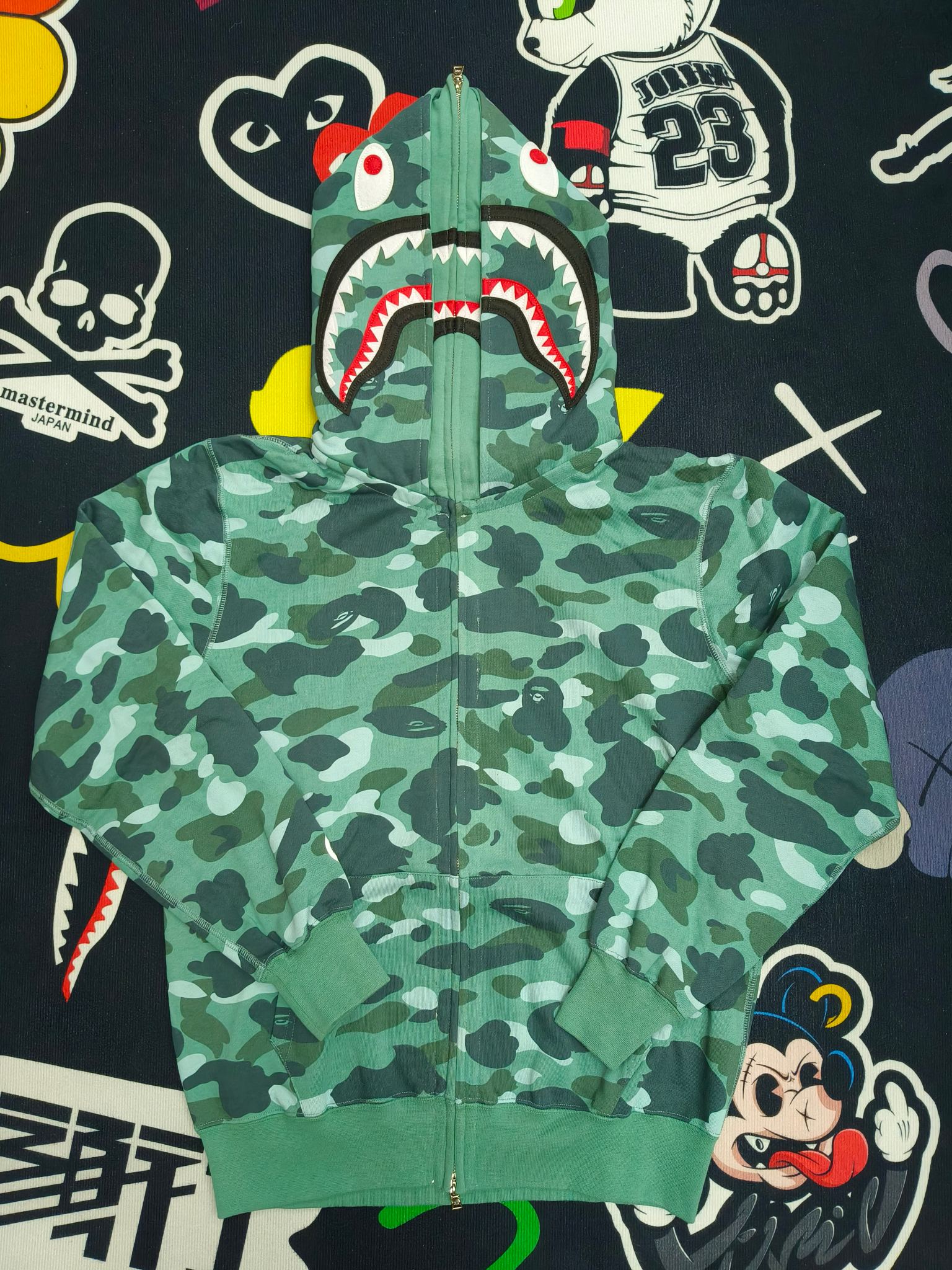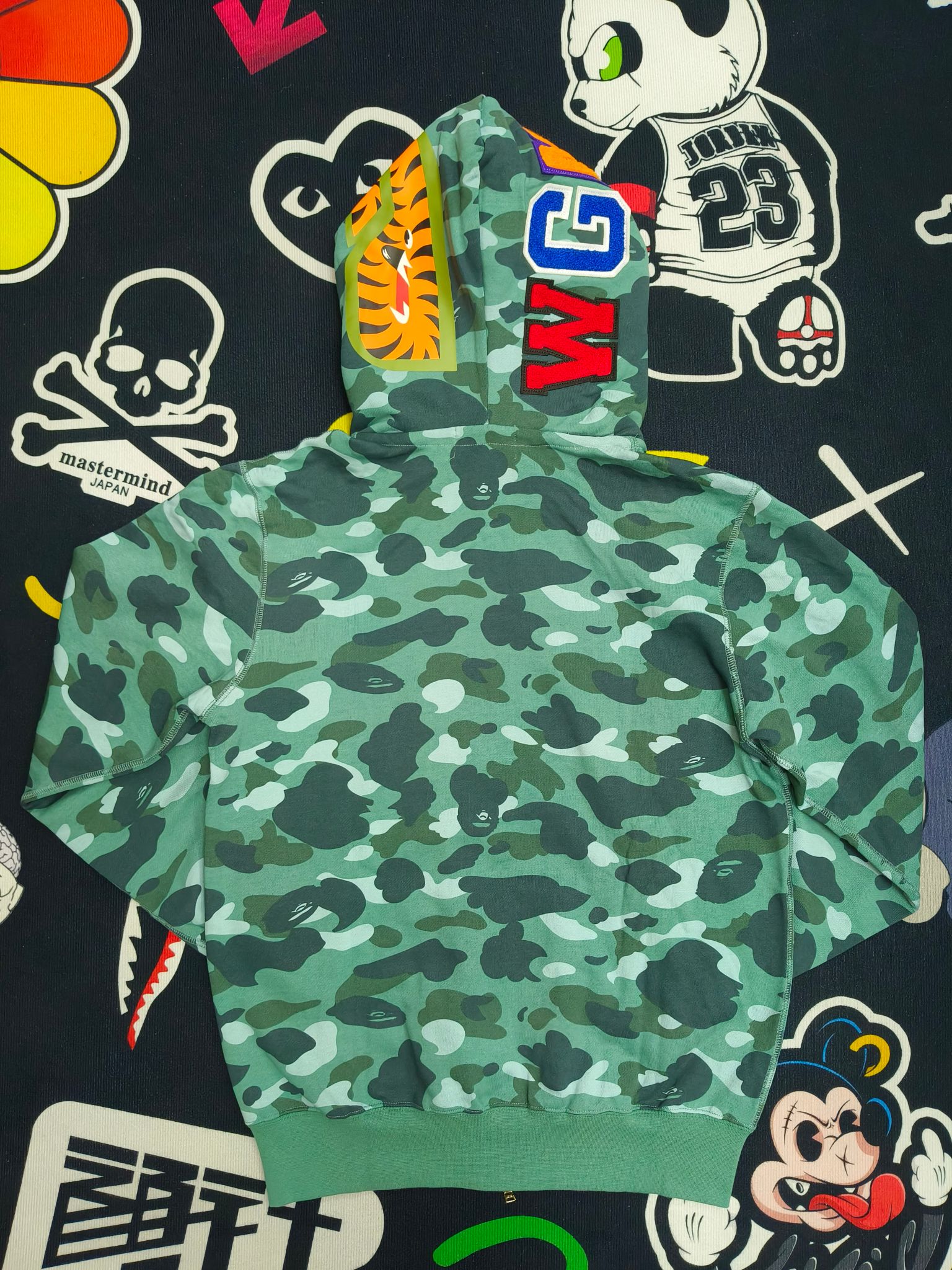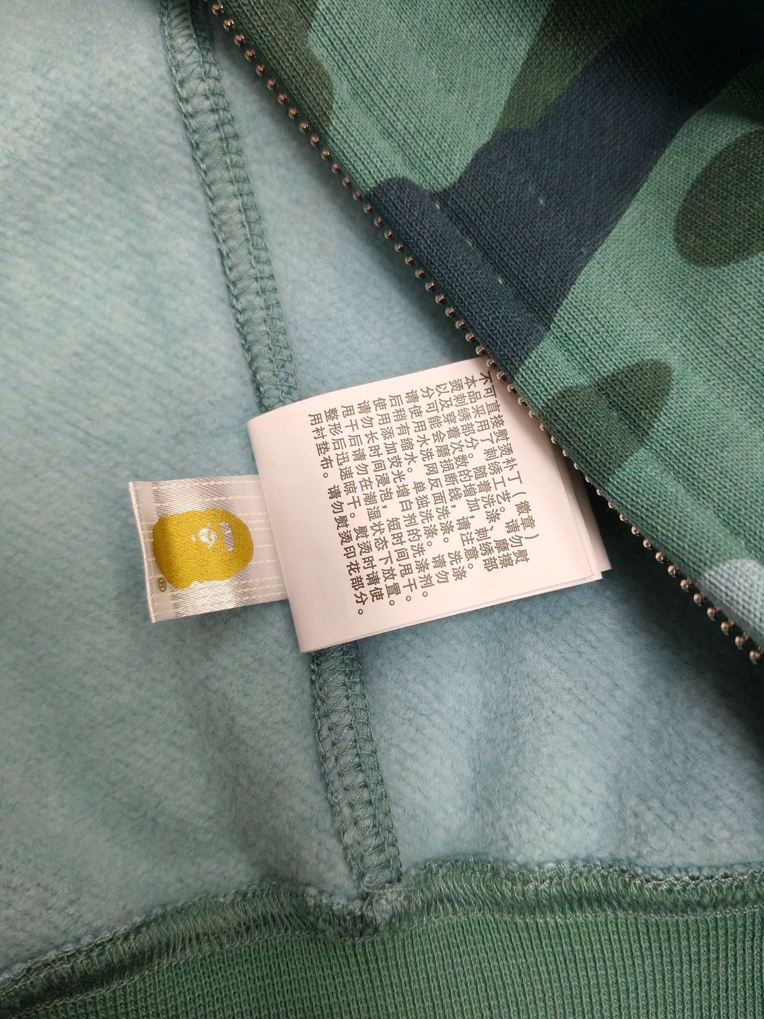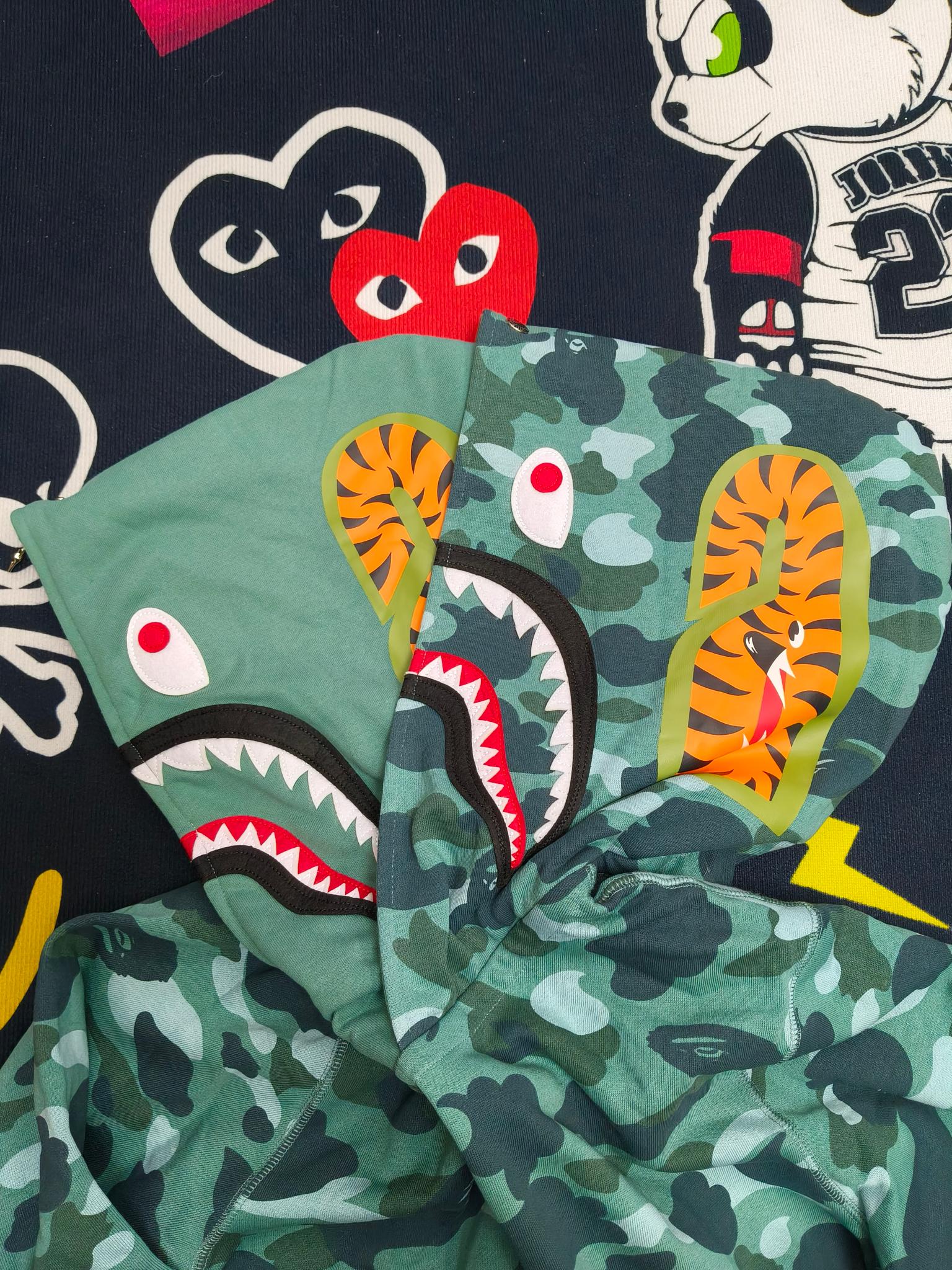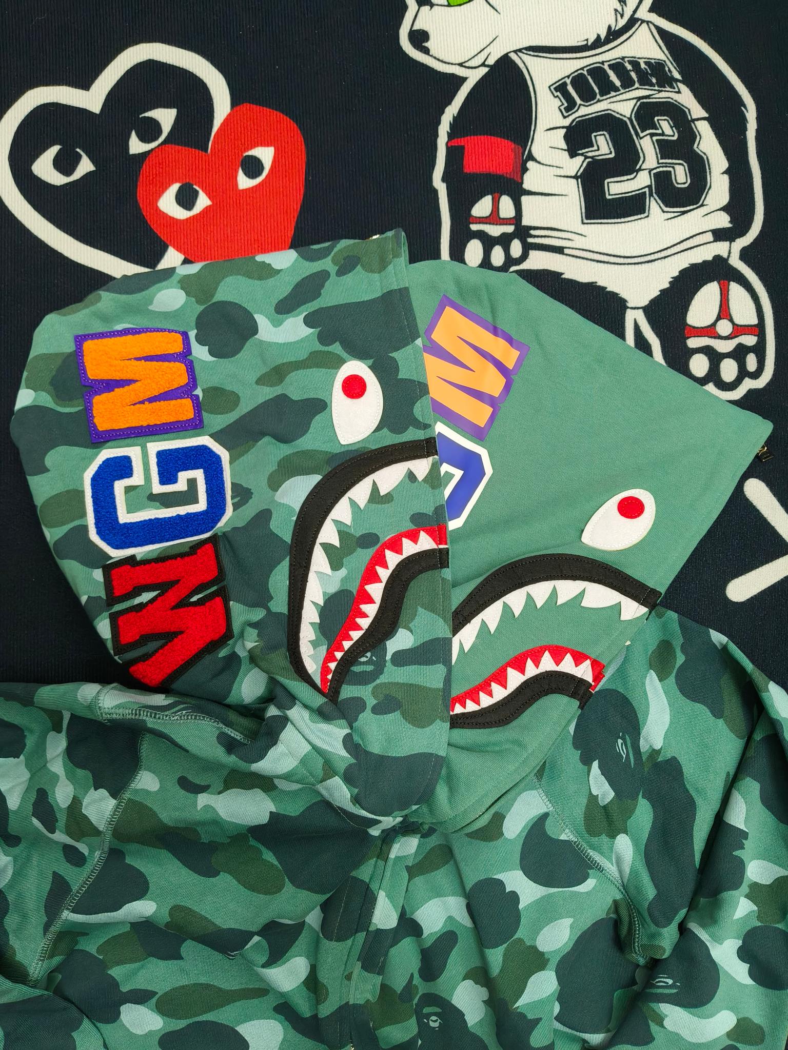 這款衣服是AAAAA 1:1 質量(非常棒). 使用了和原版一模一樣的材料. 商標部分也保持了和Bape一樣. 圖片拍攝是實物衣服拍攝, 您所收到的實物保證和我們圖片一模一樣.