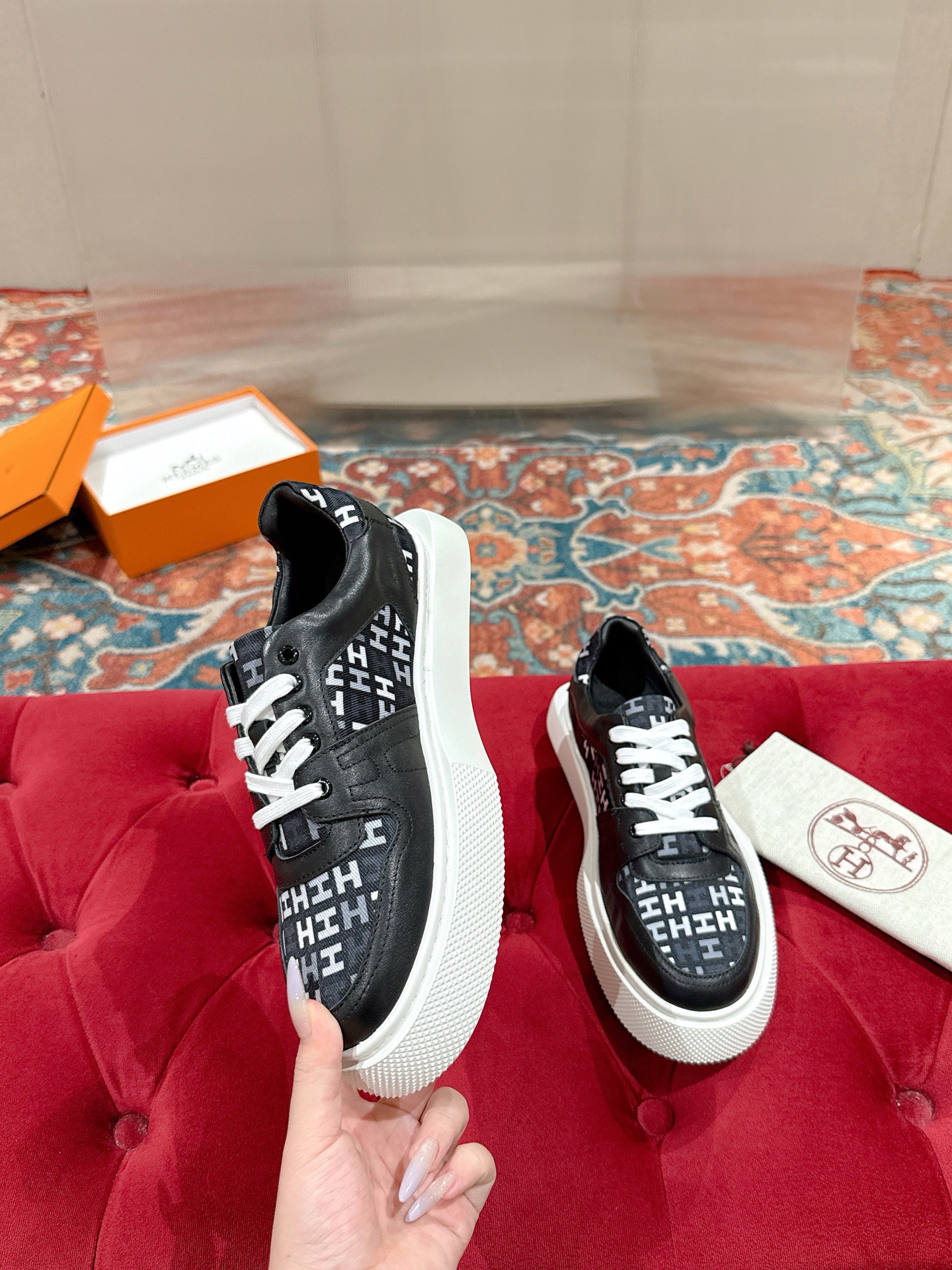 這款鞋子是AAAAA 1:1 質量(非常棒). 使用了和原版一模一樣的材料. 商標部分也保持了和愛馬仕/Hermes一樣. 圖片拍攝是實物鞋子拍攝, 您所收到的實物保證和我們圖片一模一樣.