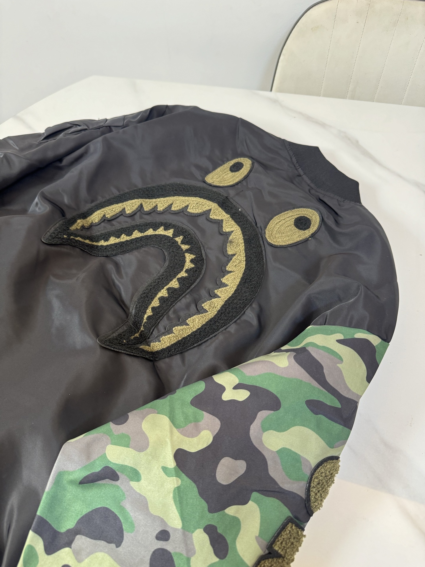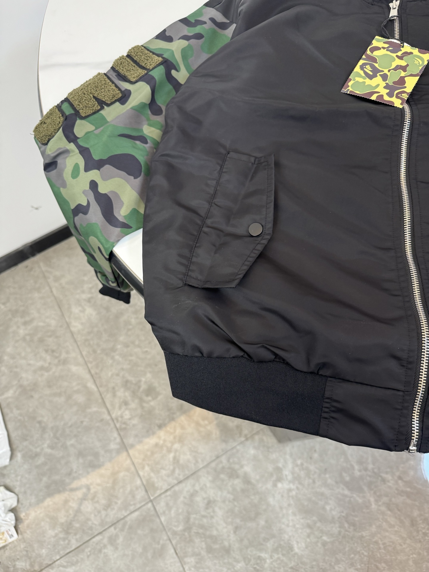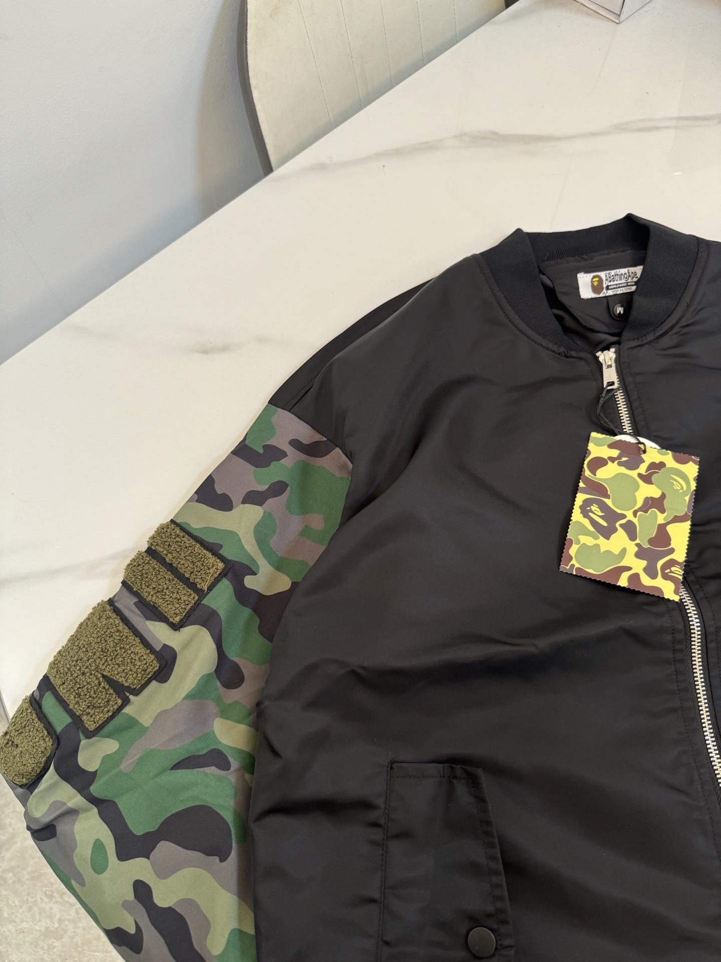這款衣服是AAAAA 1:1 質量(非常棒). 使用了和原版一模一樣的材料. 商標部分也保持了和Bape一樣. 圖片拍攝是實物衣服拍攝, 您所收到的實物保證和我們圖片一模一樣.