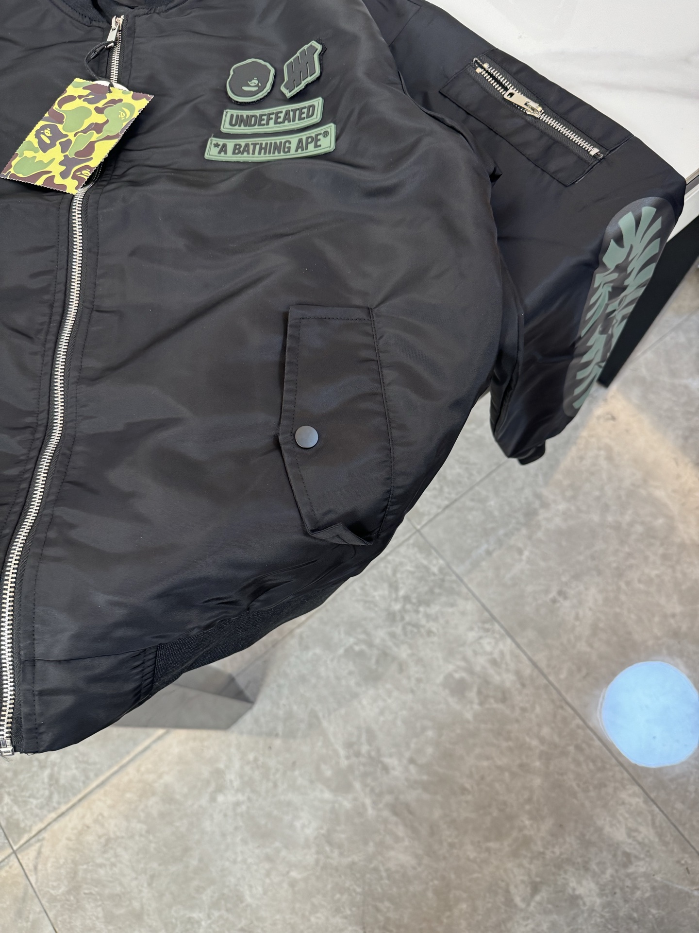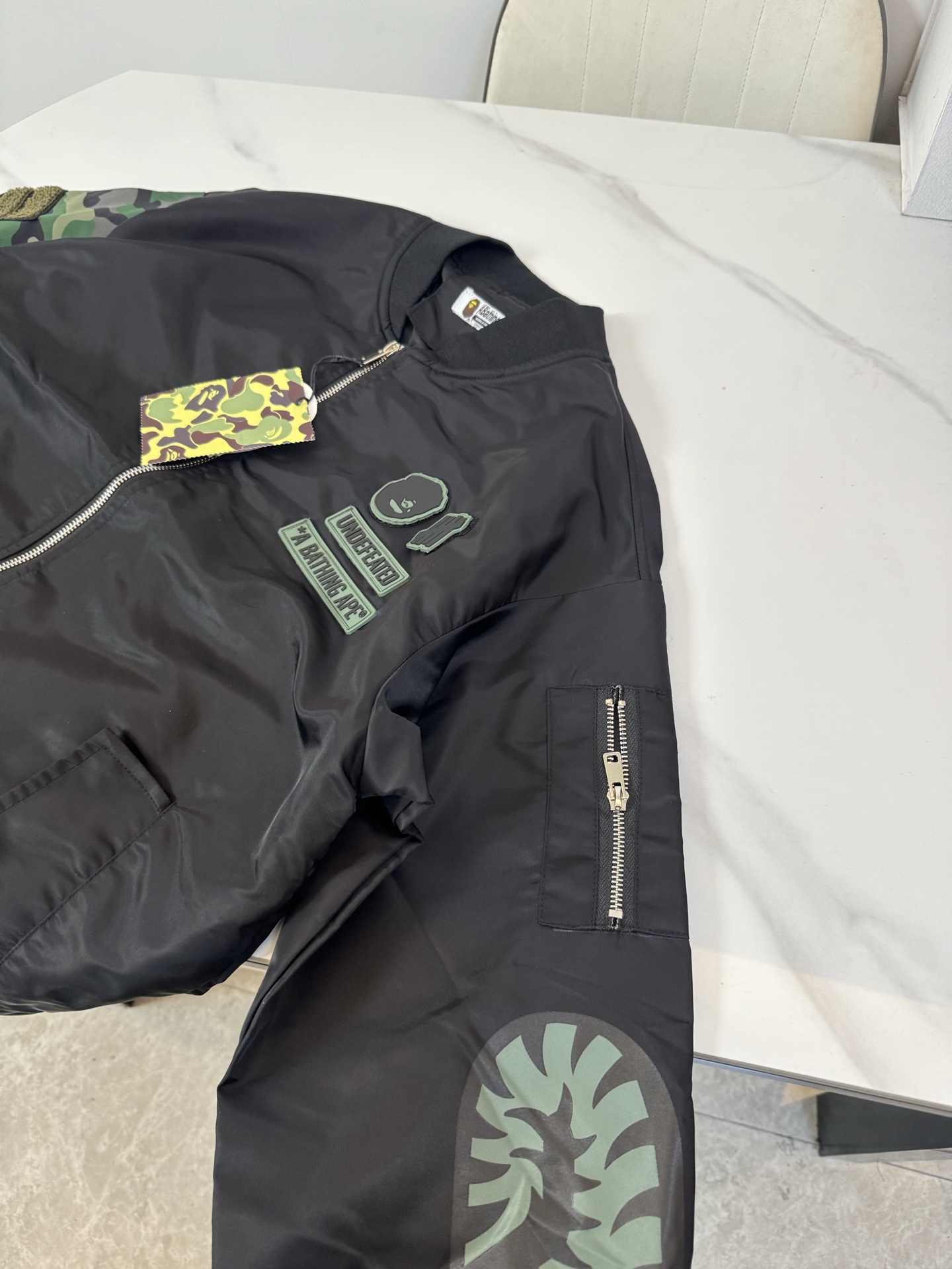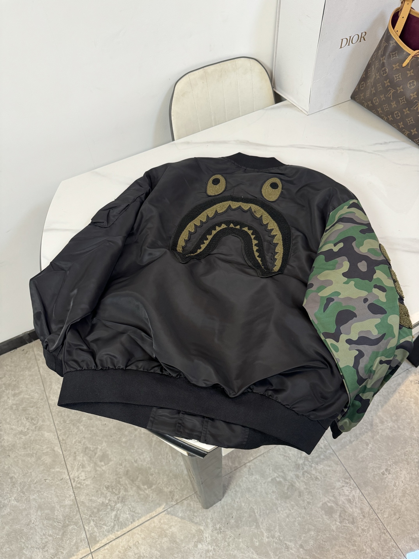 這款衣服是AAAAA 1:1 質量(非常棒). 使用了和原版一模一樣的材料. 商標部分也保持了和Bape一樣. 圖片拍攝是實物衣服拍攝, 您所收到的實物保證和我們圖片一模一樣.