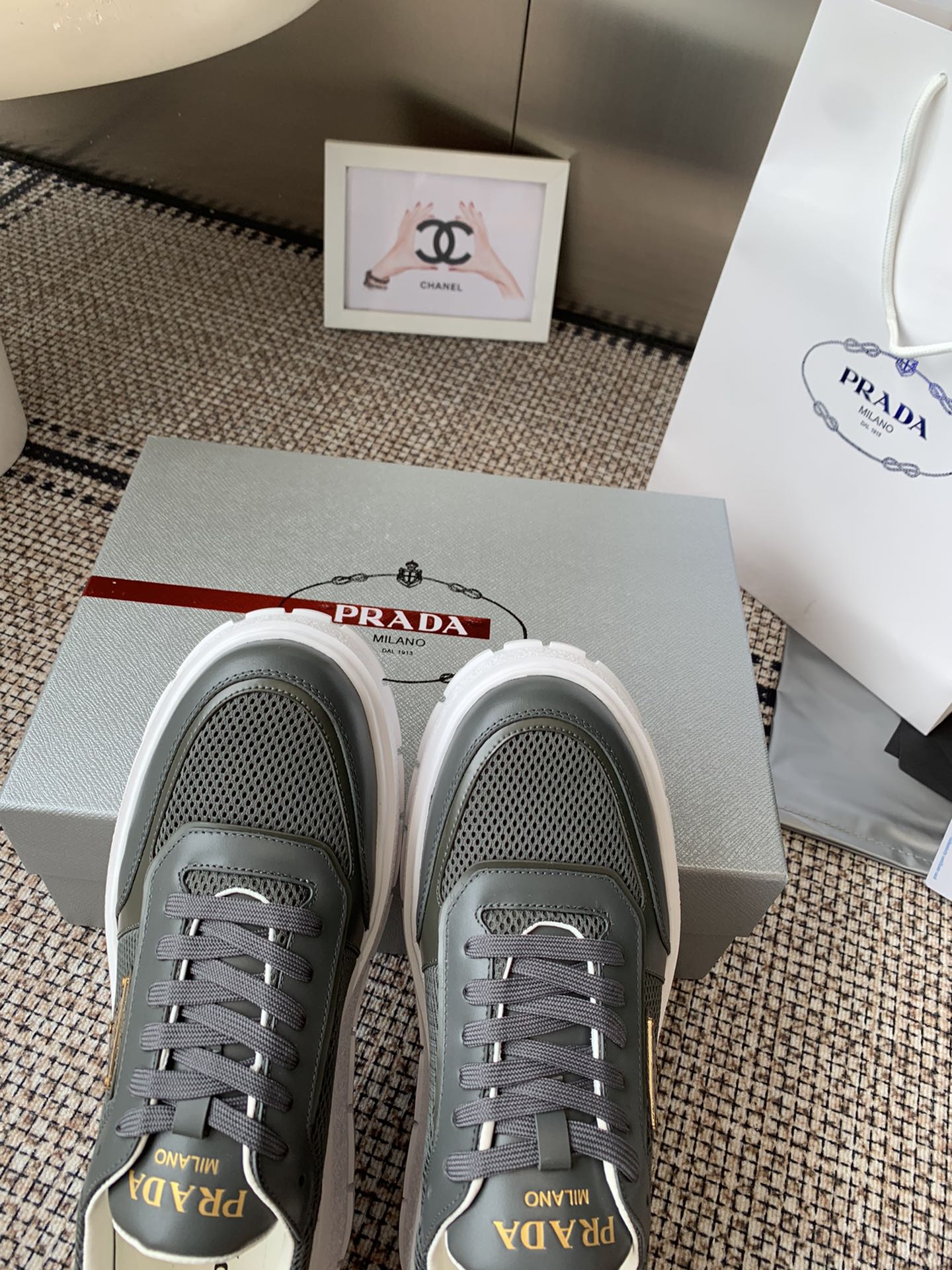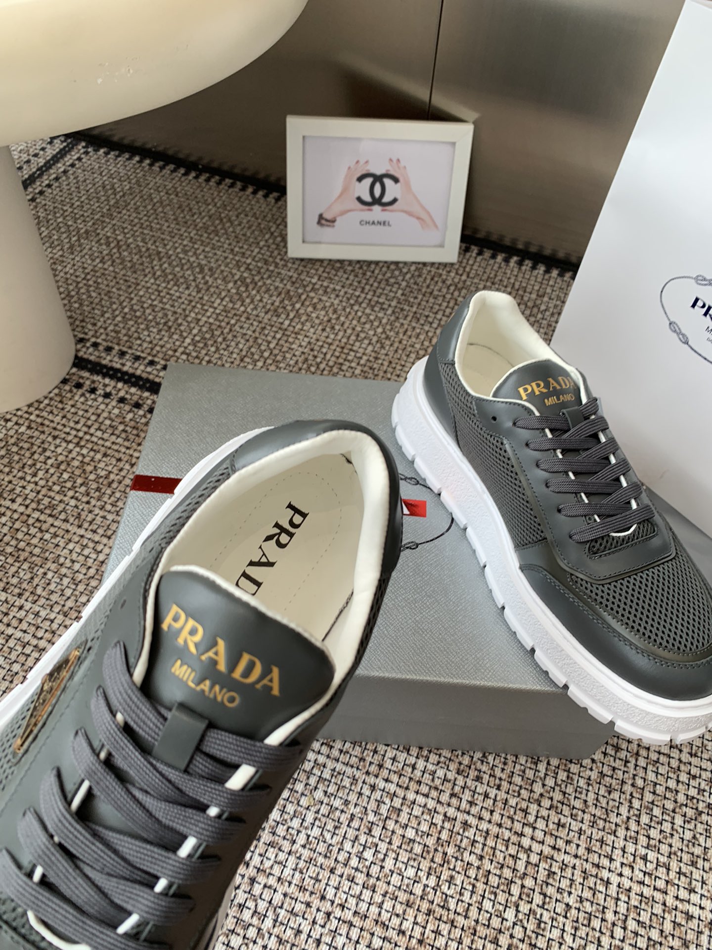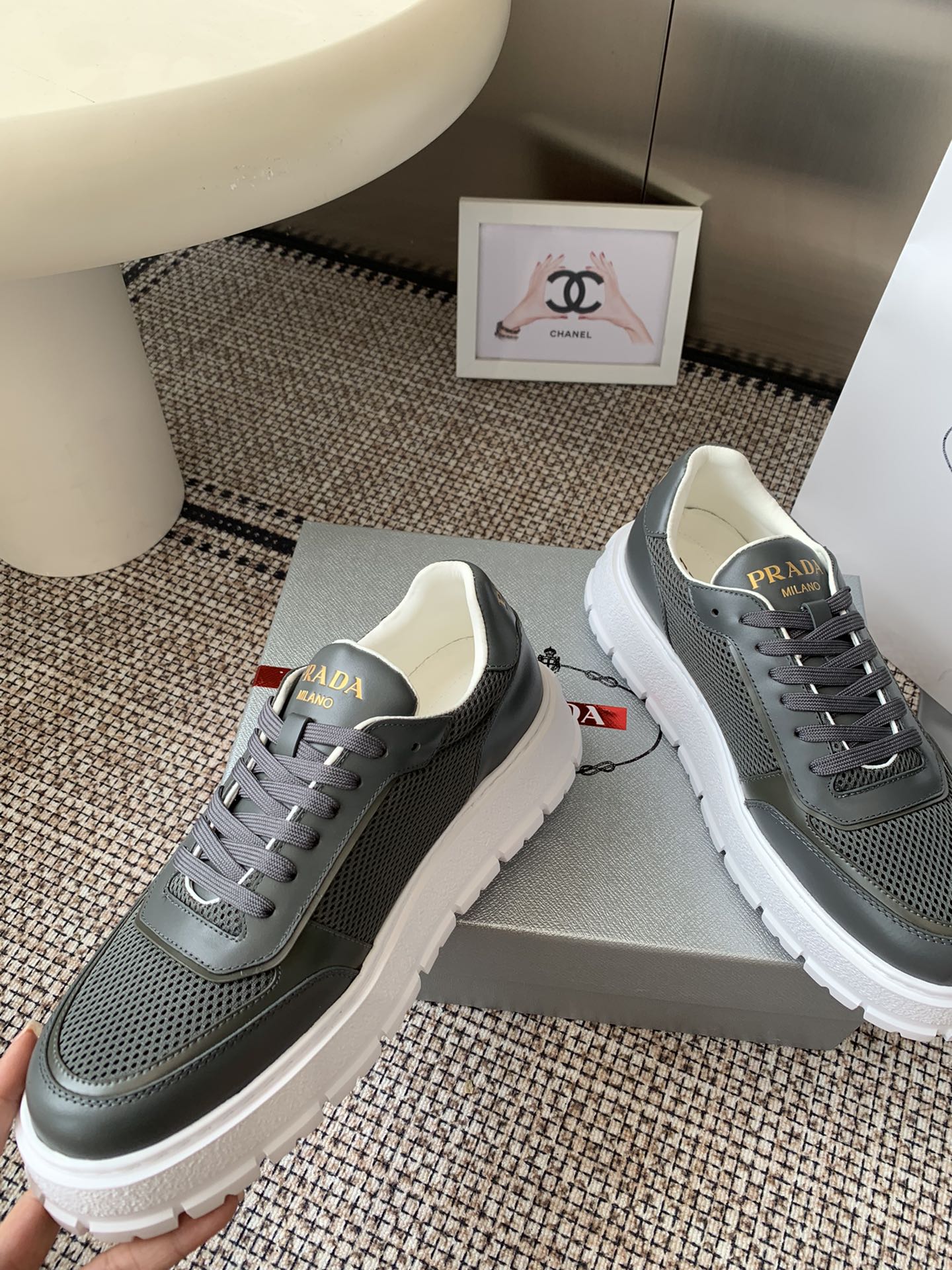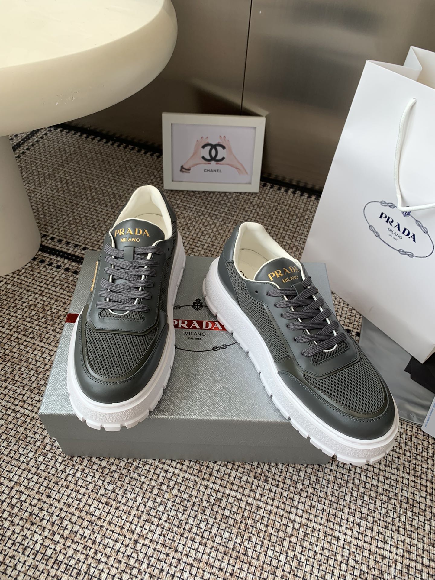 這款鞋子是AAAAA 1:1 質量(非常棒). 使用了和原版一模一樣的材料. 商標部分也保持了和普拉達/Prada一樣. 圖片拍攝是實物鞋子拍攝, 您所收到的實物保證和我們圖片一模一樣.