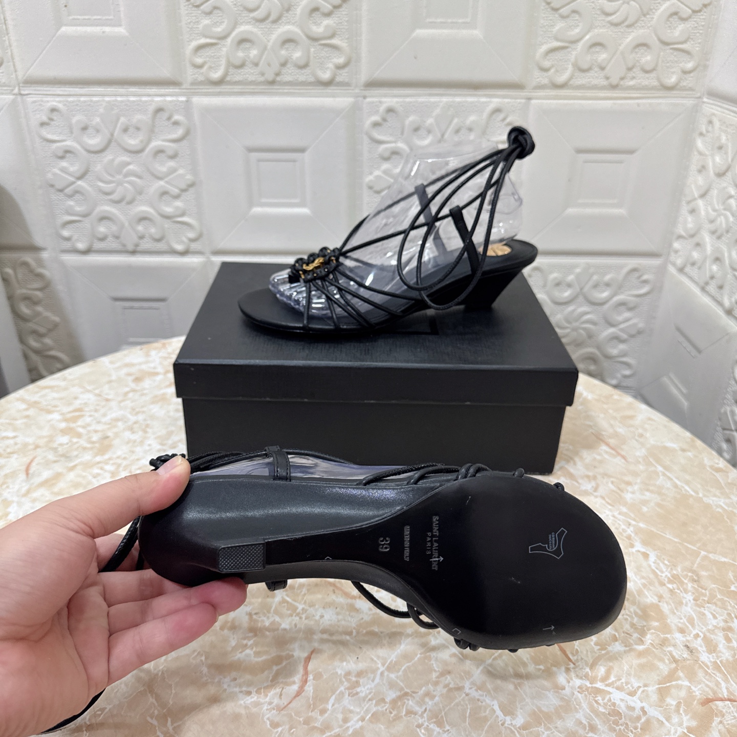 這款鞋子是AAAAA 1:1 質量(非常棒). 使用了和原版一模一樣的材料. 商標部分也保持了和聖羅蘭/Saint Laurent一樣. 圖片拍攝是實物鞋子拍攝, 您所收到的實物保證和我們圖片一模一樣.