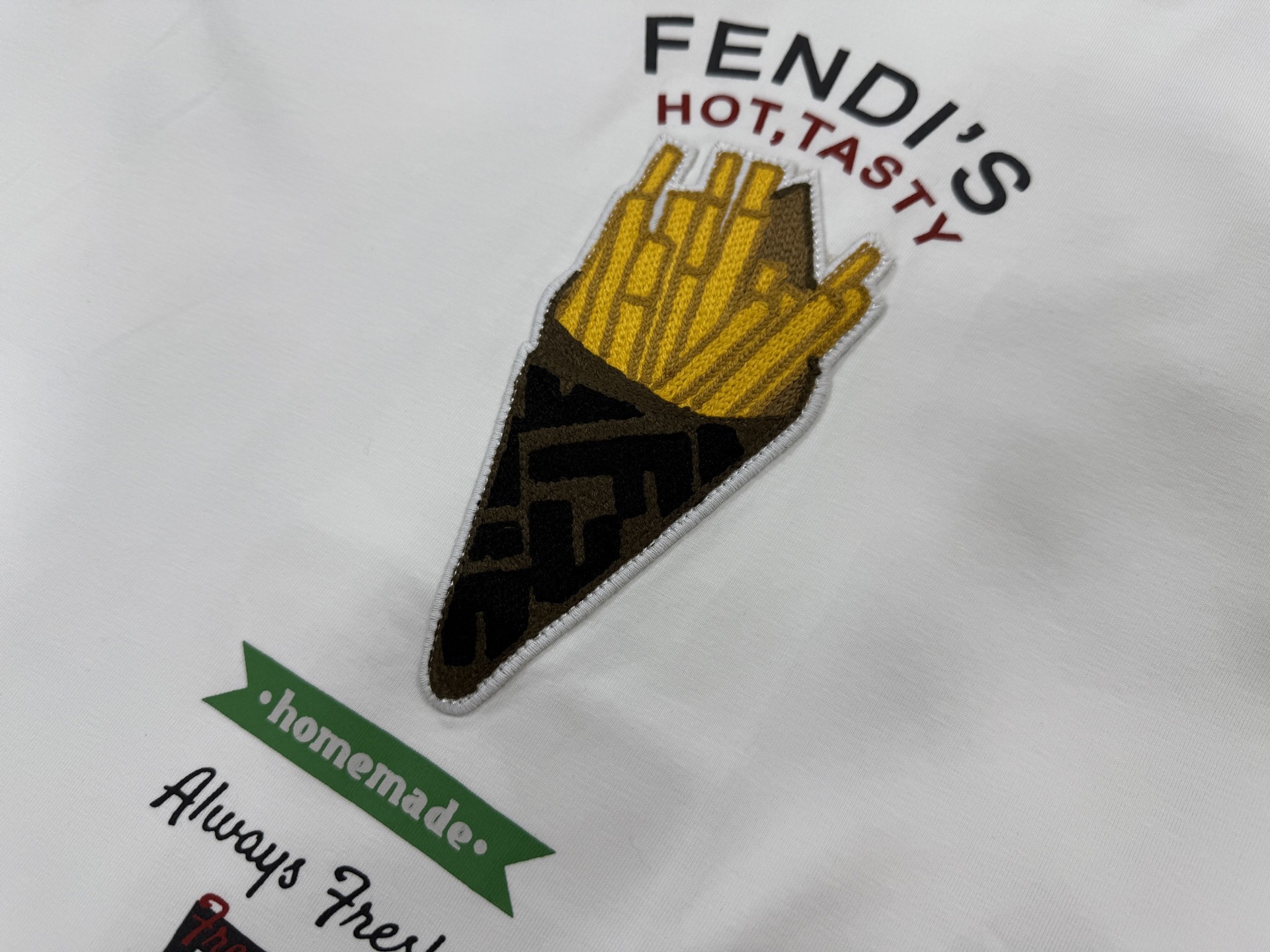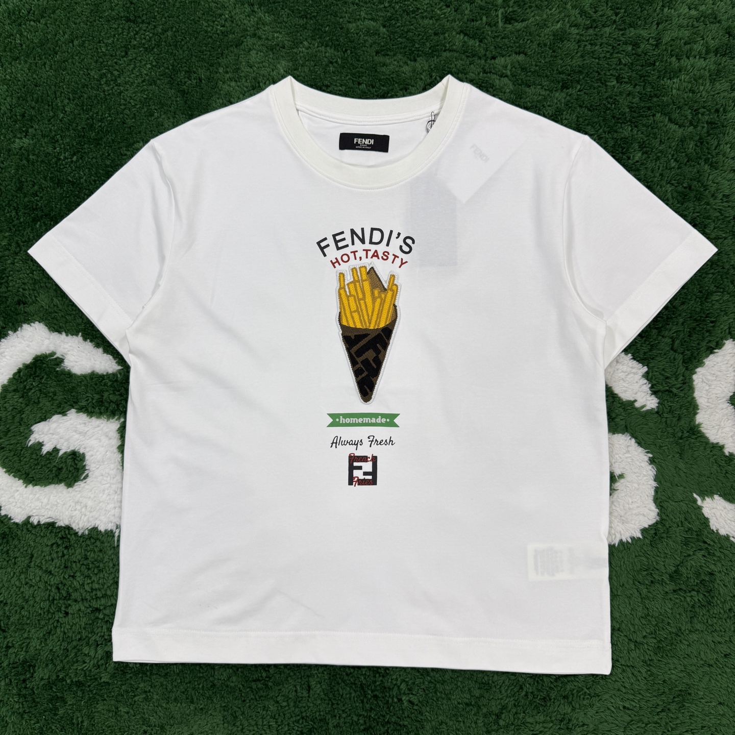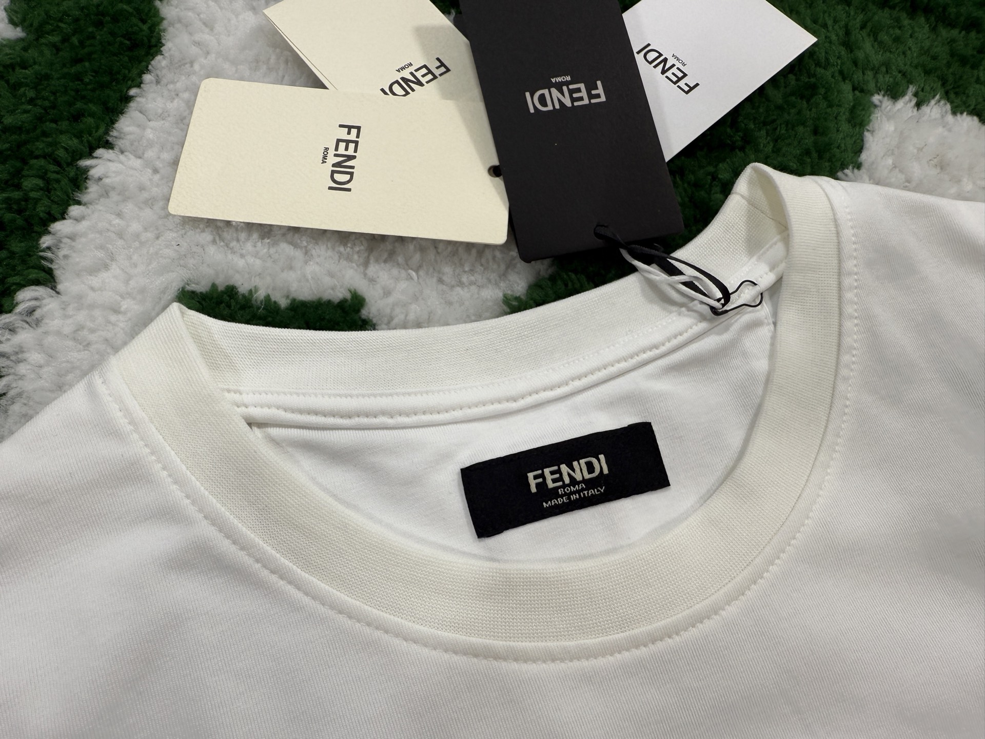 這款衣服是AAAAA 1:1 質量(非常棒). 使用了和原版一模一樣的材料. 商標部分也保持了和芬迪/Fendi一樣. 圖片拍攝是實物衣服拍攝, 您所收到的實物保證和我們圖片一模一樣.