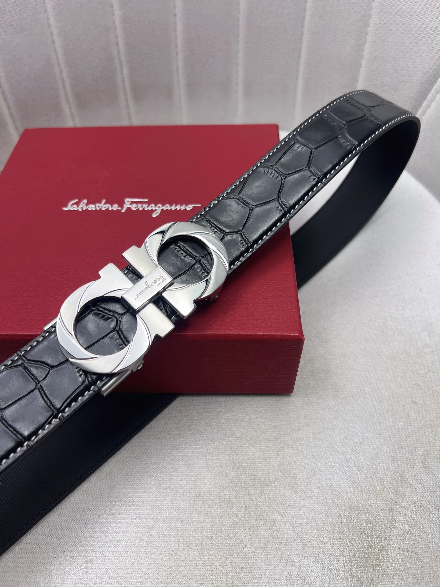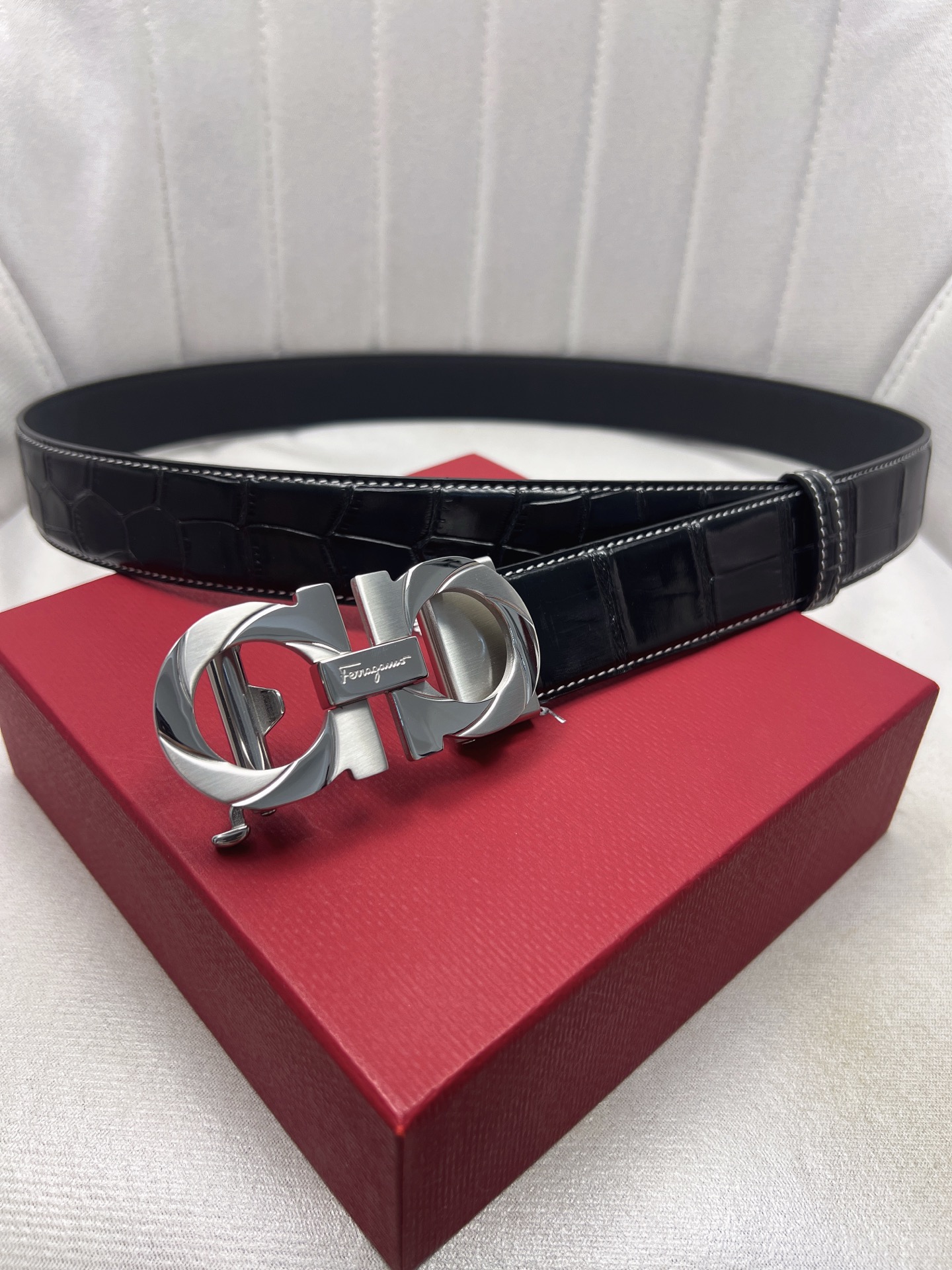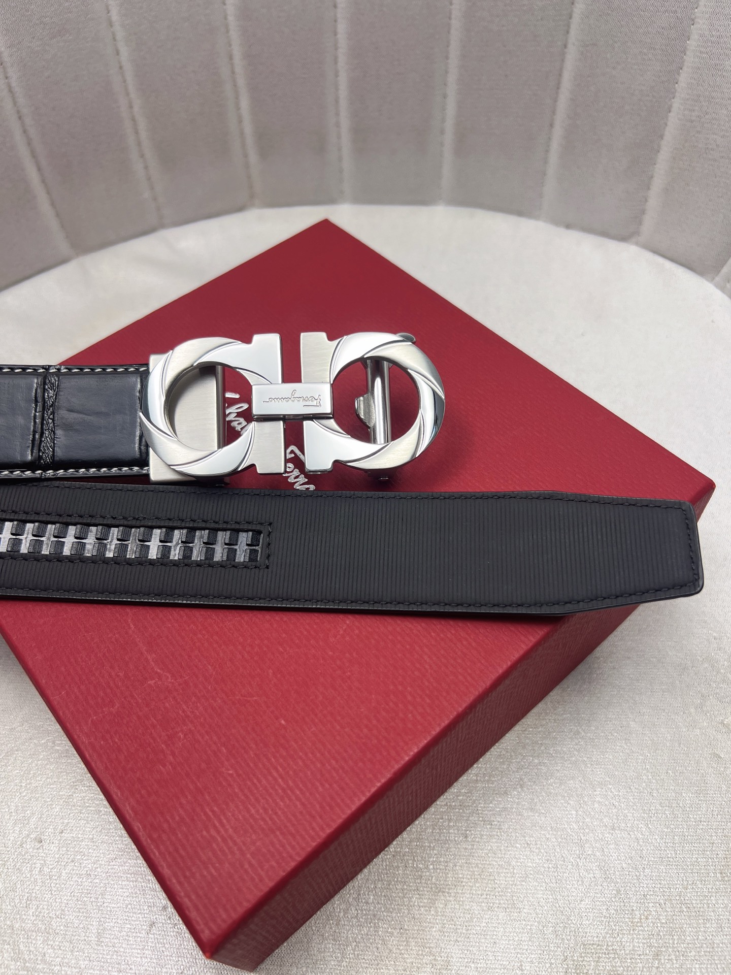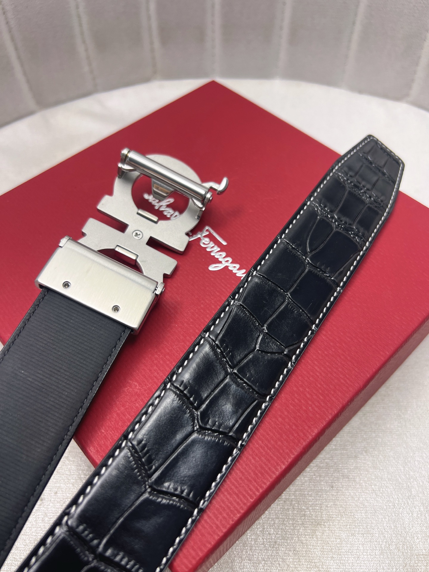 這款皮帶是AAAAA 1:1 質量(非常棒). 使用了和原版一模一樣的材料. 商標部分也保持了和菲拉格慕/Salvatore Ferragamo一樣. 圖片拍攝是實物皮帶拍攝, 您所收到的實物保證和我們圖片一模一樣.
