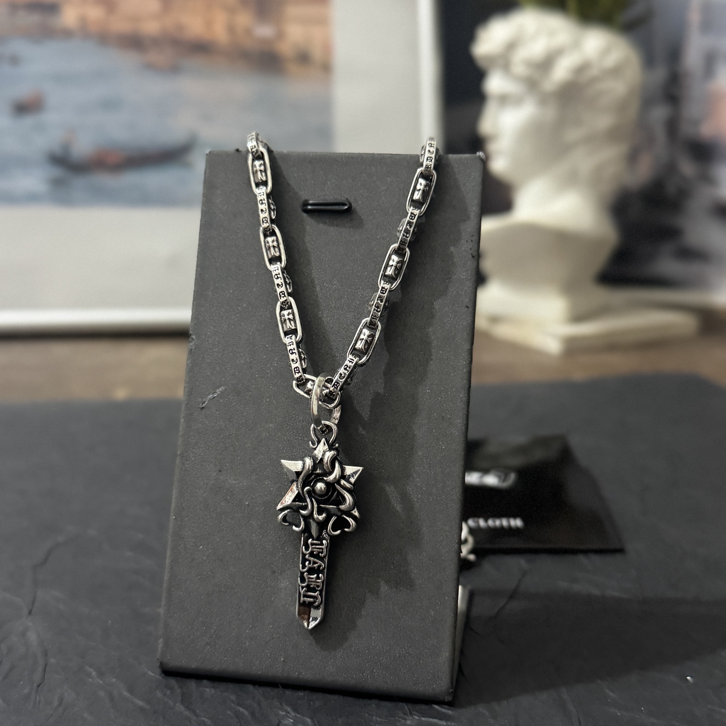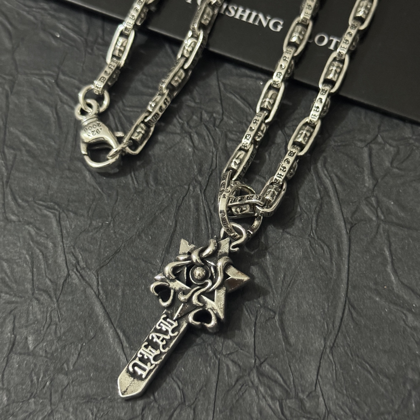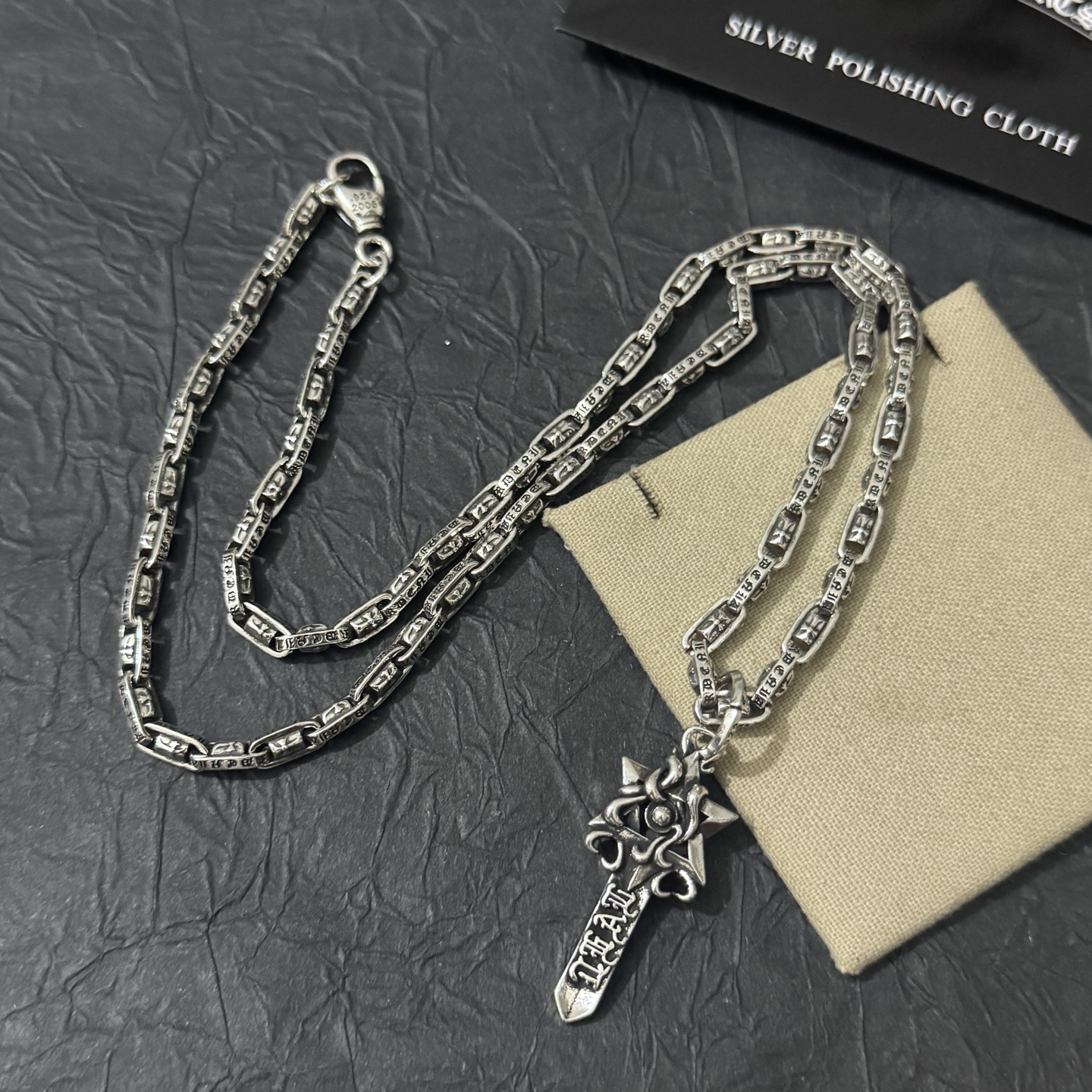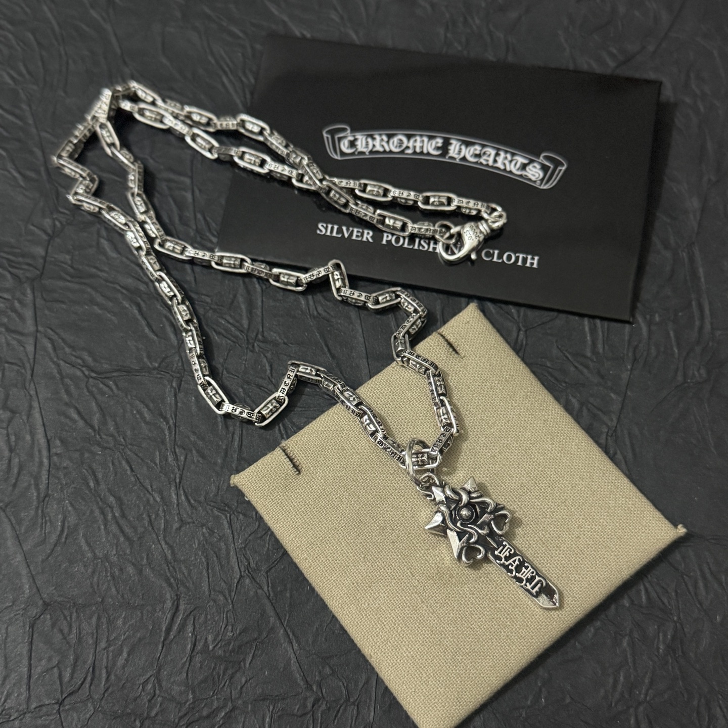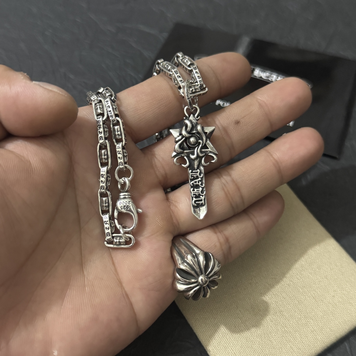 這款首飾是AAAAA 1:1 質量(非常棒). 使用了和原版一模一樣的材料. 商標部分也保持了和鉻心/Chrome Hearts一樣. 圖片拍攝是實物首飾拍攝, 您所收到的實物保證和我們圖片一模一樣.