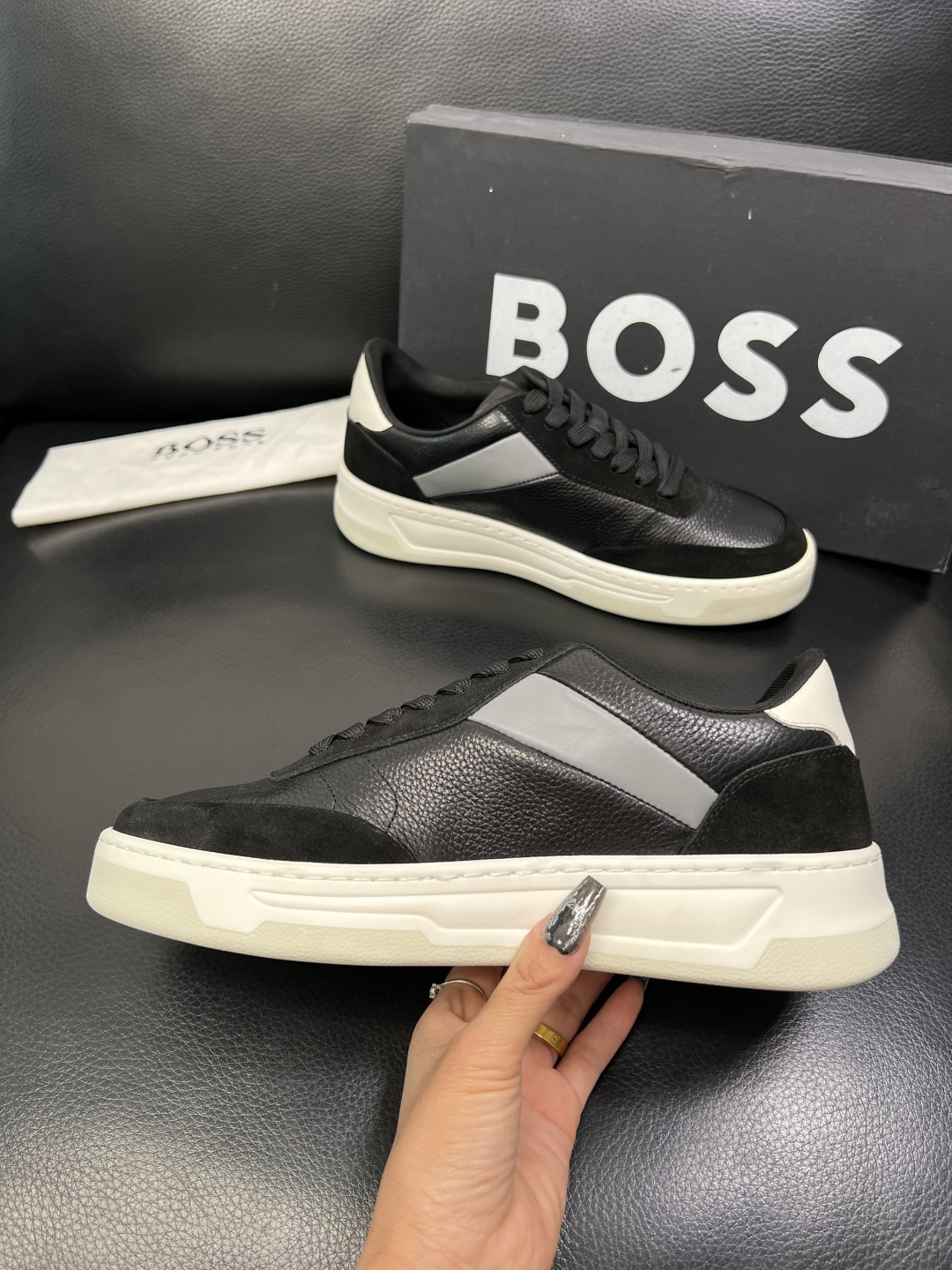 這款鞋子是AAAAA 1:1 質量(非常棒). 使用了和原版一模一樣的材料. 商標部分也保持了和BOSS一樣. 圖片拍攝是實物鞋子拍攝, 您所收到的實物保證和我們圖片一模一樣.