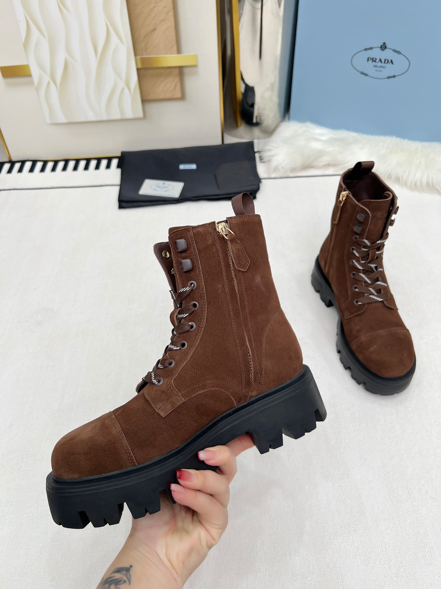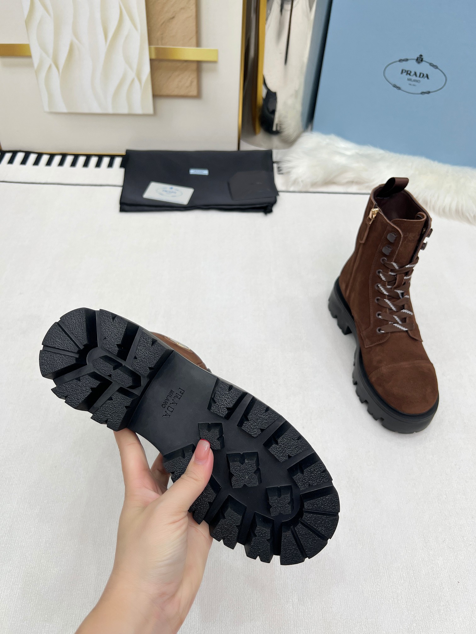 這款鞋子是AAAAA 1:1 質量(非常棒). 使用了和原版一模一樣的材料. 商標部分也保持了和普拉達/Prada一樣. 圖片拍攝是實物鞋子拍攝, 您所收到的實物保證和我們圖片一模一樣.