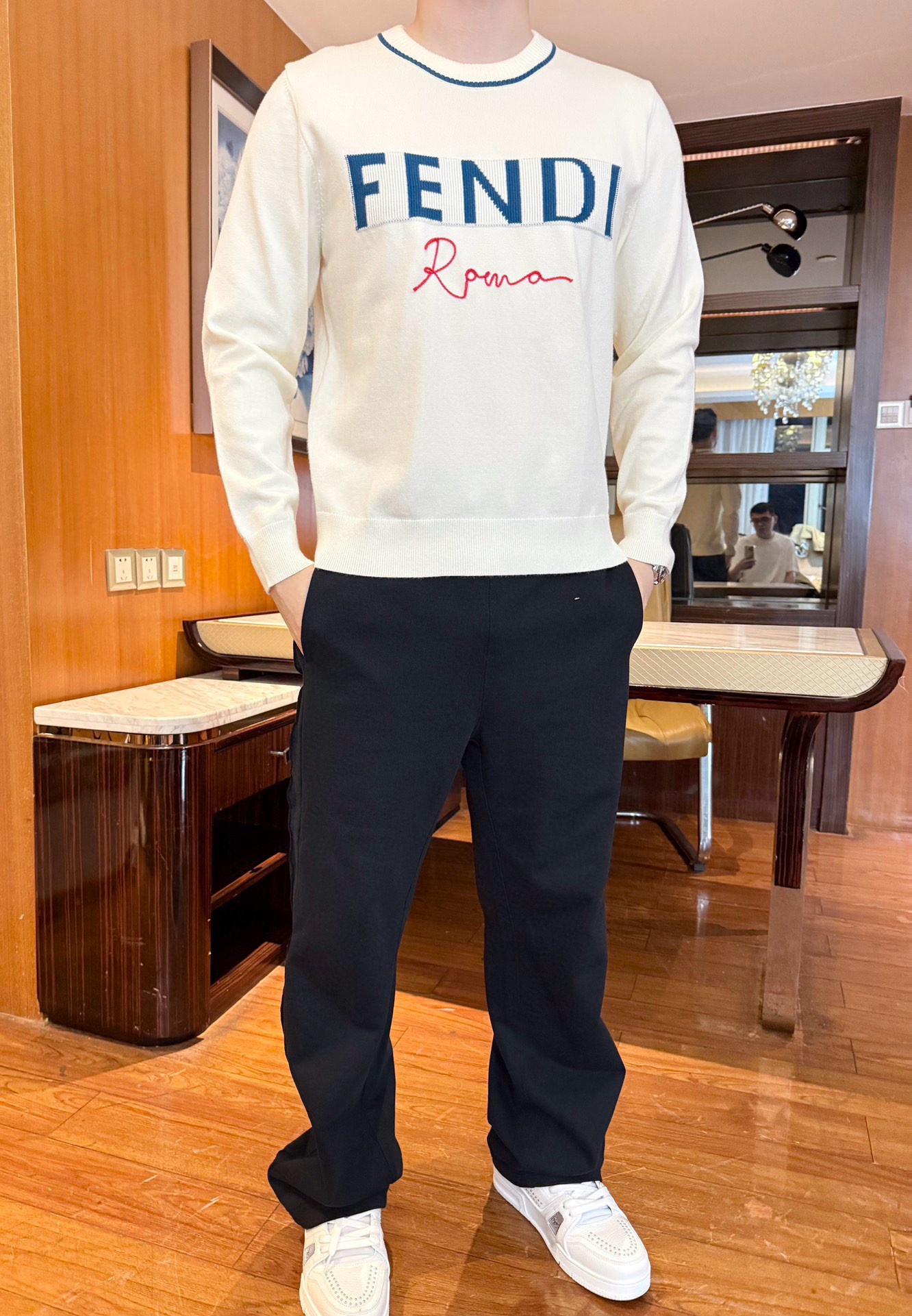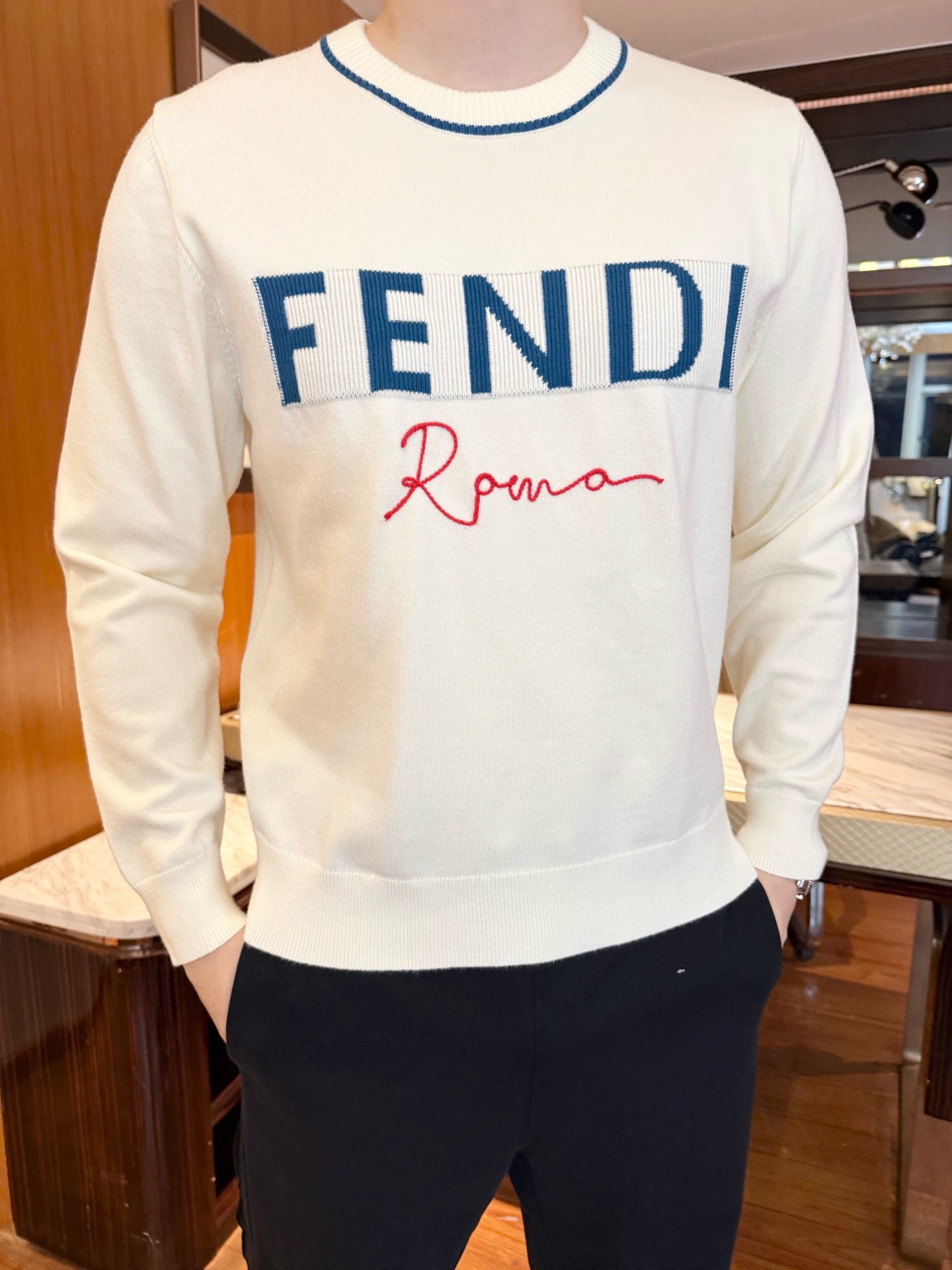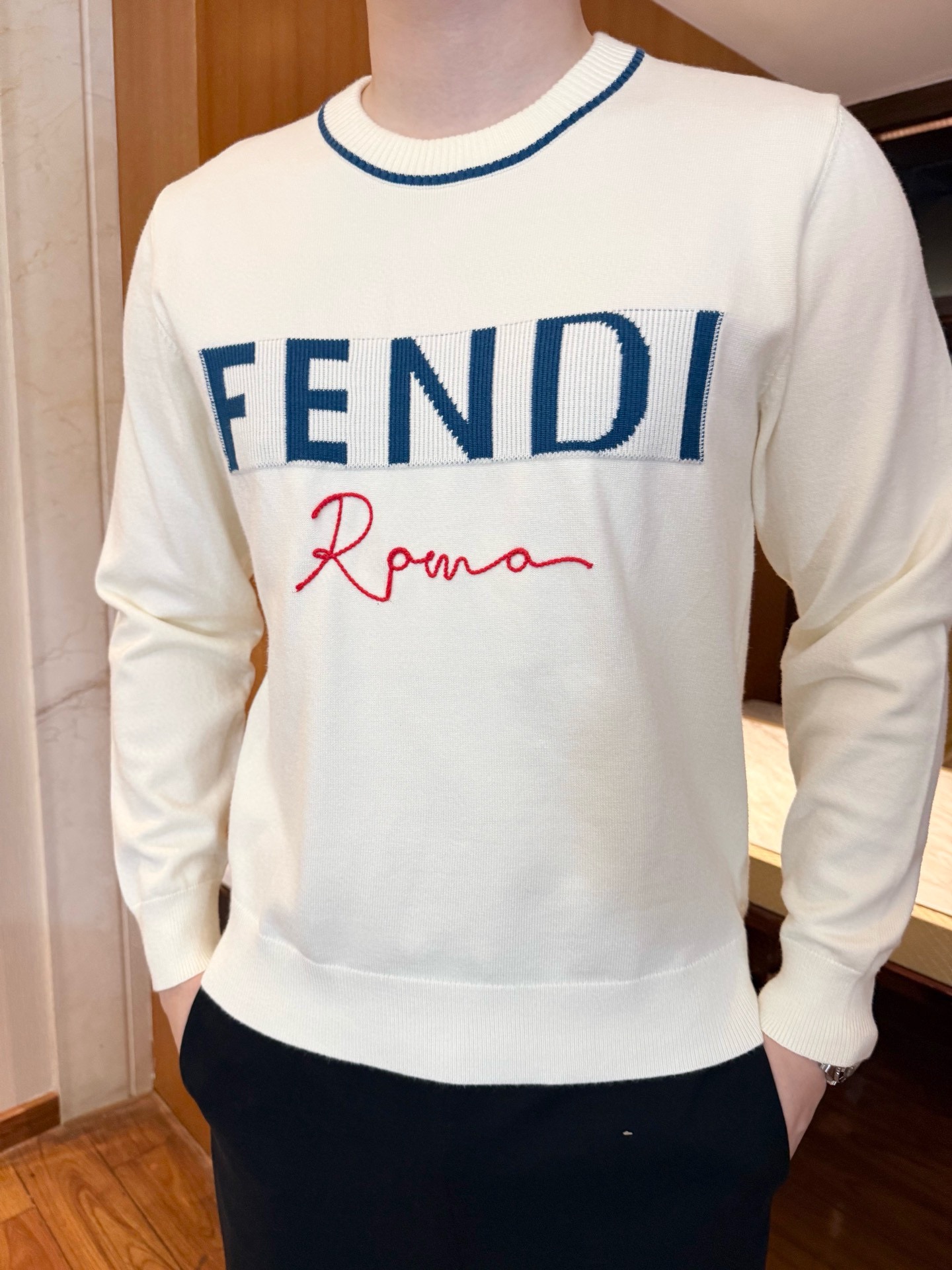 這款衣服是AAAAA 1:1 質量(非常棒). 使用了和原版一模一樣的材料. 商標部分也保持了和芬迪/Fendi一樣. 圖片拍攝是實物衣服拍攝, 您所收到的實物保證和我們圖片一模一樣.