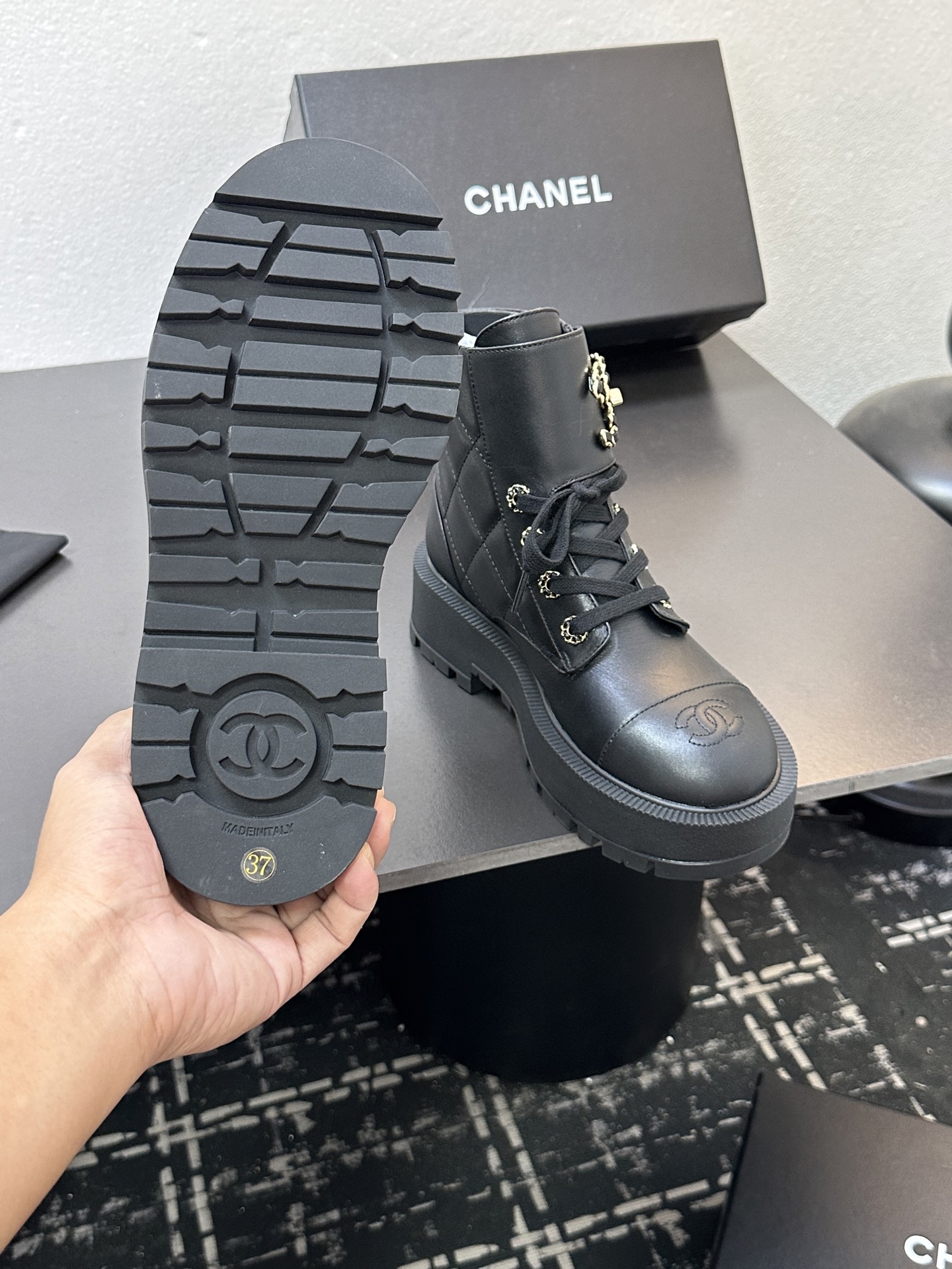 這款鞋子是AAAAA 1:1 質量(非常棒). 使用了和原版一模一樣的材料. 商標部分也保持了和香奈兒/Chanel一樣. 圖片拍攝是實物鞋子拍攝, 您所收到的實物保證和我們圖片一模一樣.