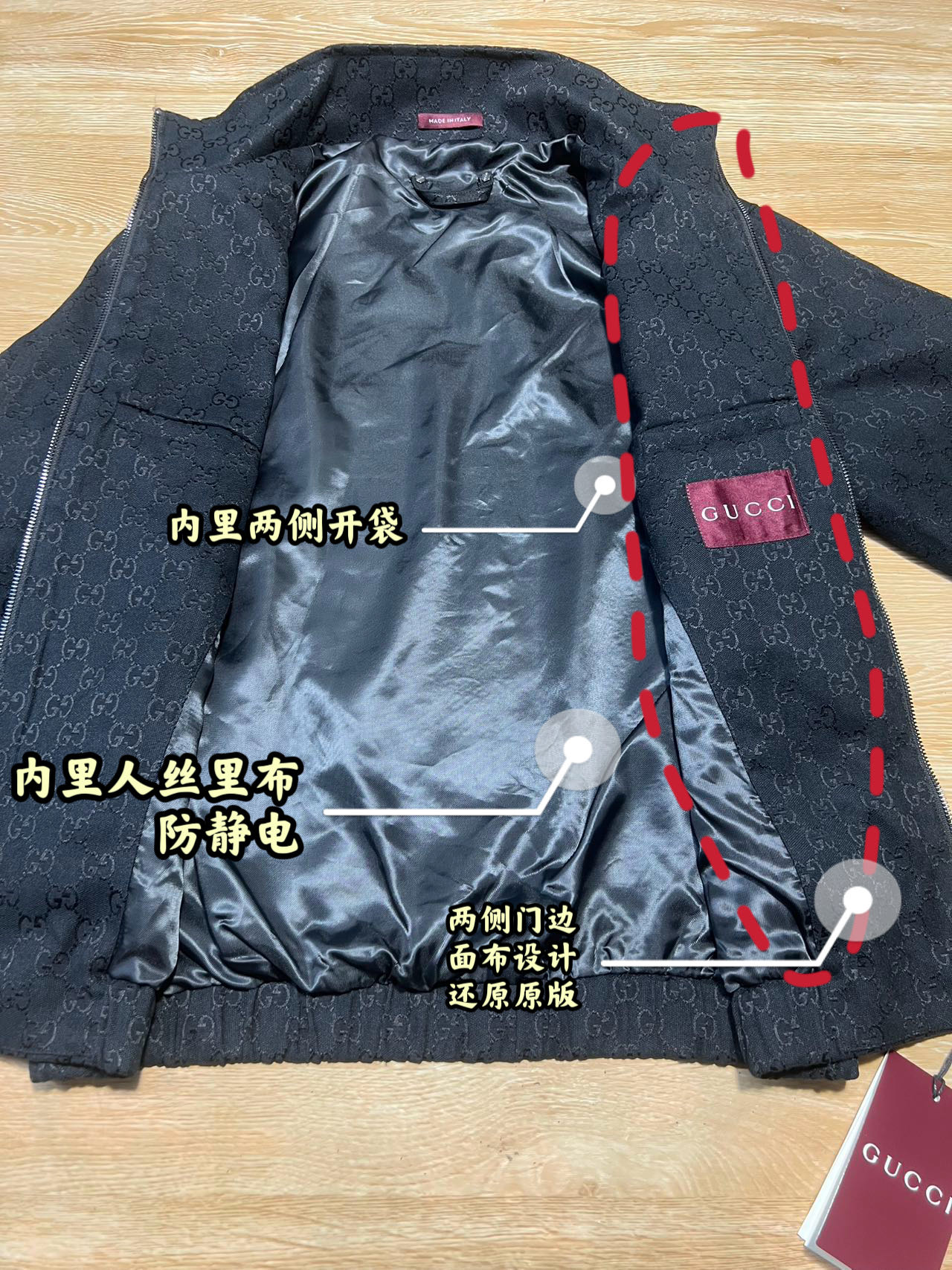 這款衣服是AAAAA 1:1 質量(非常棒). 使用了和原版一模一樣的材料. 商標部分也保持了和古奇/Gucci一樣. 圖片拍攝是實物衣服拍攝, 您所收到的實物保證和我們圖片一模一樣.