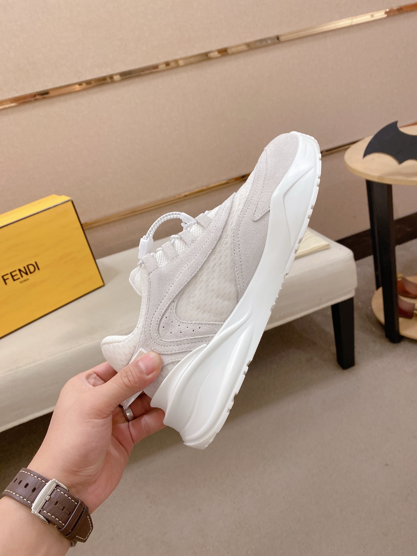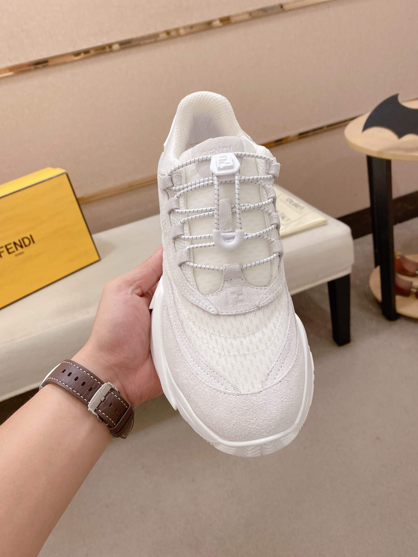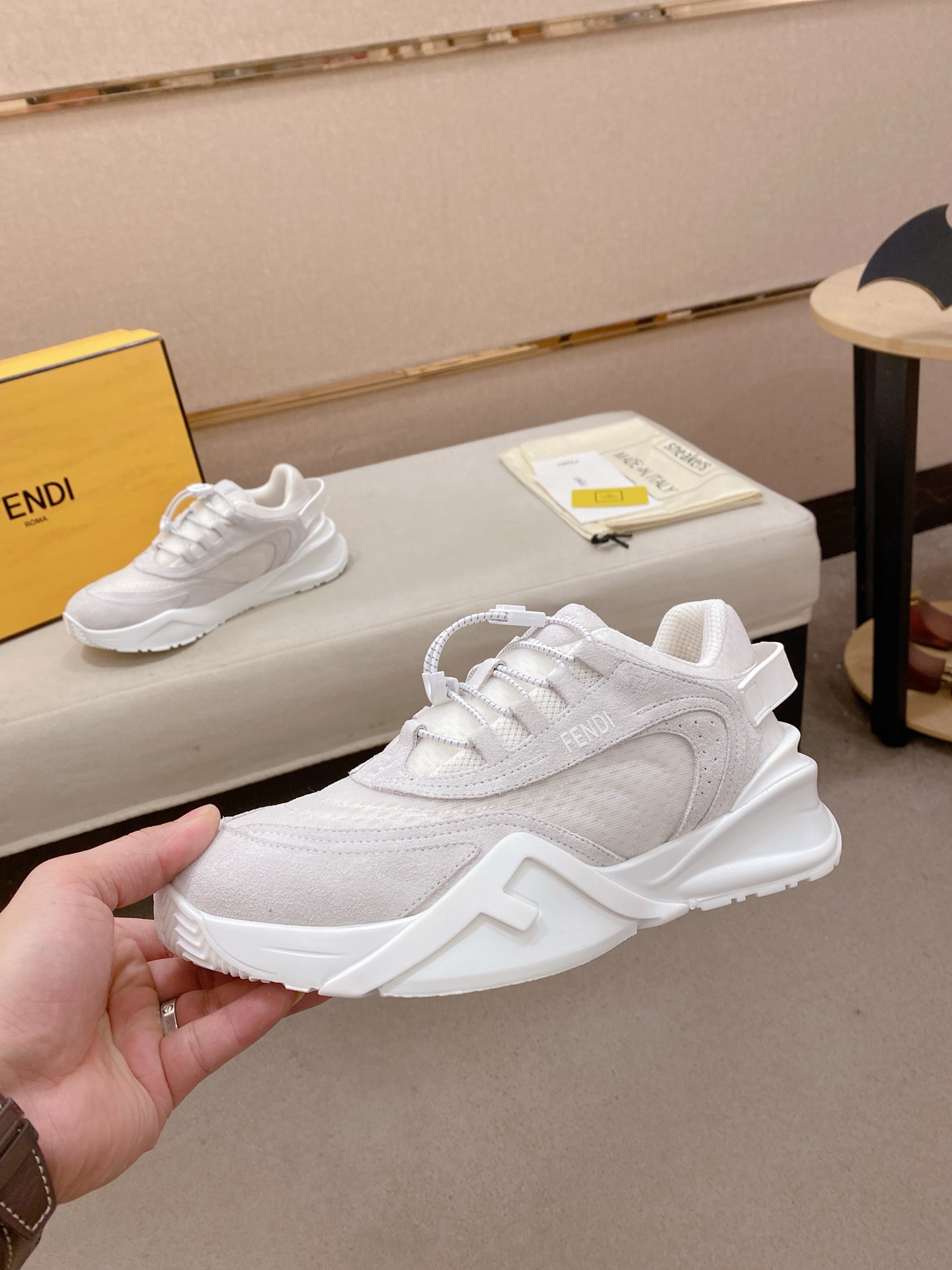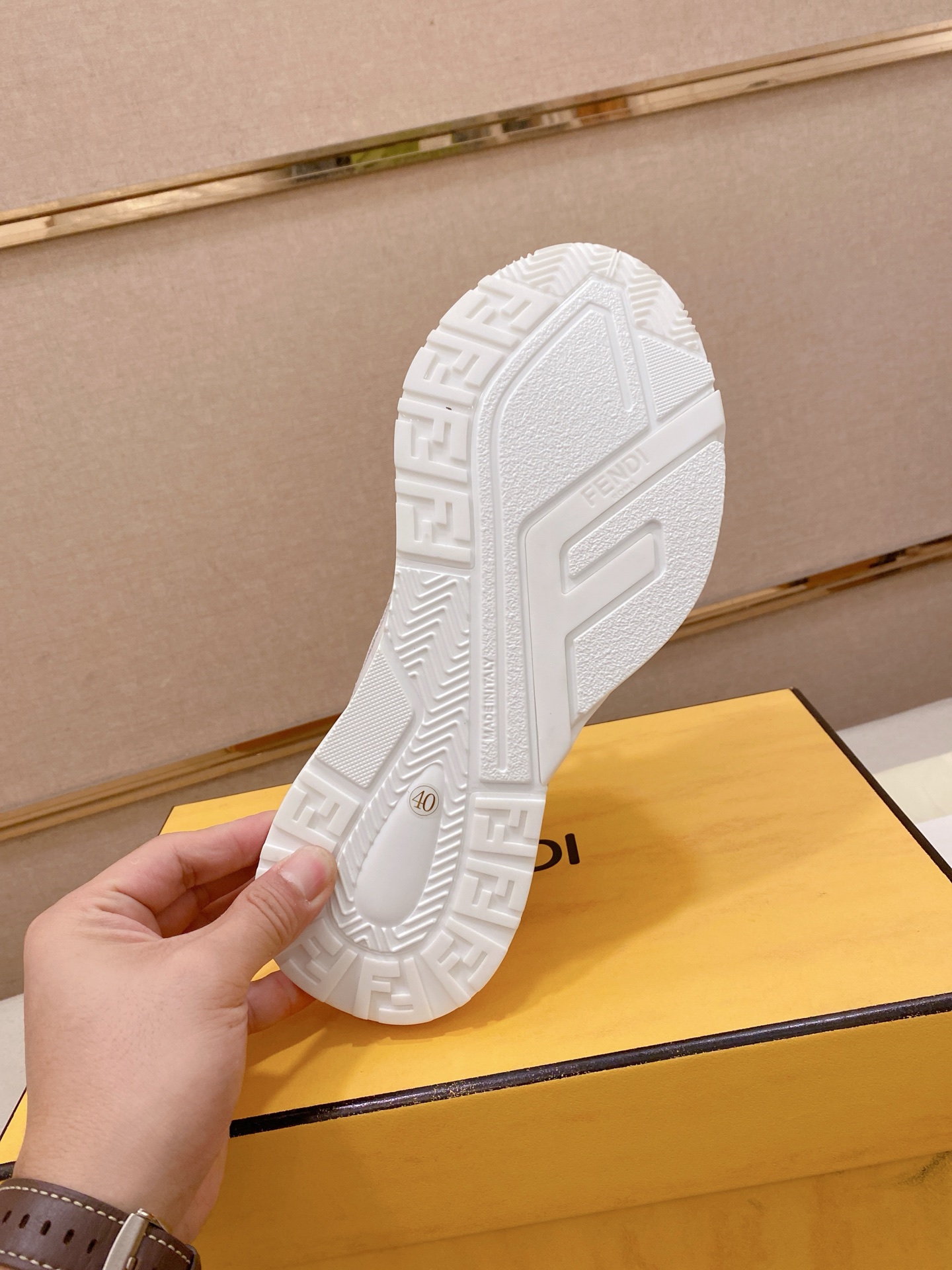 這款鞋子是AAAAA 1:1 質量(非常棒). 使用了和原版一模一樣的材料. 商標部分也保持了和芬迪/Fendi一樣. 圖片拍攝是實物鞋子拍攝, 您所收到的實物保證和我們圖片一模一樣.