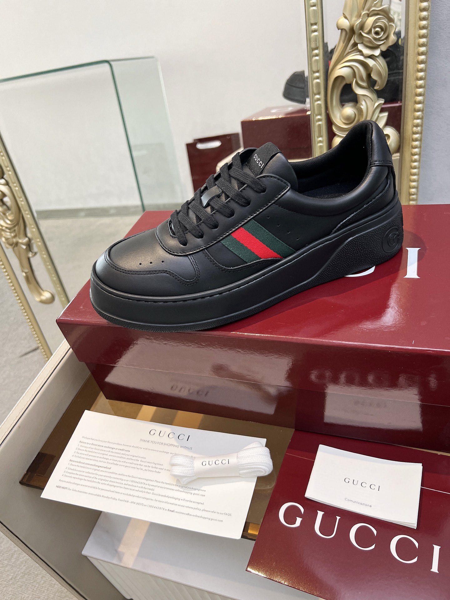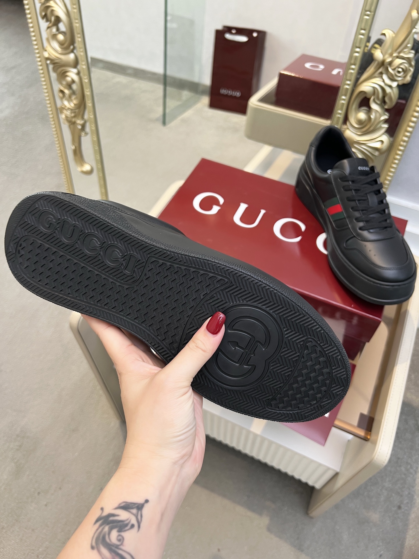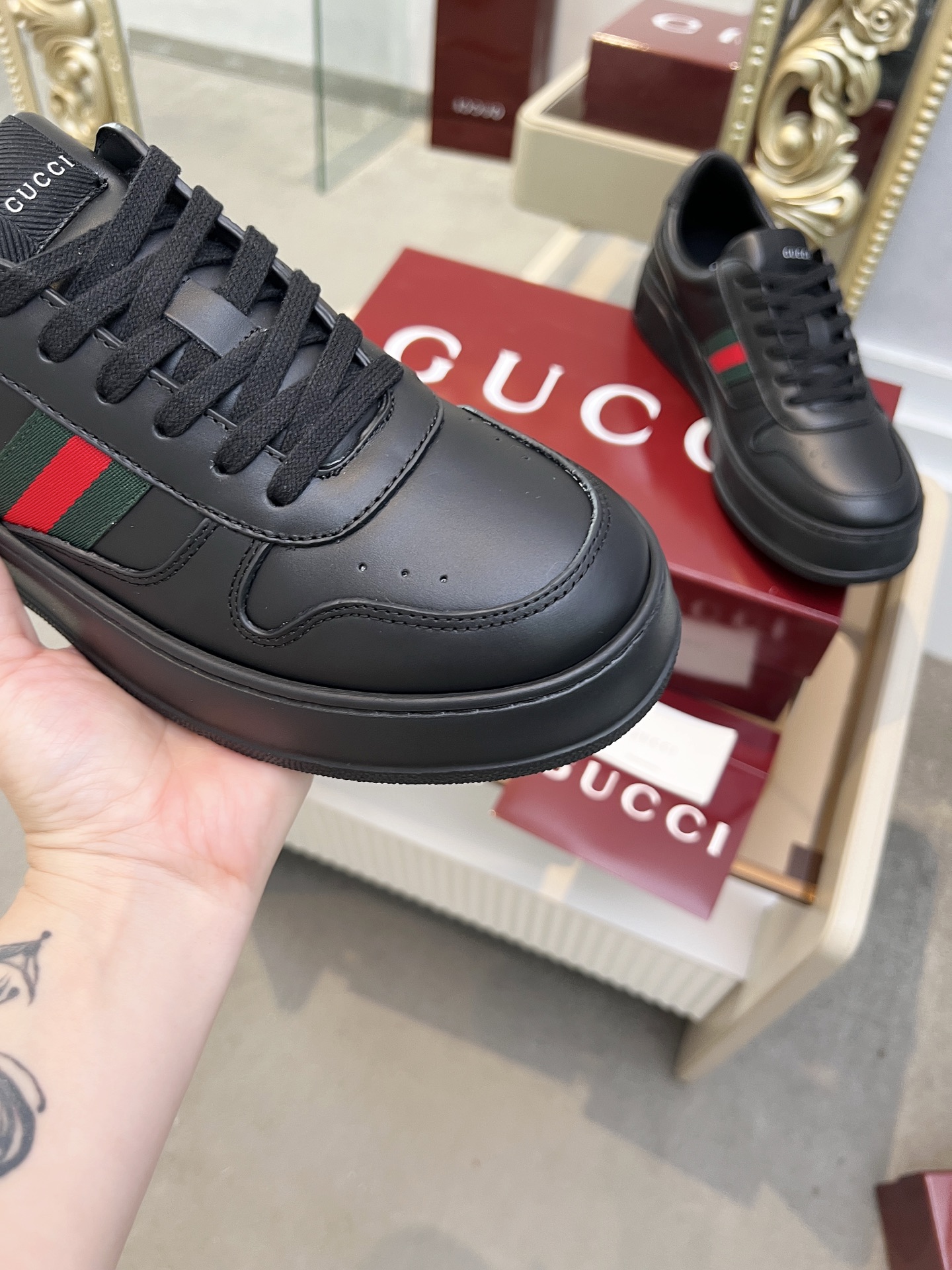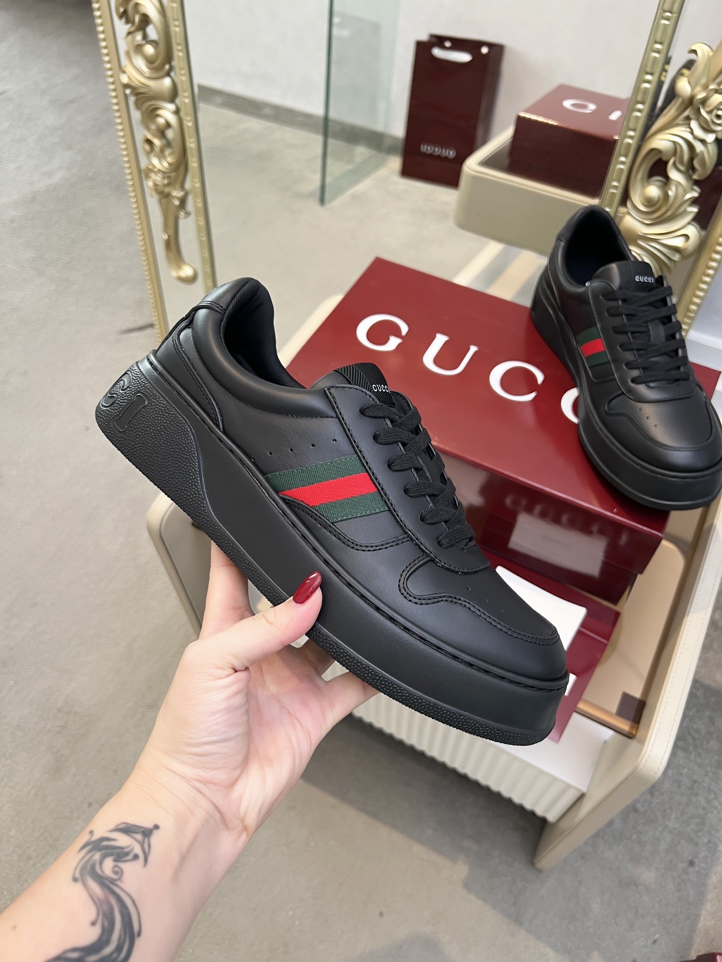 這款鞋子是AAAAA 1:1 質量(非常棒). 使用了和原版一模一樣的材料. 商標部分也保持了和古奇/Gucci一樣. 圖片拍攝是實物鞋子拍攝, 您所收到的實物保證和我們圖片一模一樣.