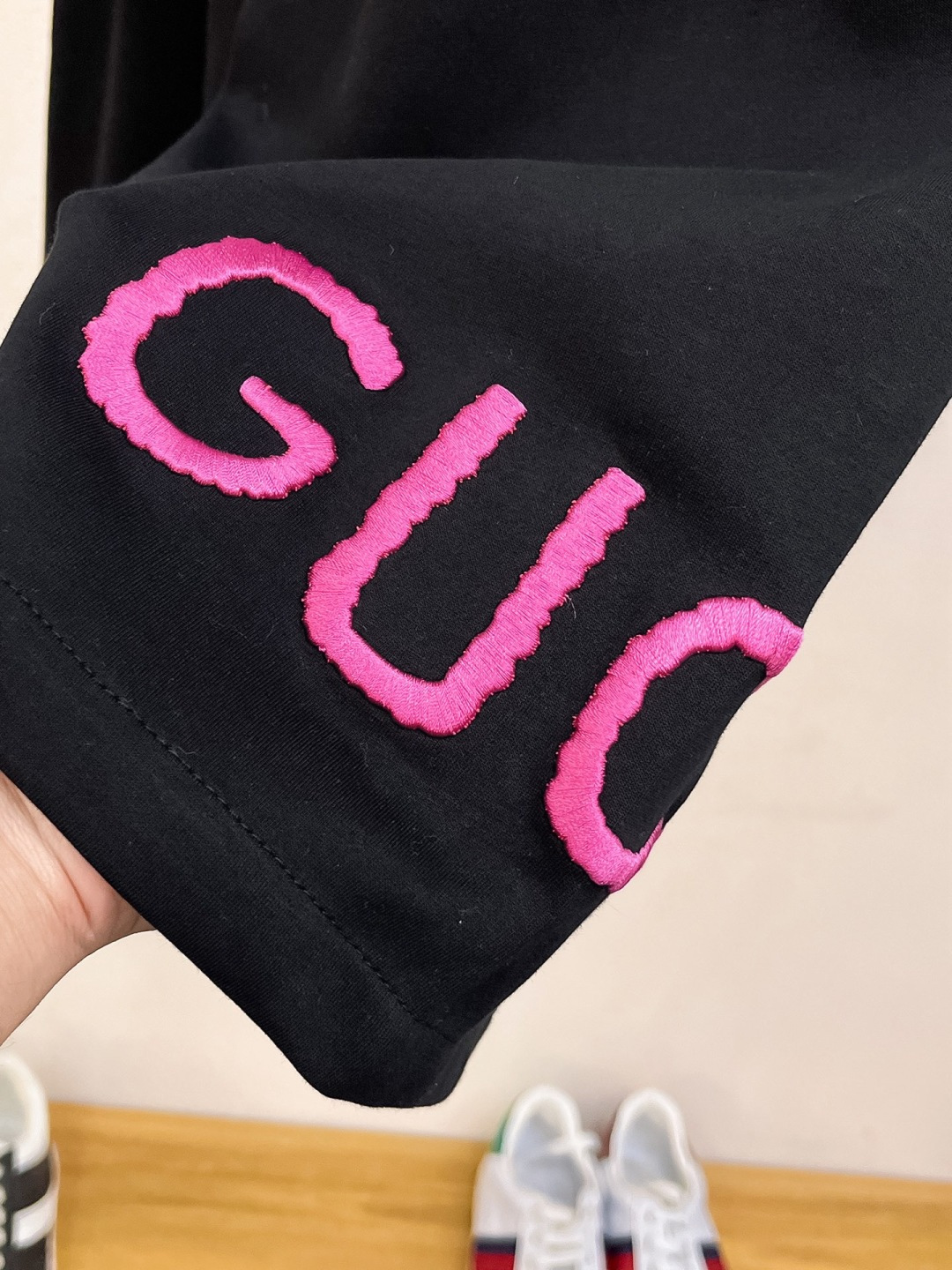 這款衣服是AAAAA 1:1 質量(非常棒). 使用了和原版一模一樣的材料. 商標部分也保持了和古奇/Gucci一樣. 圖片拍攝是實物衣服拍攝, 您所收到的實物保證和我們圖片一模一樣.