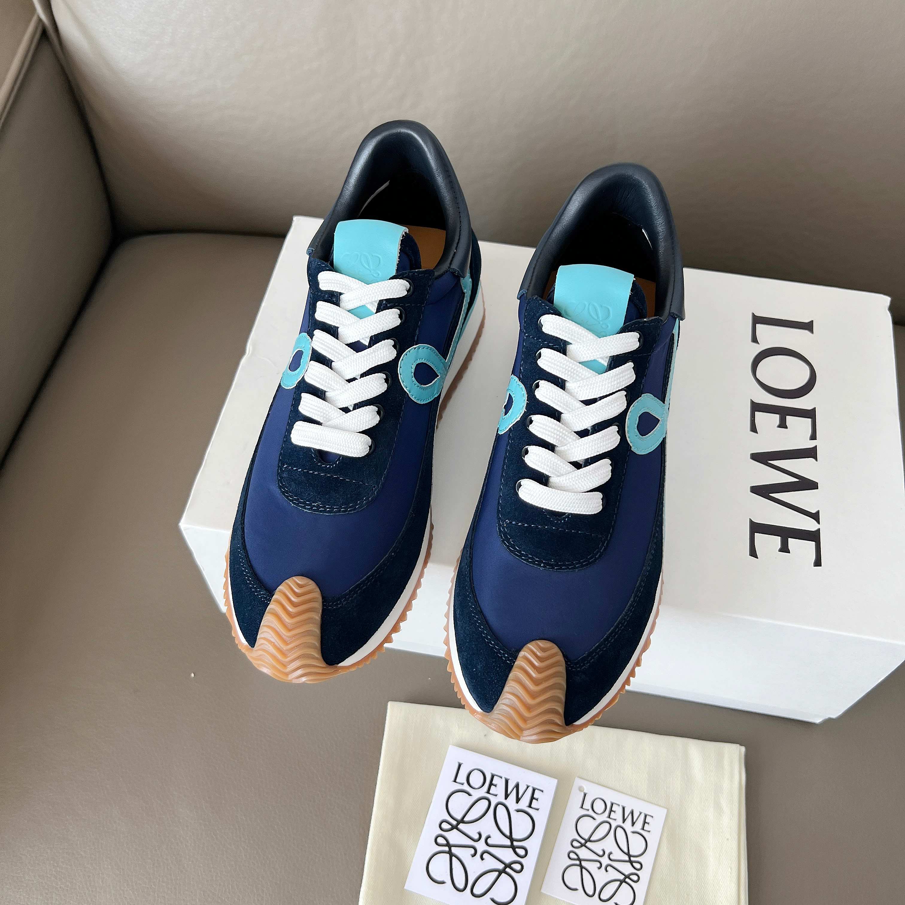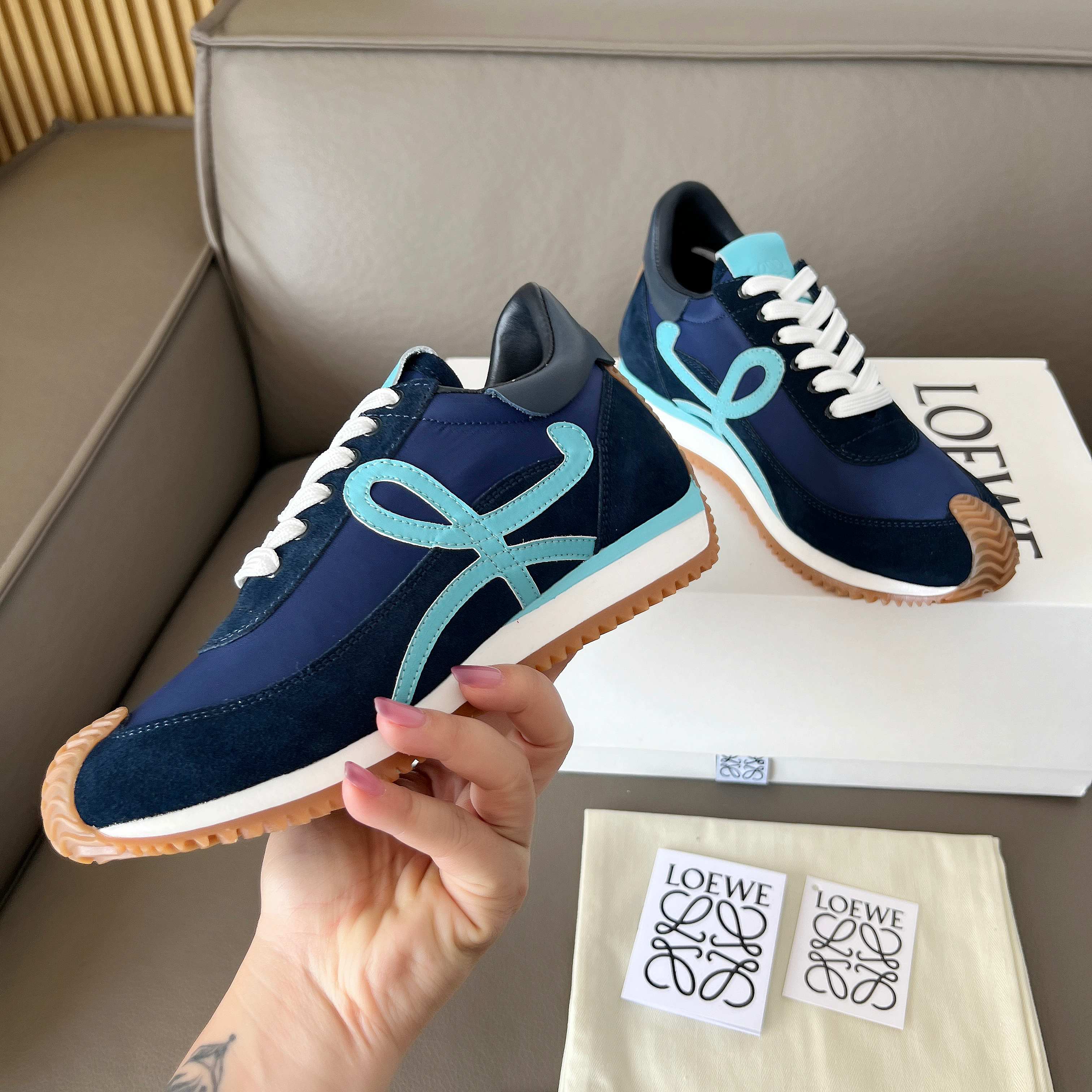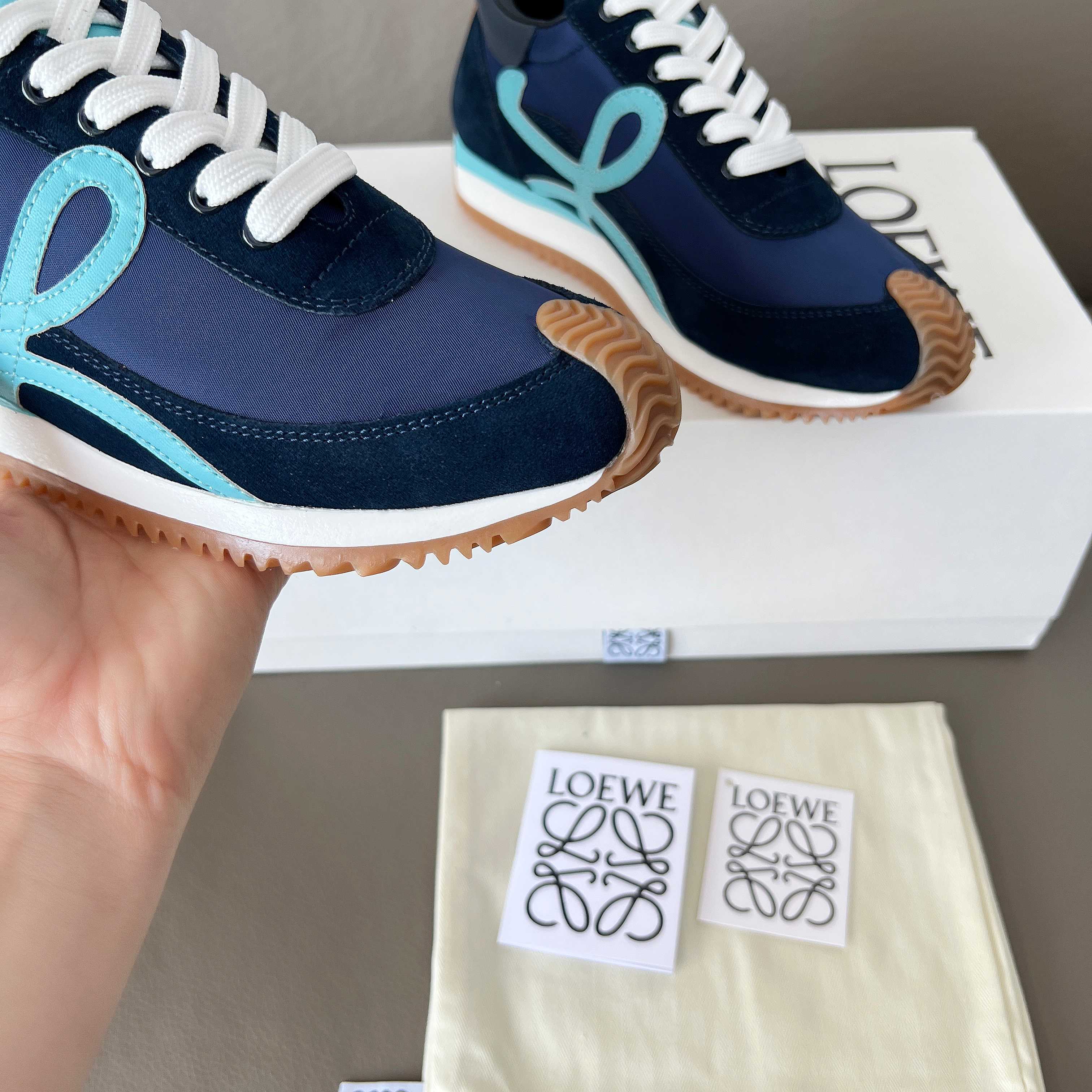 這款鞋子是AAAAA 1:1 質量(非常棒). 使用了和原版一模一樣的材料. 商標部分也保持了和Loewe一樣. 圖片拍攝是實物鞋子拍攝, 您所收到的實物保證和我們圖片一模一樣.