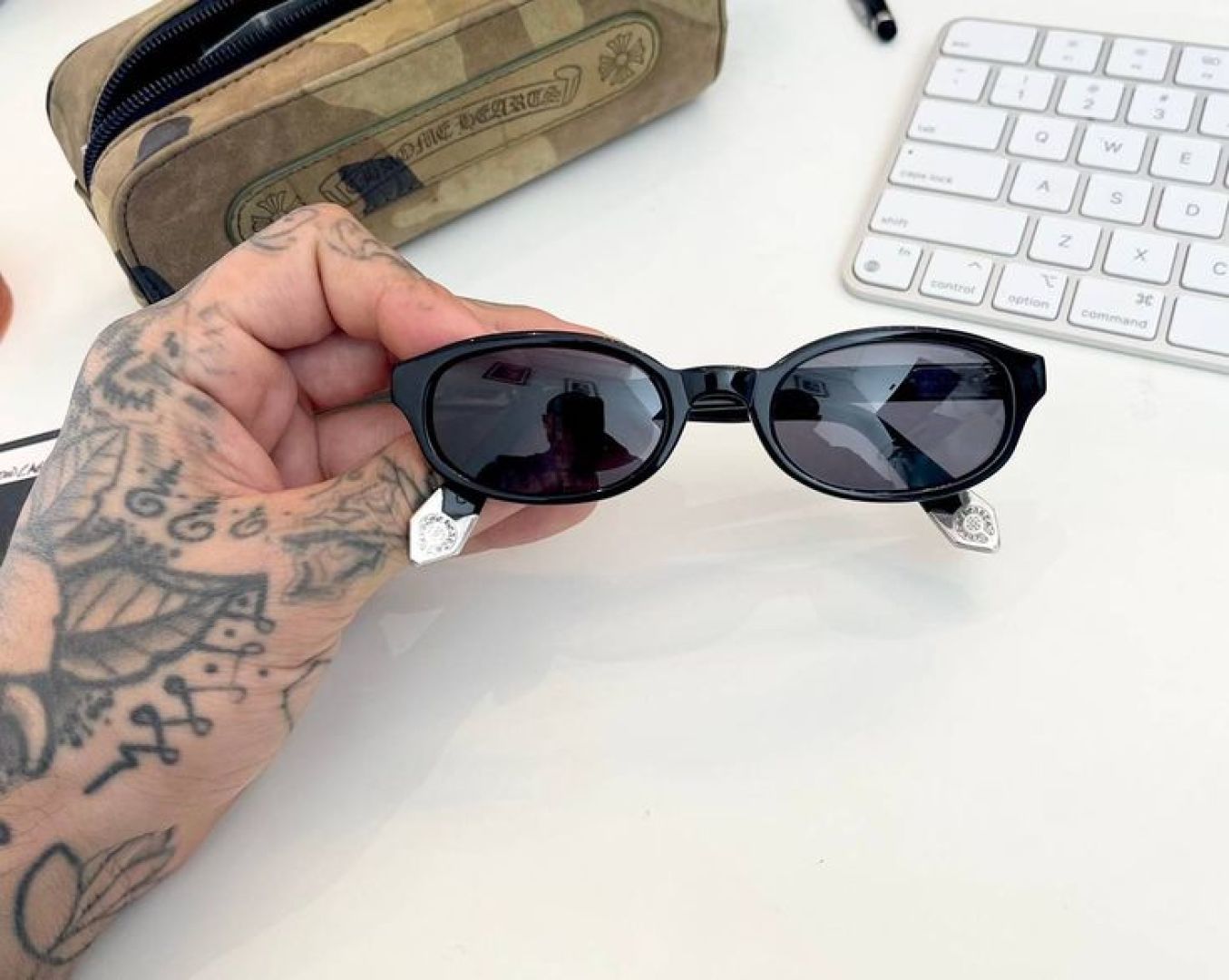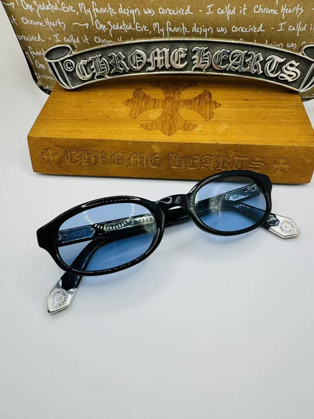 這款太陽眼鏡是AAAAA 1:1 質量(非常棒). 使用了和原版一模一樣的材料. 商標部分也保持了和鉻心/Chrome Hearts一樣. 圖片拍攝是實物太陽眼鏡拍攝, 您所收到的實物保證和我們圖片一模一樣.