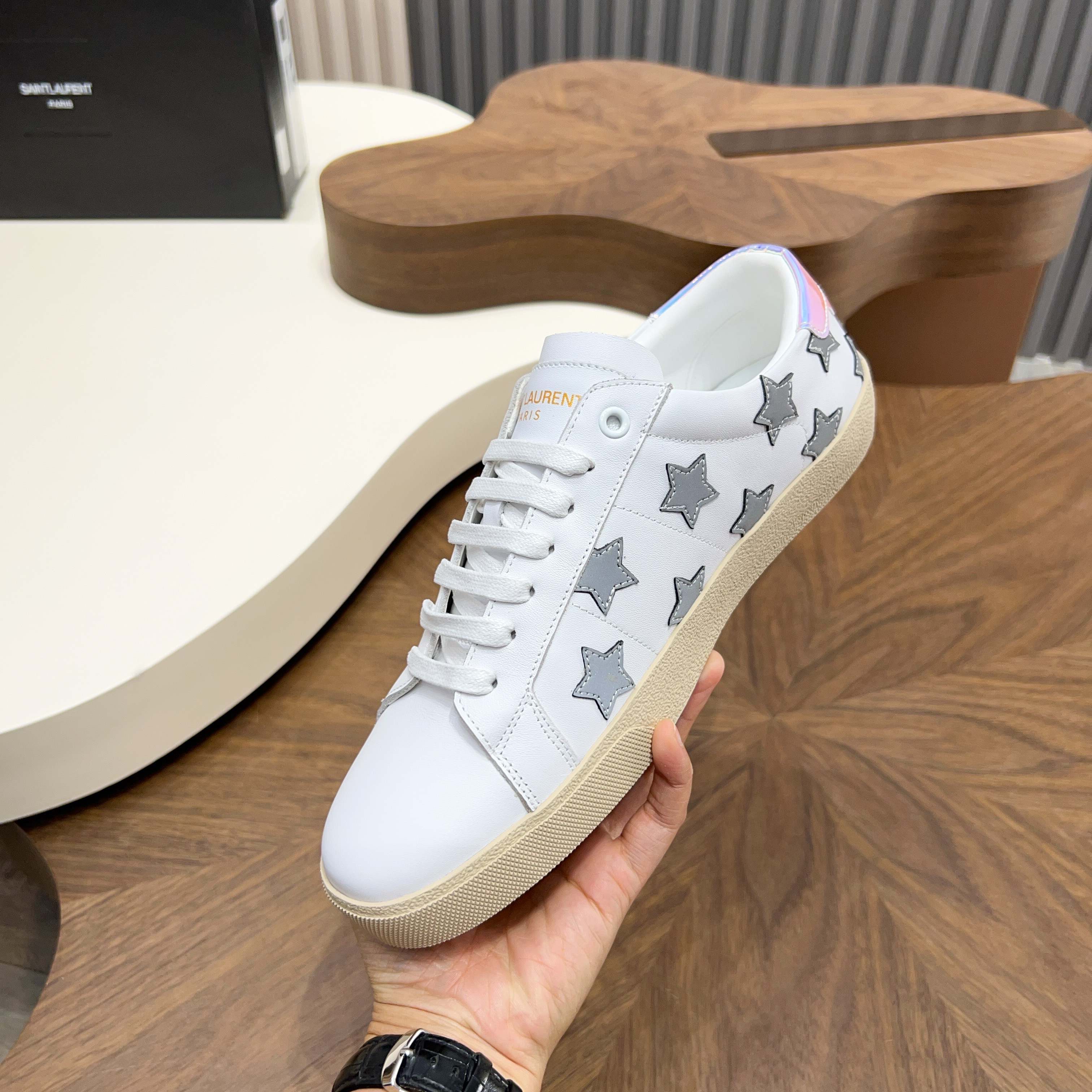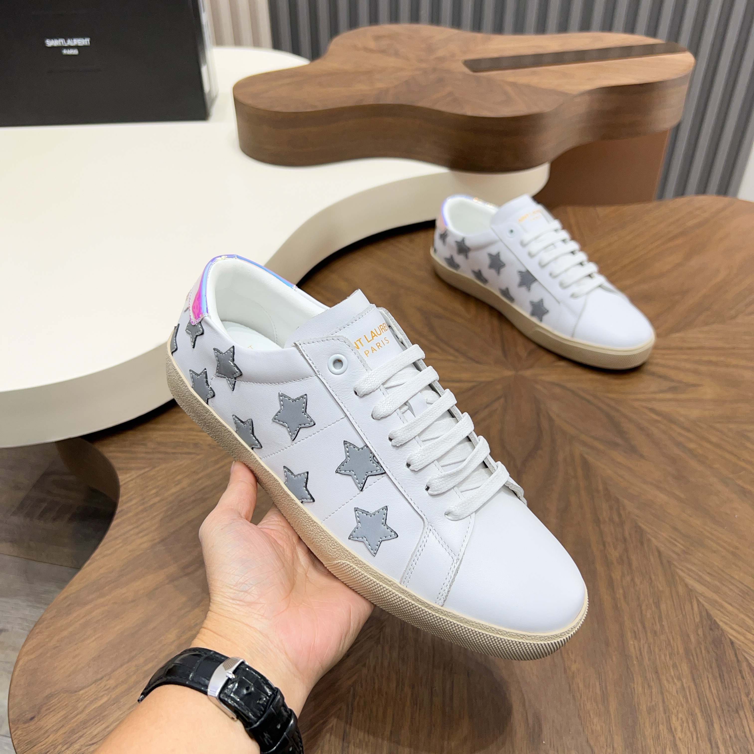 這款鞋子是AAAAA 1:1 質量(非常棒). 使用了和原版一模一樣的材料. 商標部分也保持了和聖羅蘭/Saint Laurent一樣. 圖片拍攝是實物鞋子拍攝, 您所收到的實物保證和我們圖片一模一樣.