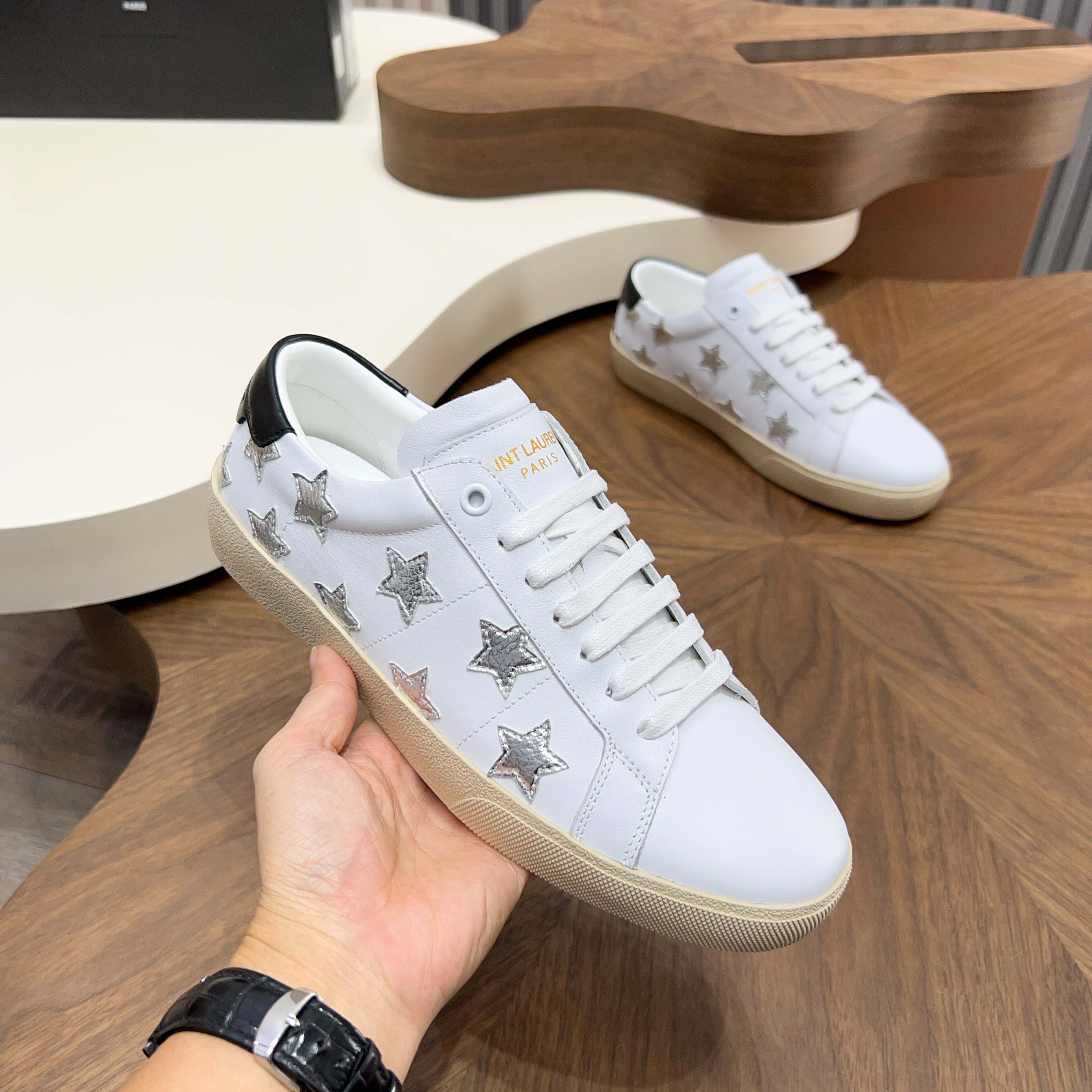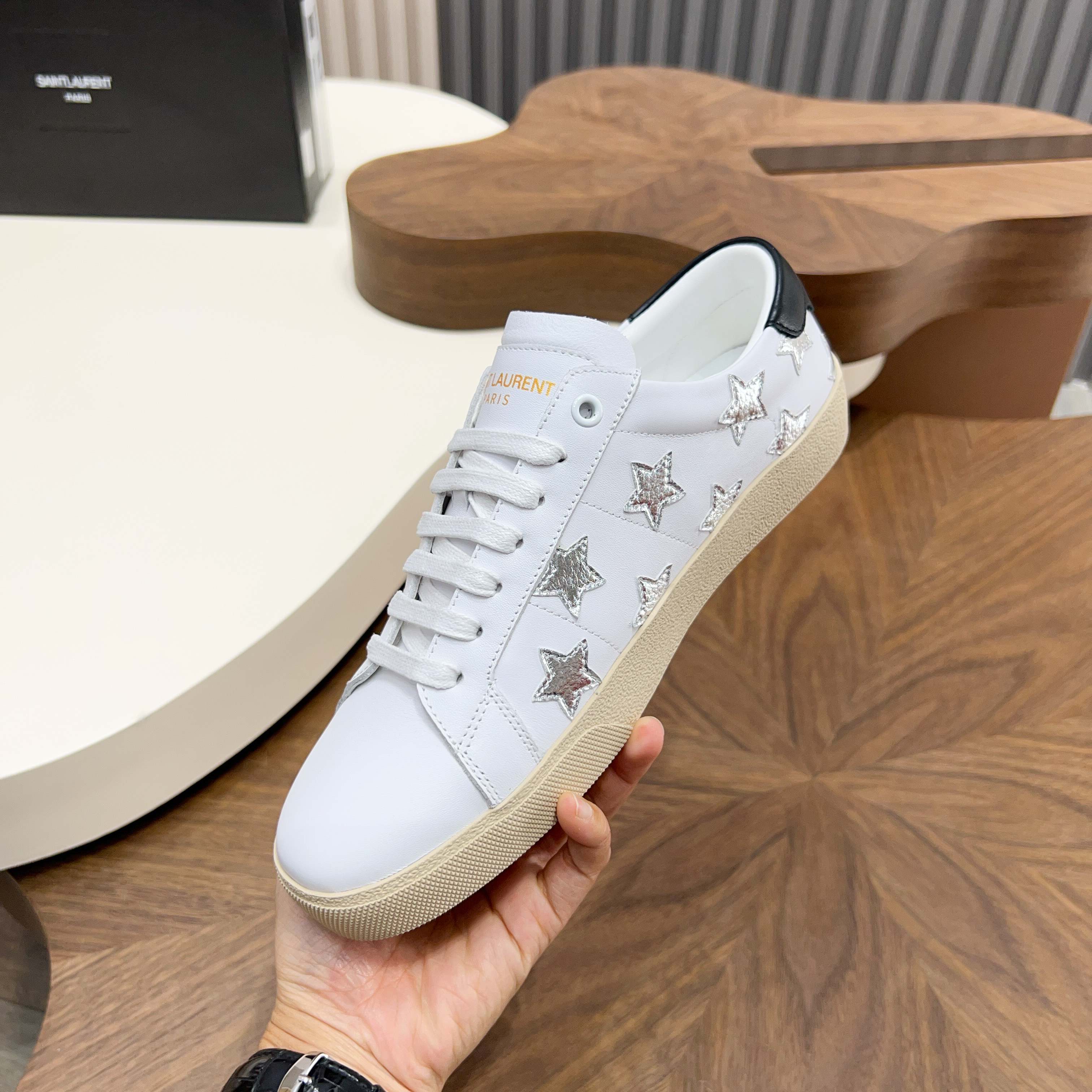這款鞋子是AAAAA 1:1 質量(非常棒). 使用了和原版一模一樣的材料. 商標部分也保持了和聖羅蘭/Saint Laurent一樣. 圖片拍攝是實物鞋子拍攝, 您所收到的實物保證和我們圖片一模一樣.