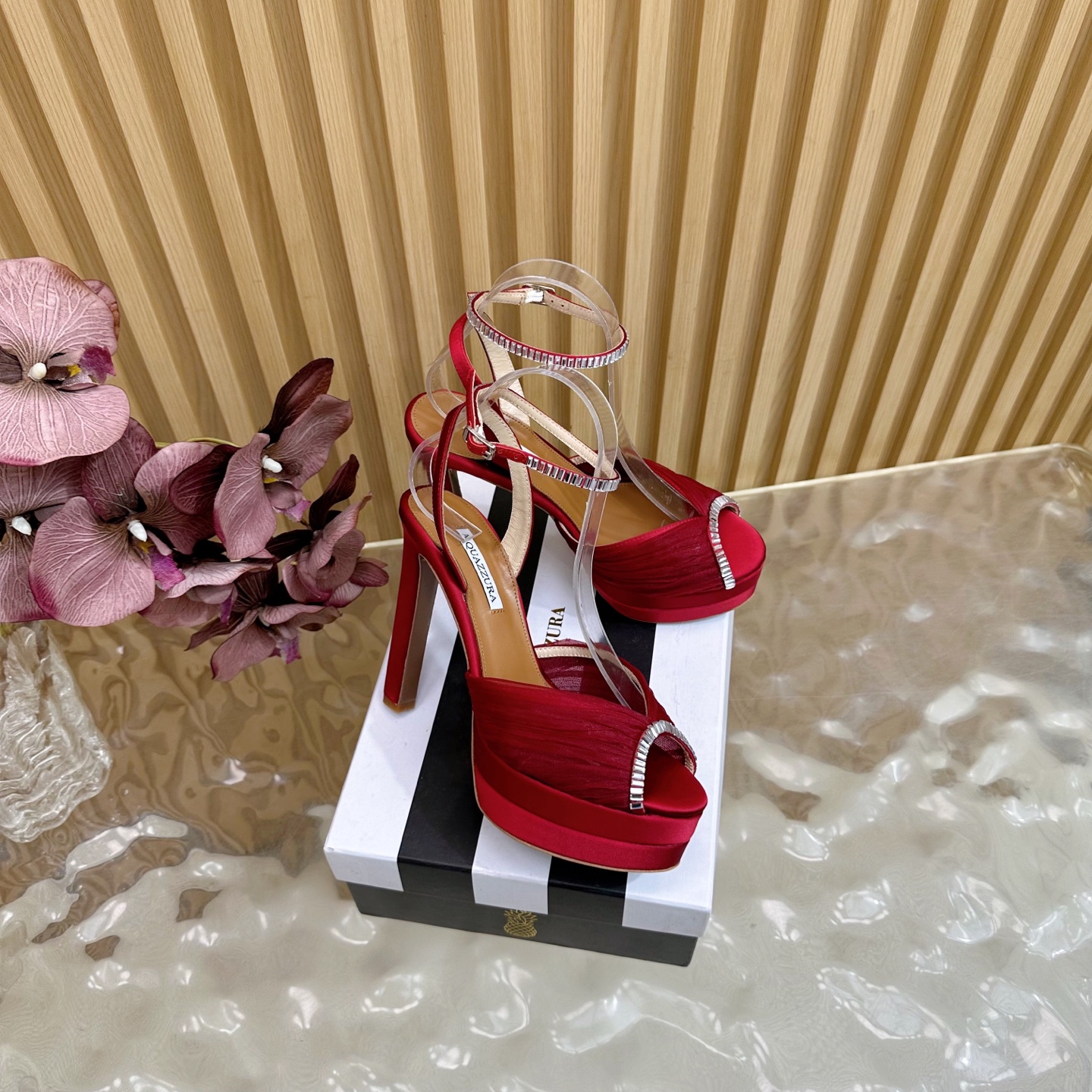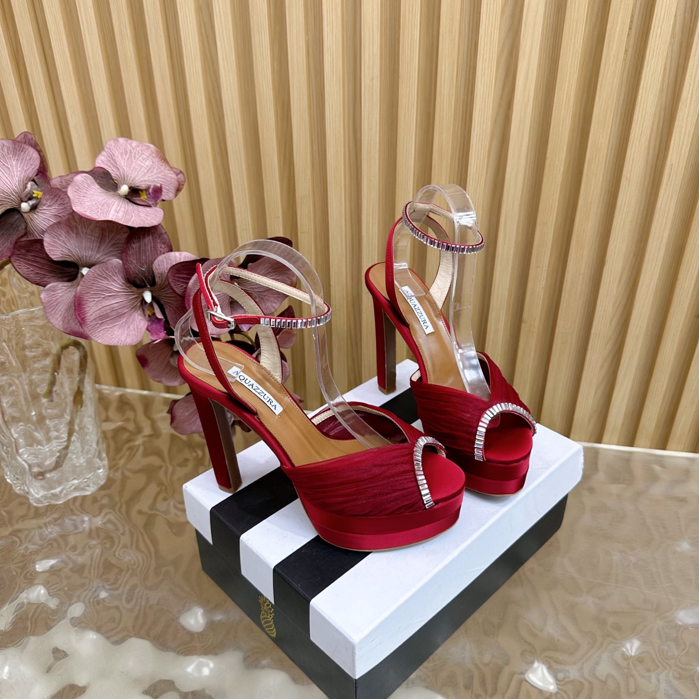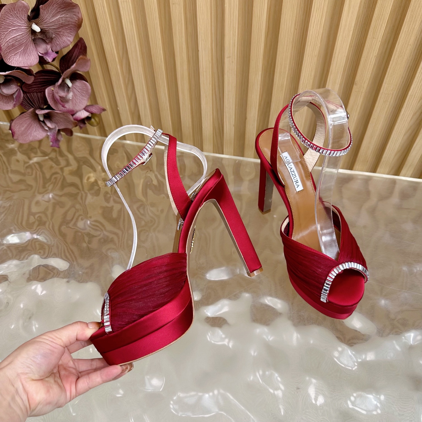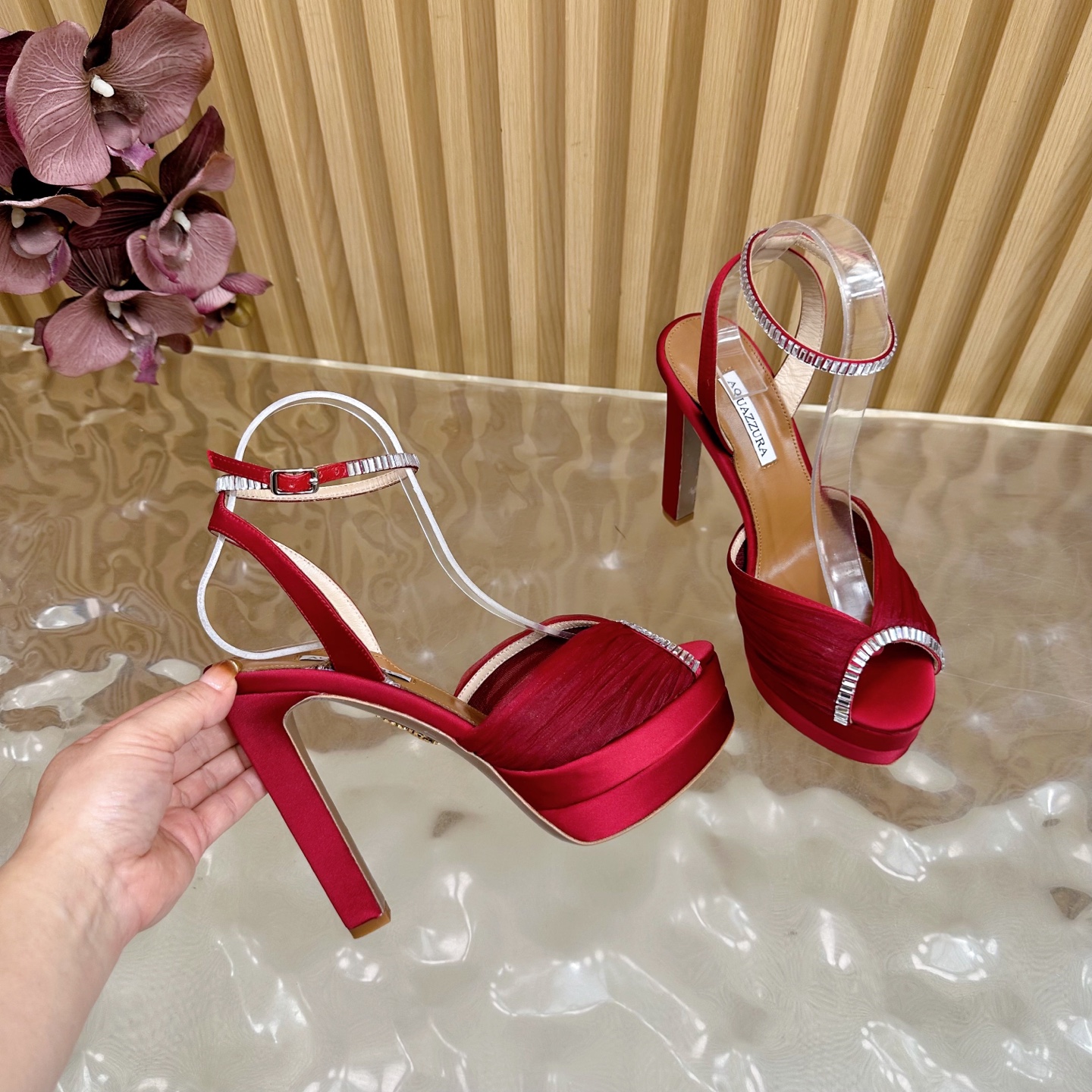 這款鞋子是AAAAA 1:1 質量(非常棒). 使用了和原版一模一樣的材料. 商標部分也保持了和Aquazzura一樣. 圖片拍攝是實物鞋子拍攝, 您所收到的實物保證和我們圖片一模一樣.