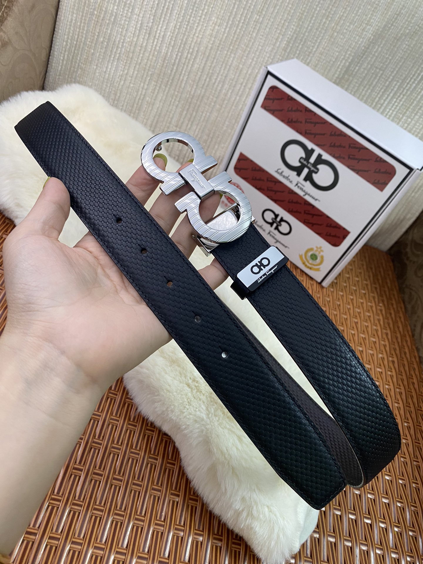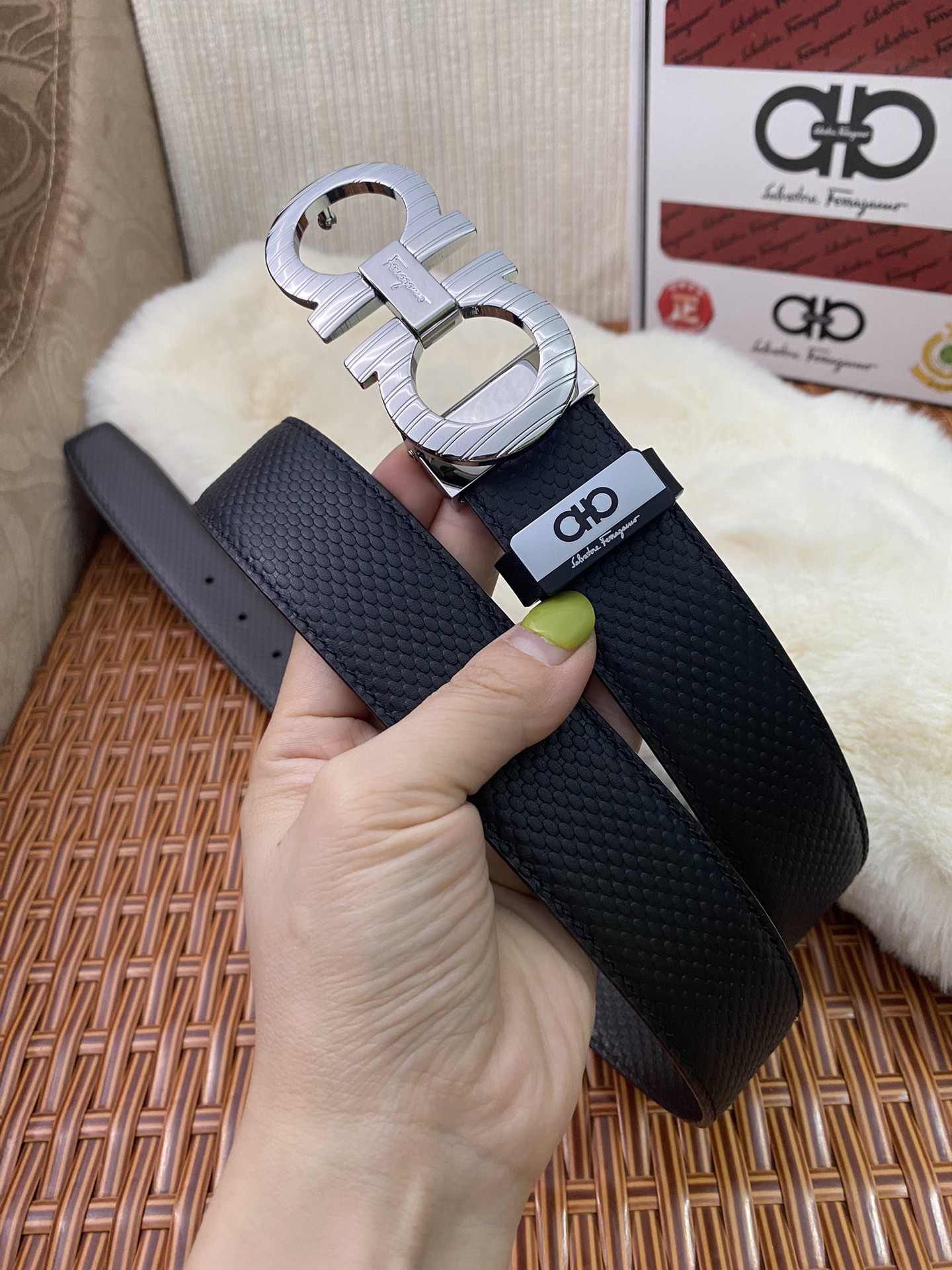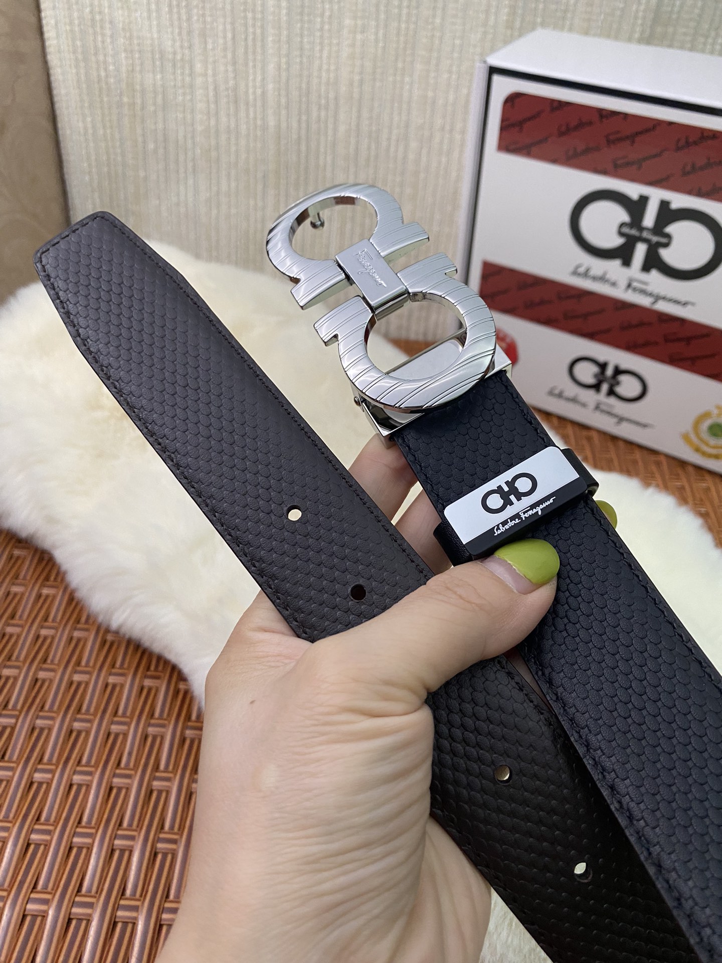 這款皮帶是AAAAA 1:1 質量(非常棒). 使用了和原版一模一樣的材料. 商標部分也保持了和菲拉格慕/Salvatore Ferragamo一樣. 圖片拍攝是實物皮帶拍攝, 您所收到的實物保證和我們圖片一模一樣.