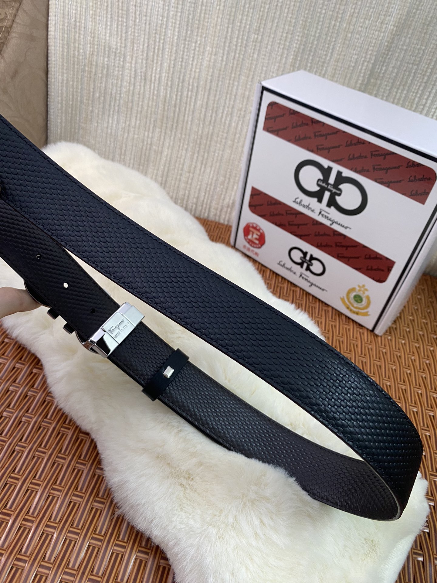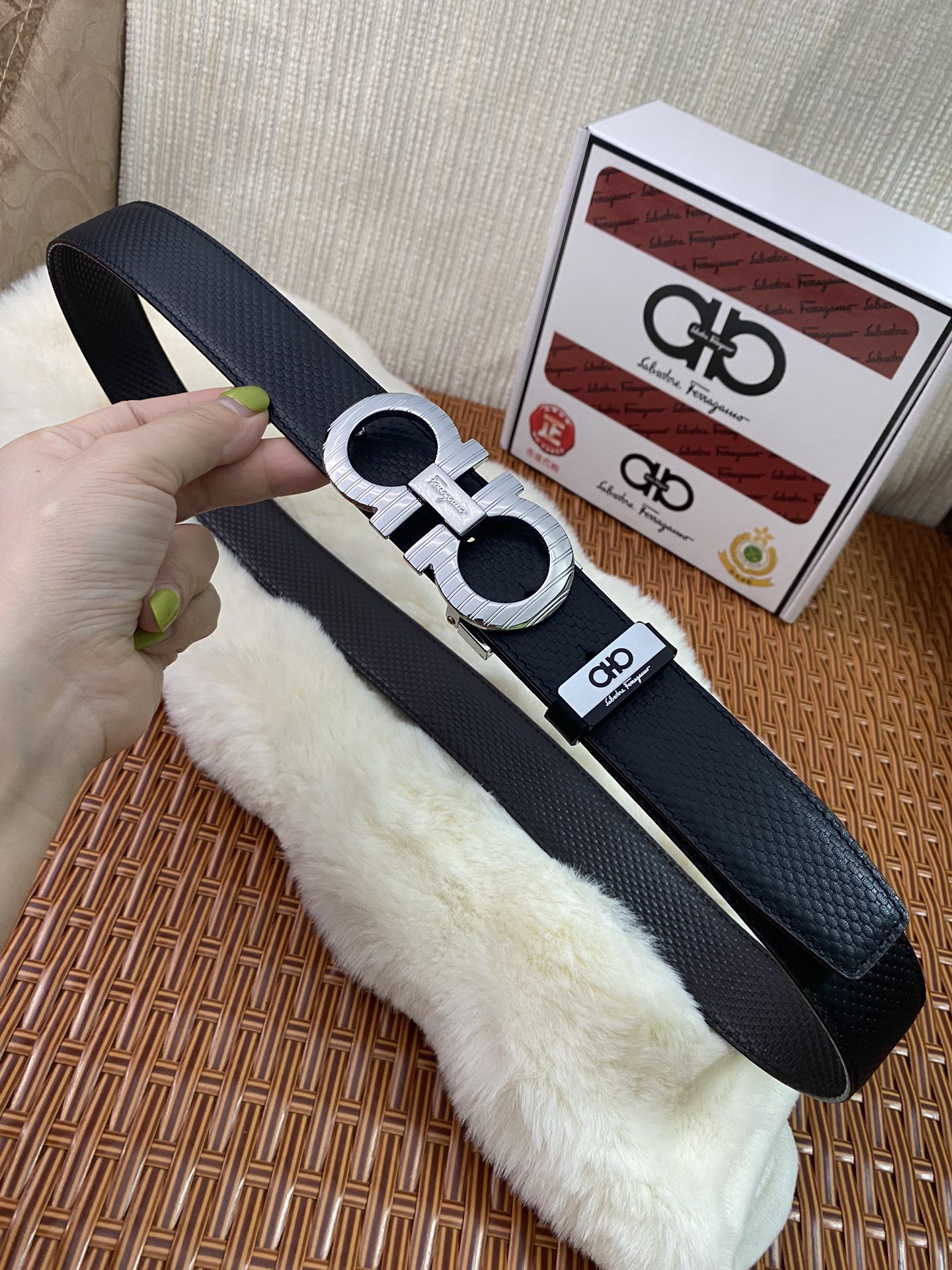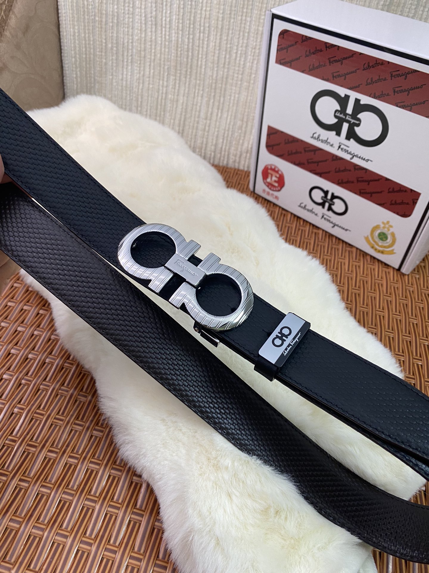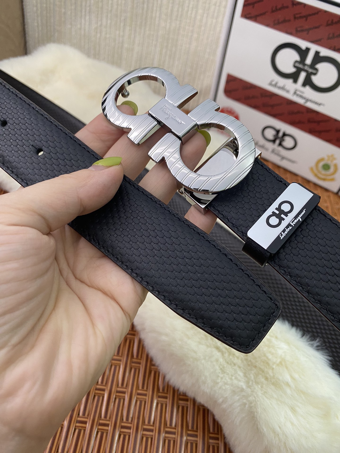 這款皮帶是AAAAA 1:1 質量(非常棒). 使用了和原版一模一樣的材料. 商標部分也保持了和菲拉格慕/Salvatore Ferragamo一樣. 圖片拍攝是實物皮帶拍攝, 您所收到的實物保證和我們圖片一模一樣.