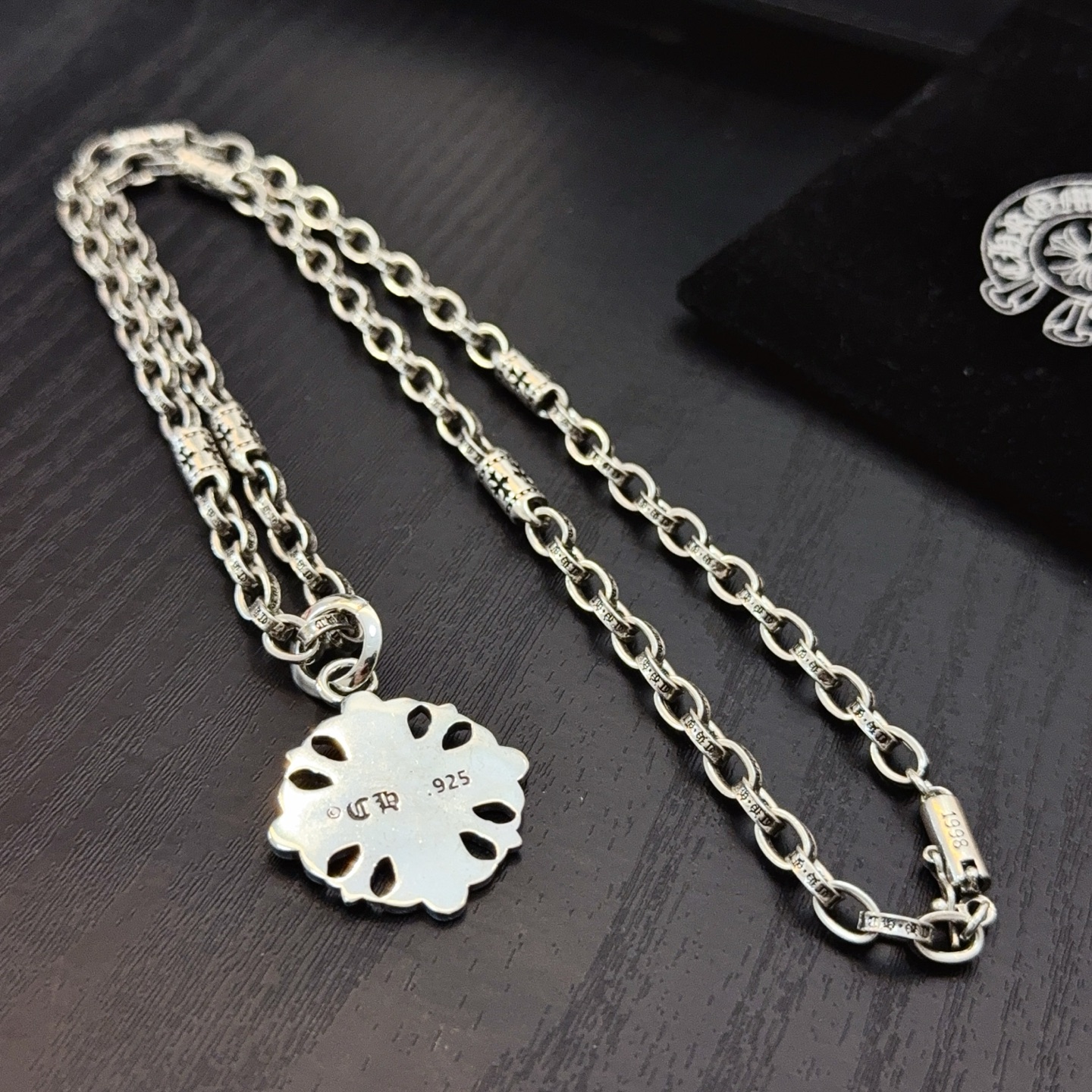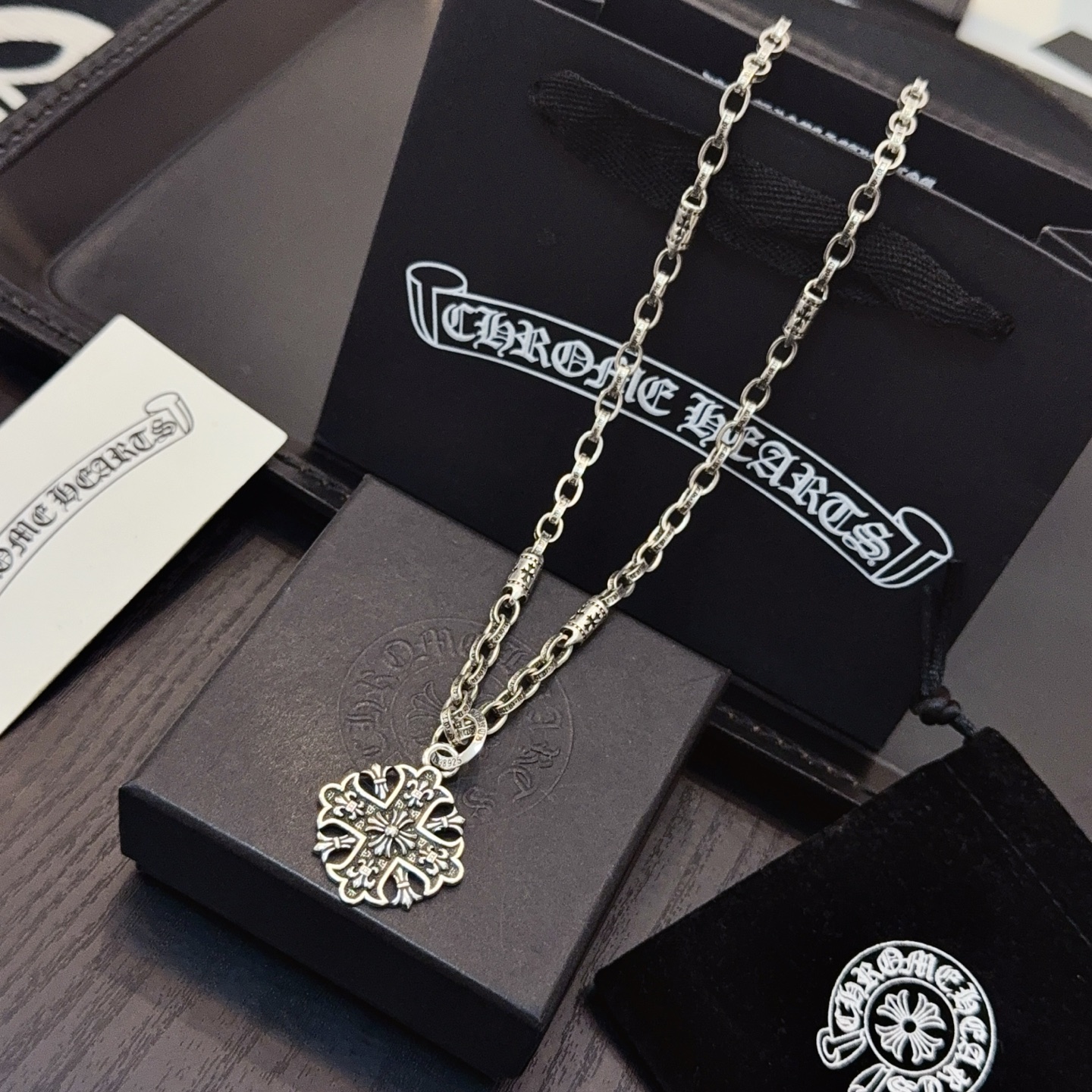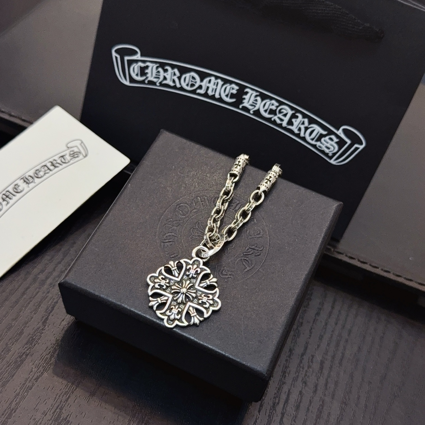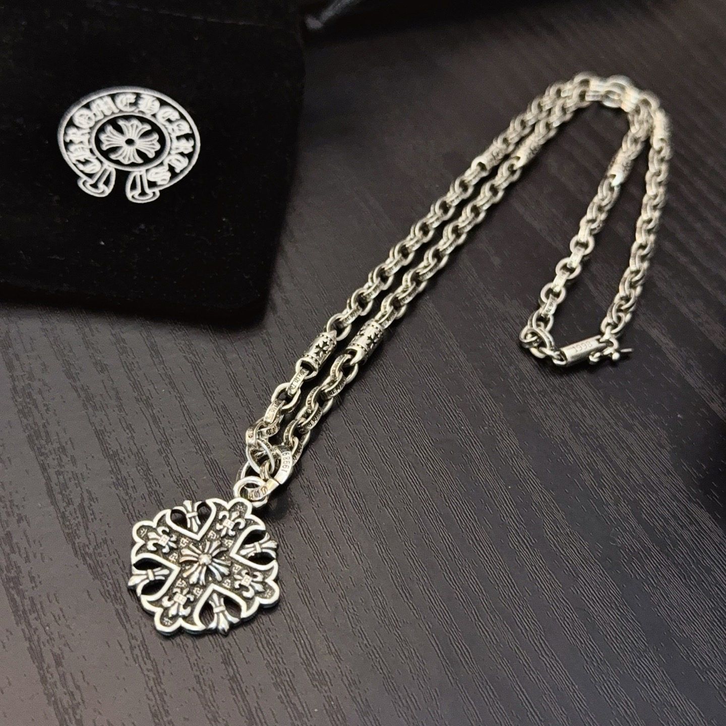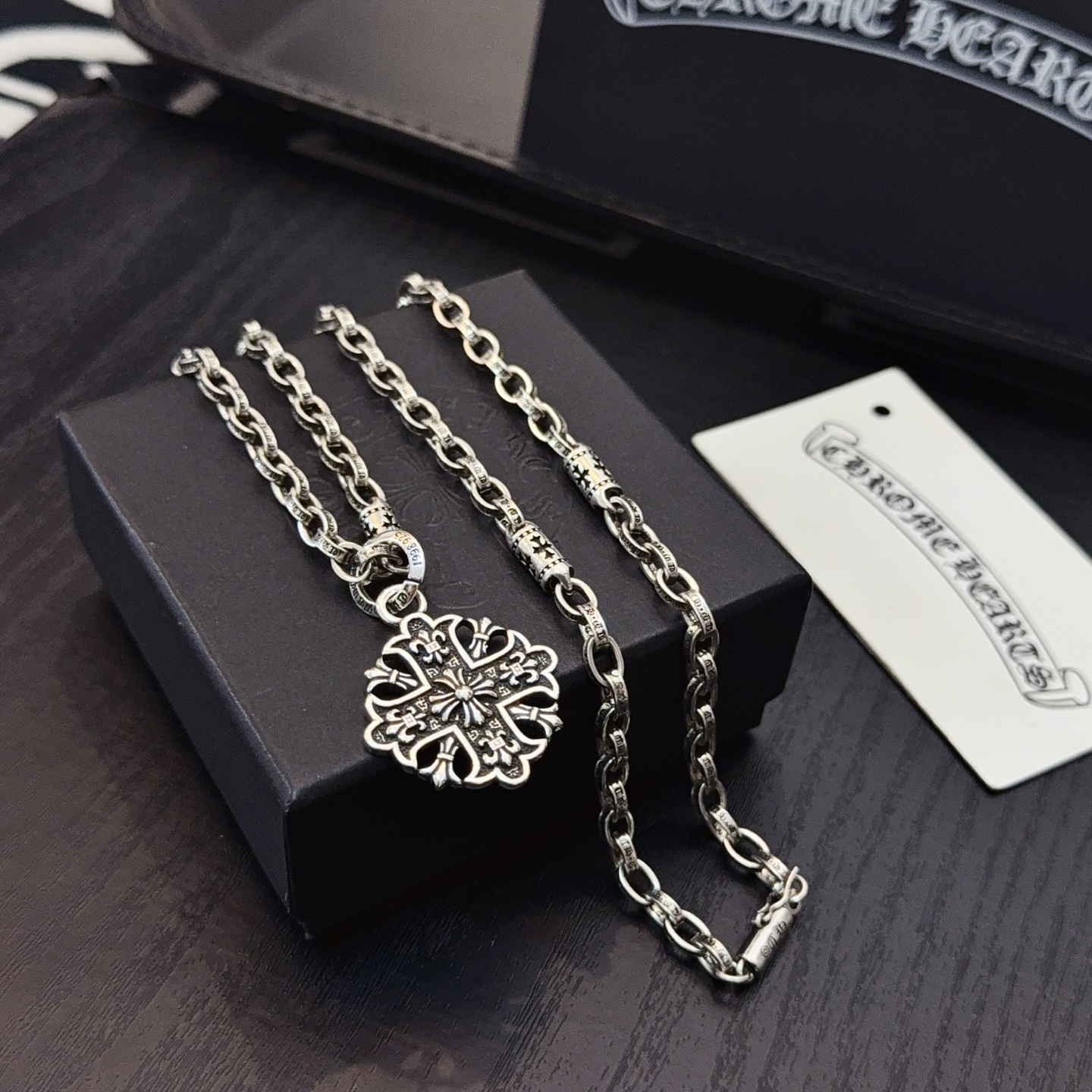 這款首飾是AAAAA 1:1 質量(非常棒). 使用了和原版一模一樣的材料. 商標部分也保持了和鉻心/Chrome Hearts一樣. 圖片拍攝是實物首飾拍攝, 您所收到的實物保證和我們圖片一模一樣.