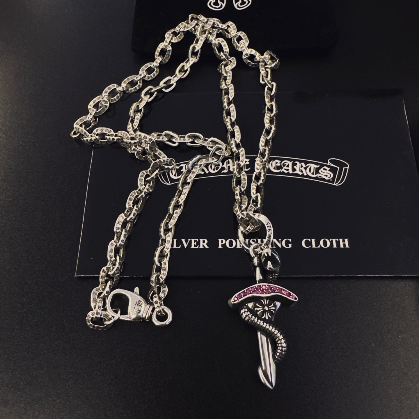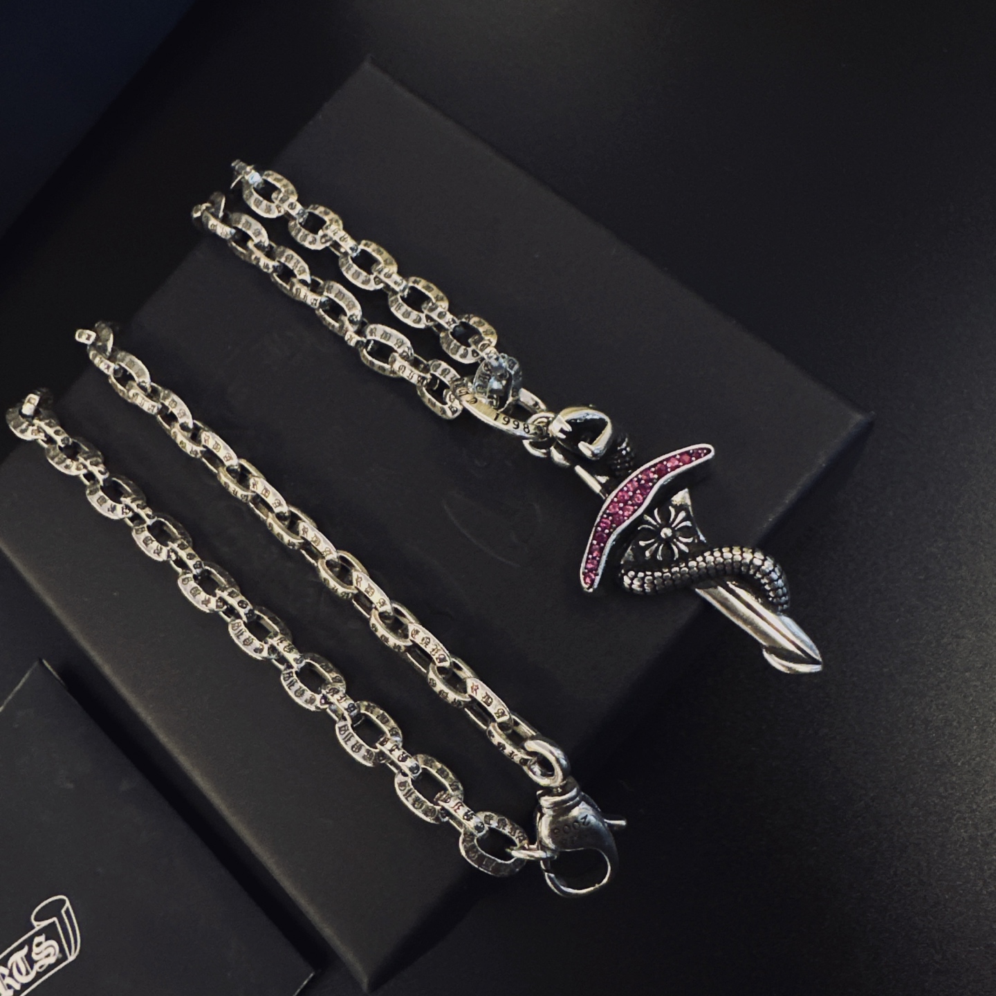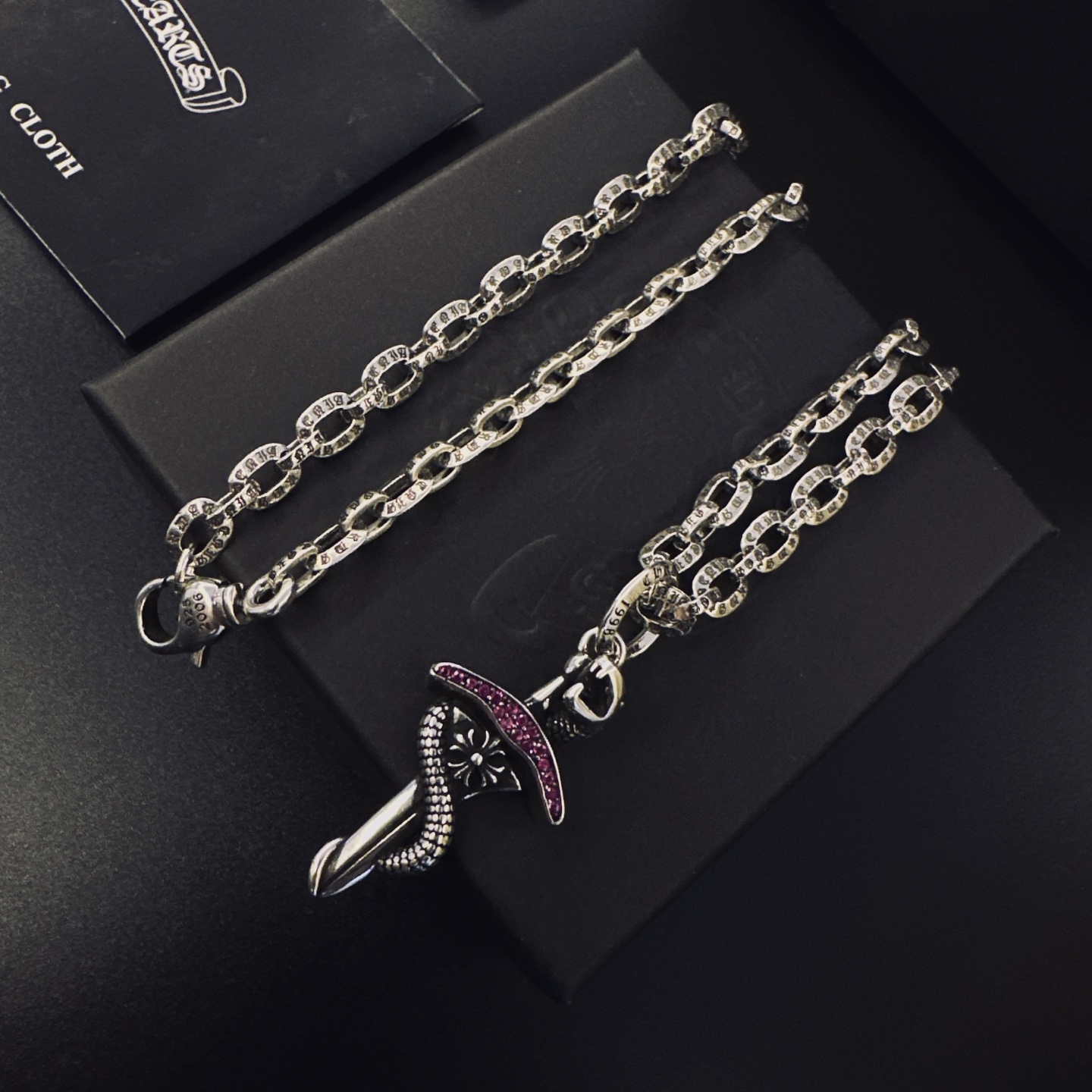 這款首飾是AAAAA 1:1 質量(非常棒). 使用了和原版一模一樣的材料. 商標部分也保持了和鉻心/Chrome Hearts一樣. 圖片拍攝是實物首飾拍攝, 您所收到的實物保證和我們圖片一模一樣.