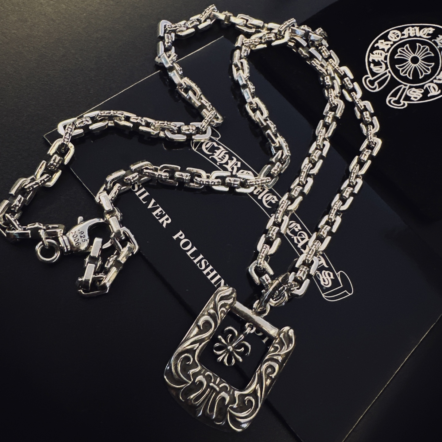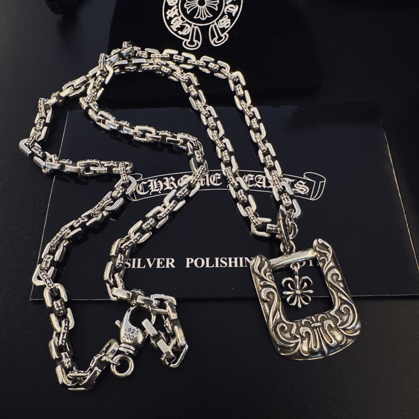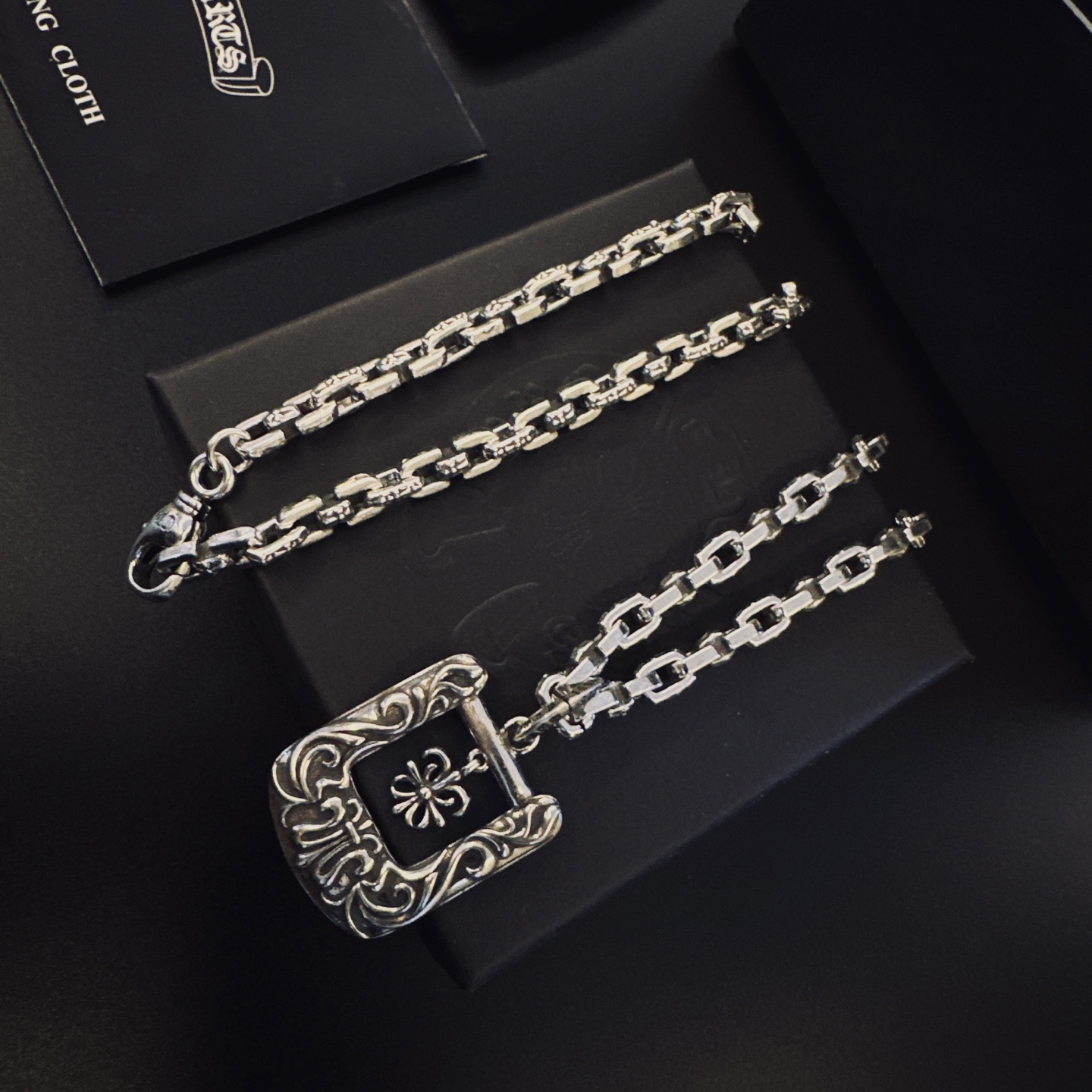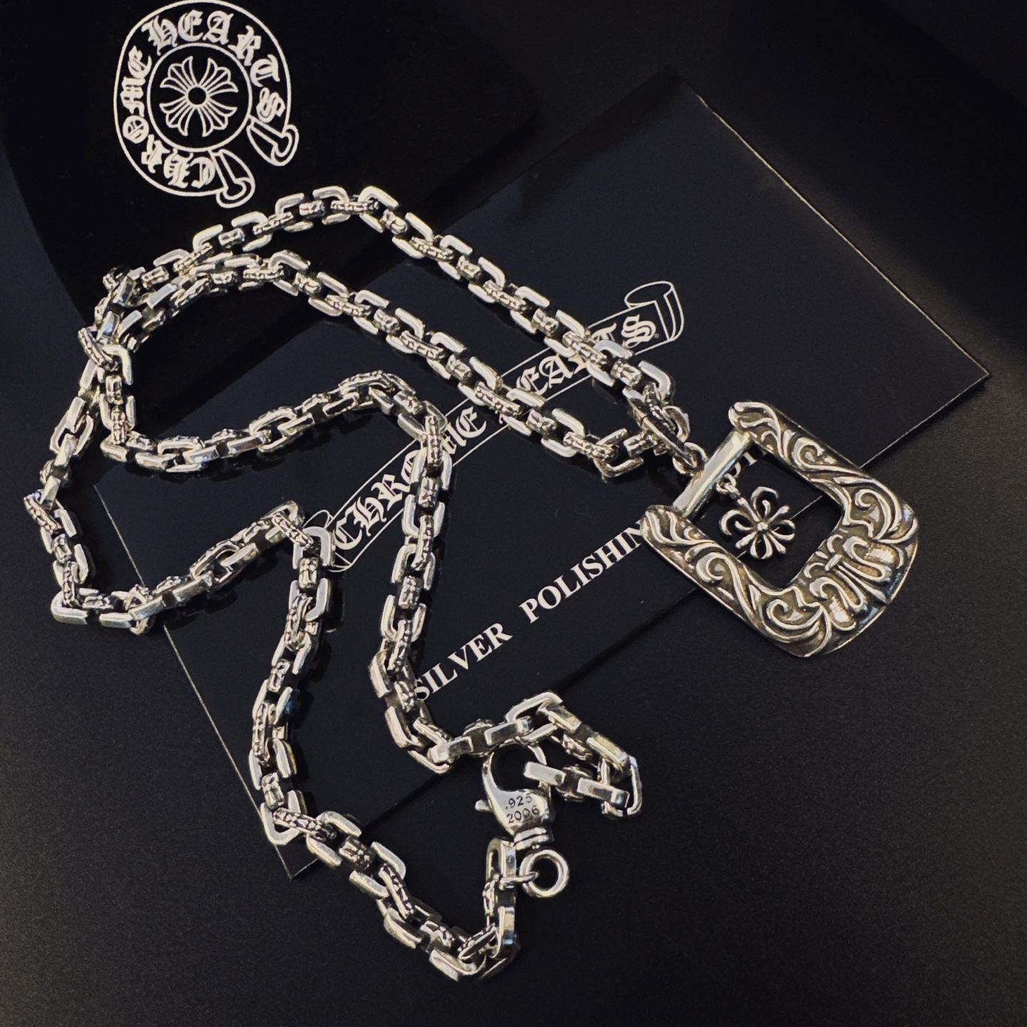 這款首飾是AAAAA 1:1 質量(非常棒). 使用了和原版一模一樣的材料. 商標部分也保持了和鉻心/Chrome Hearts一樣. 圖片拍攝是實物首飾拍攝, 您所收到的實物保證和我們圖片一模一樣.