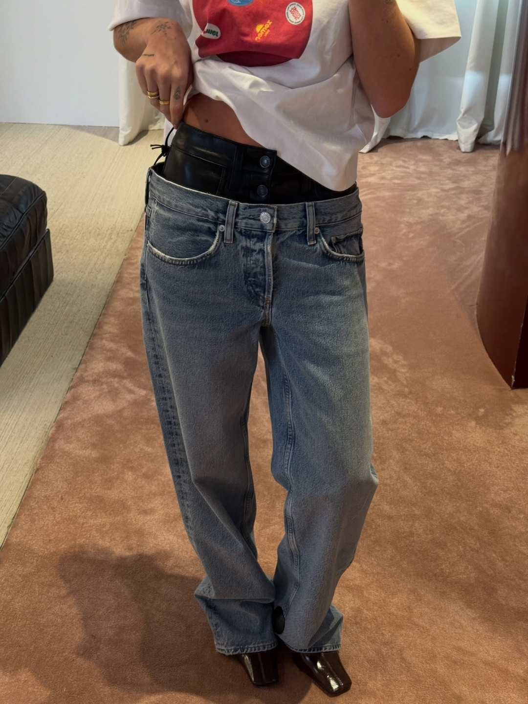 這款衣服是AAAAA 1:1 質量(非常棒). 使用了和原版一模一樣的材料. 商標部分也保持了和AGOLDE一樣. 圖片拍攝是實物衣服拍攝, 您所收到的實物保證和我們圖片一模一樣.
