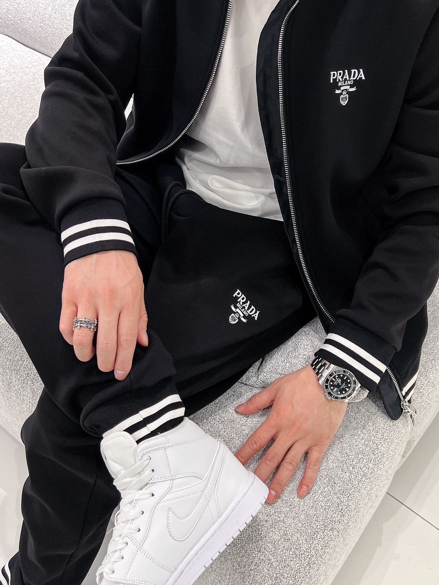 這款衣服是AAAAA 1:1 質量(非常棒). 使用了和原版一模一樣的材料. 商標部分也保持了和普拉達/Prada一樣. 圖片拍攝是實物衣服拍攝, 您所收到的實物保證和我們圖片一模一樣.