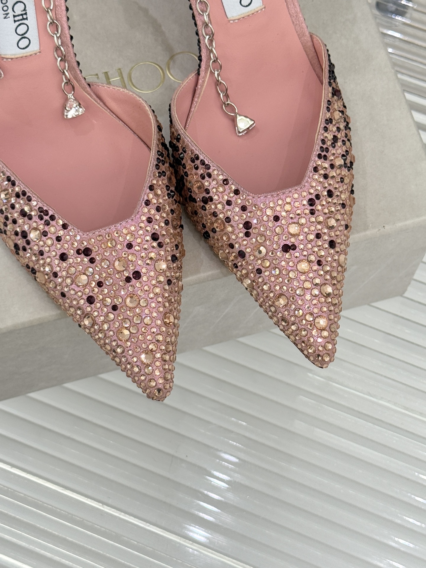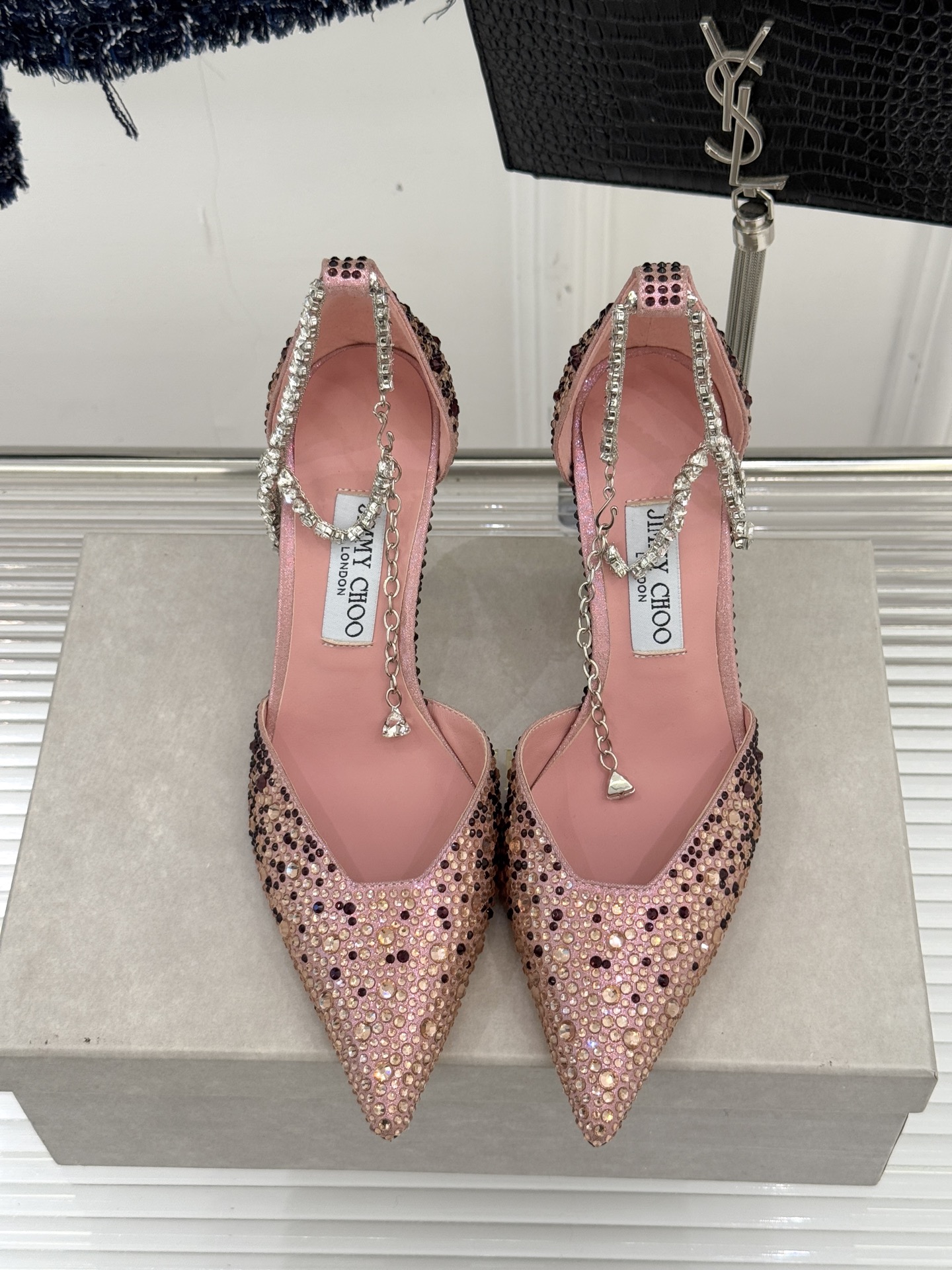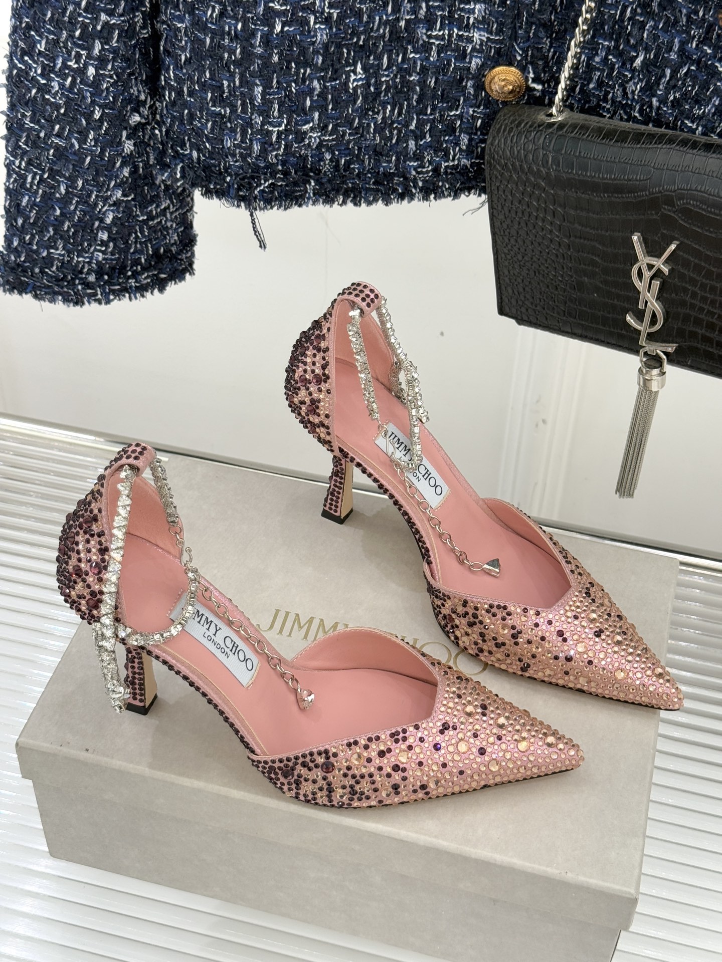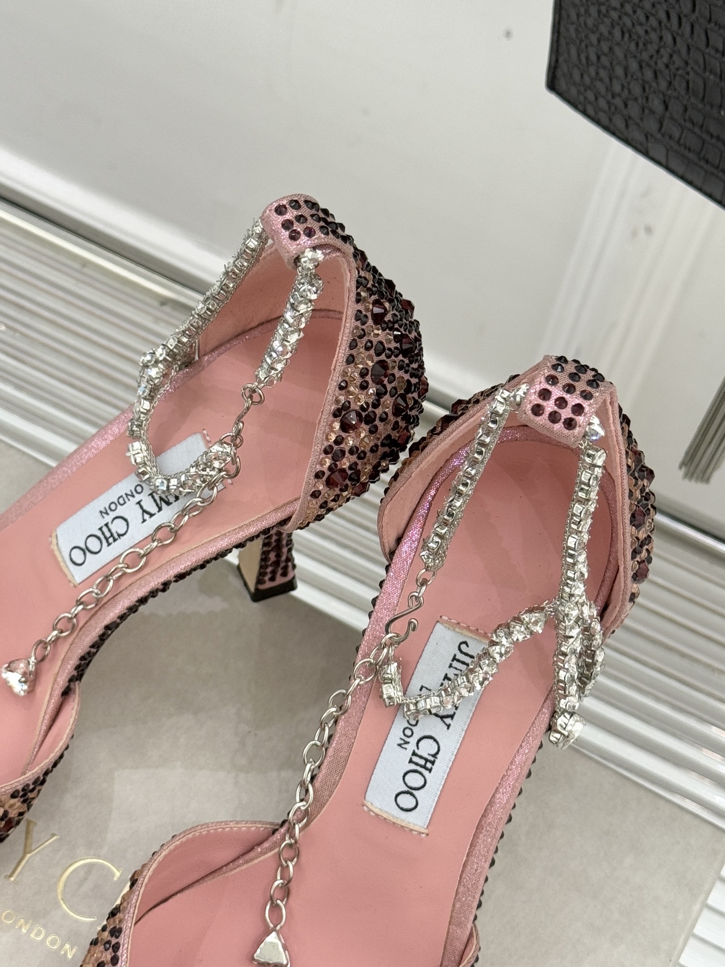 這款鞋子是AAAAA 1:1 質量(非常棒). 使用了和原版一模一樣的材料. 商標部分也保持了和吉米喬/JIMMY CHOO一樣. 圖片拍攝是實物鞋子拍攝, 您所收到的實物保證和我們圖片一模一樣.